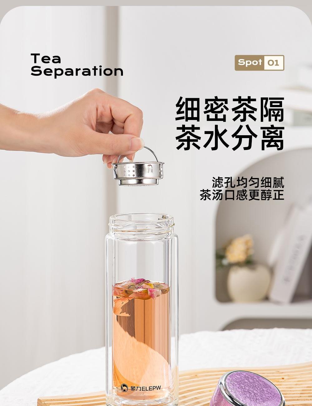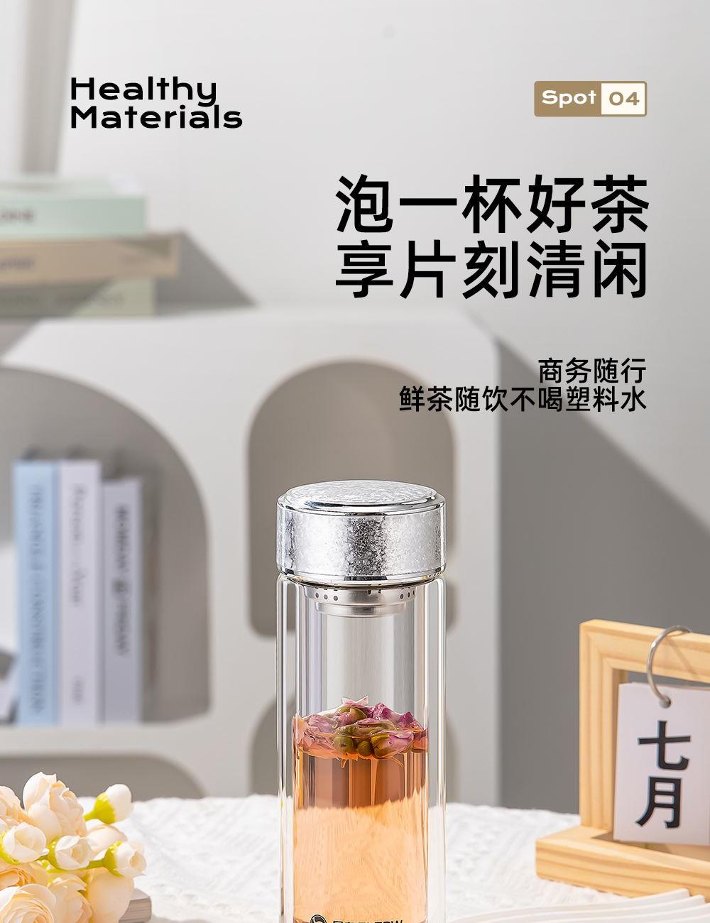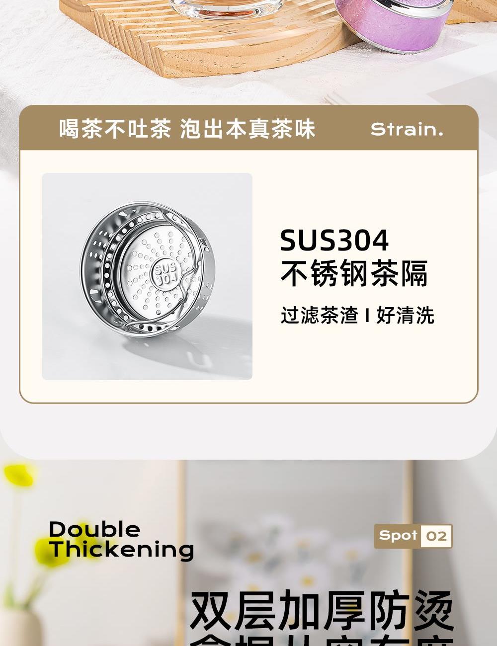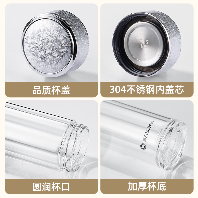 杯盖采用304不锈钢内芯。 杯体采用双层高硼硅玻璃,杯底手工加厚烧制一体成型。