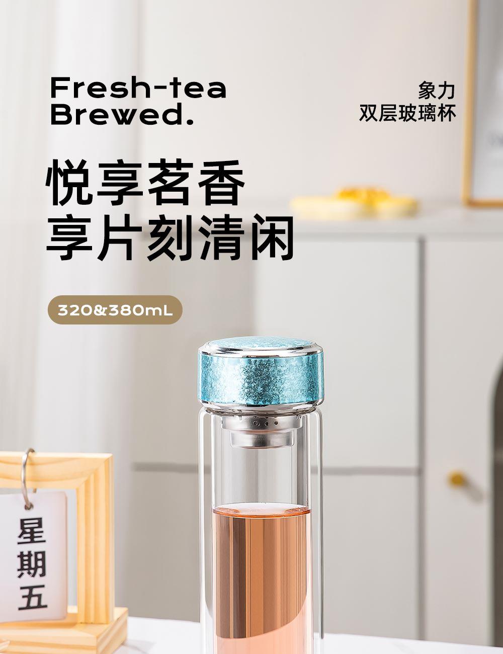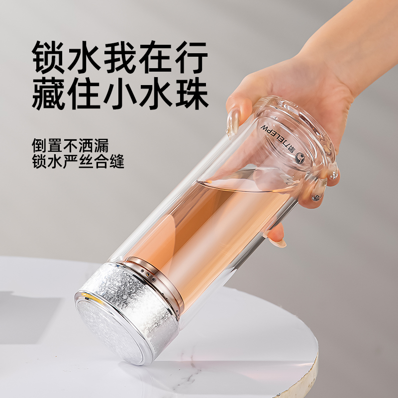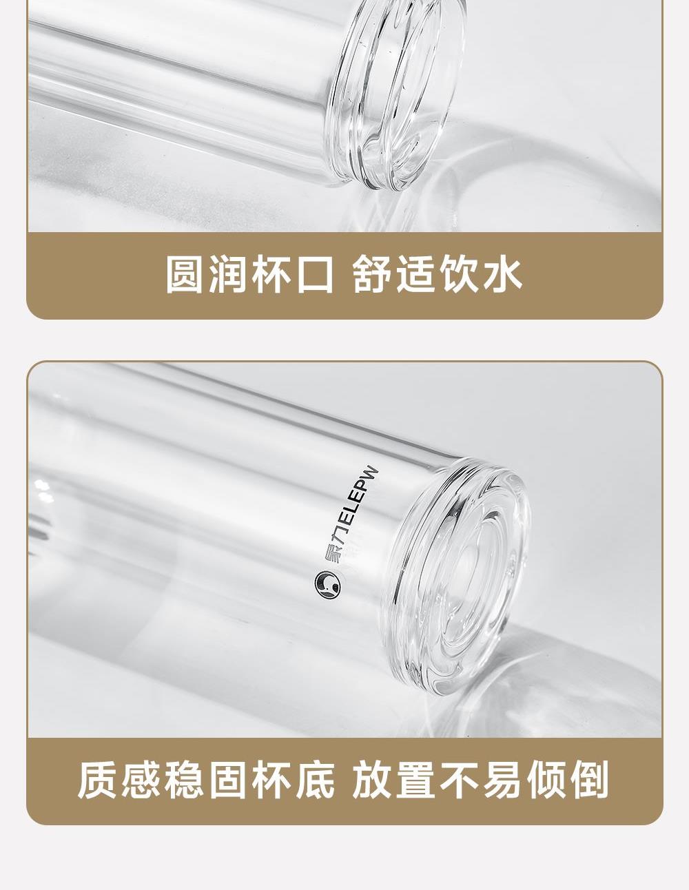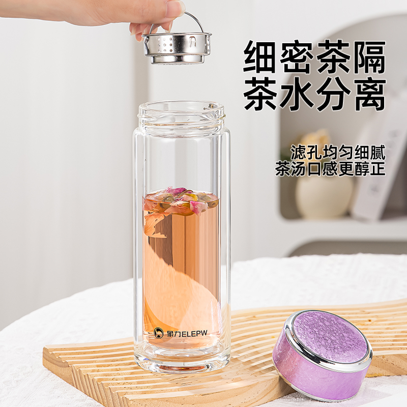 杯盖采用304不锈钢内芯。 杯体采用双层高硼硅玻璃,杯底手工加厚烧制一体成型。