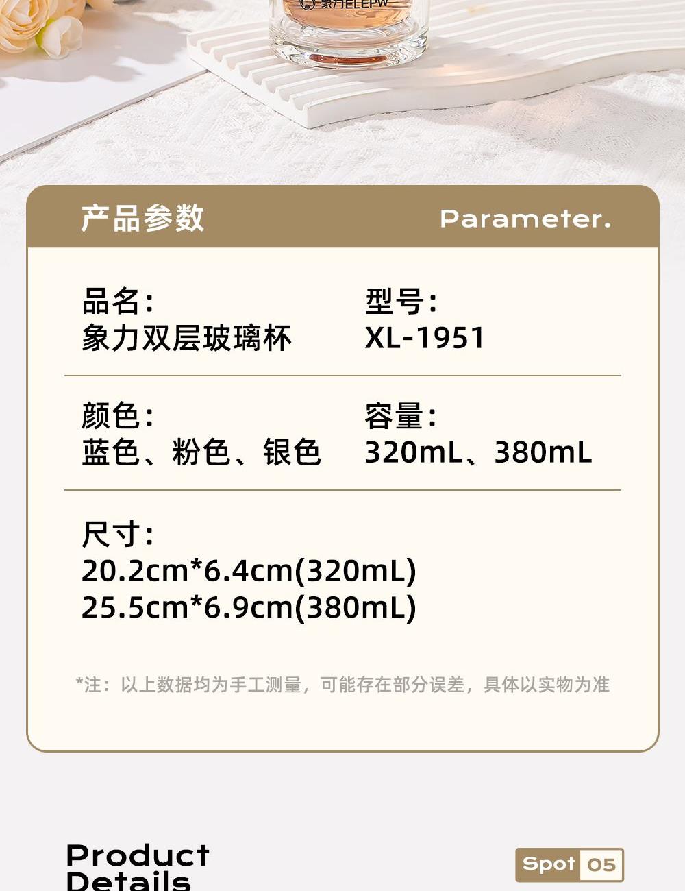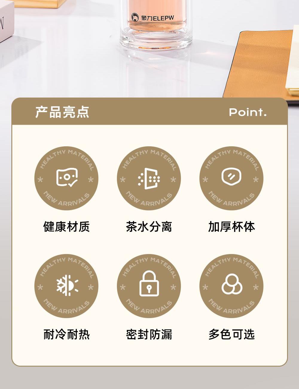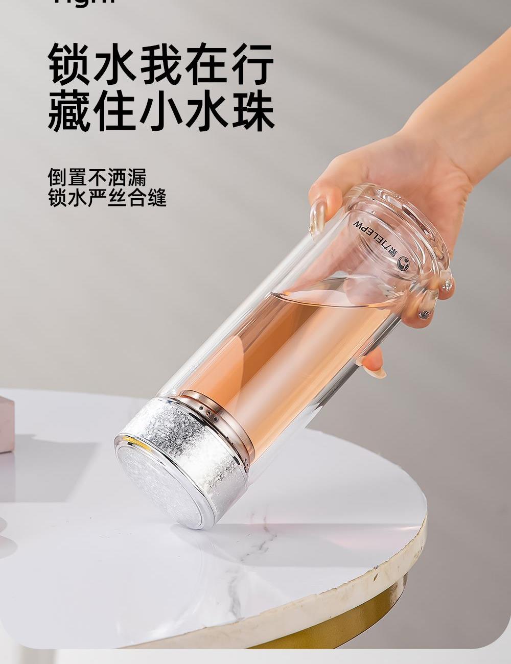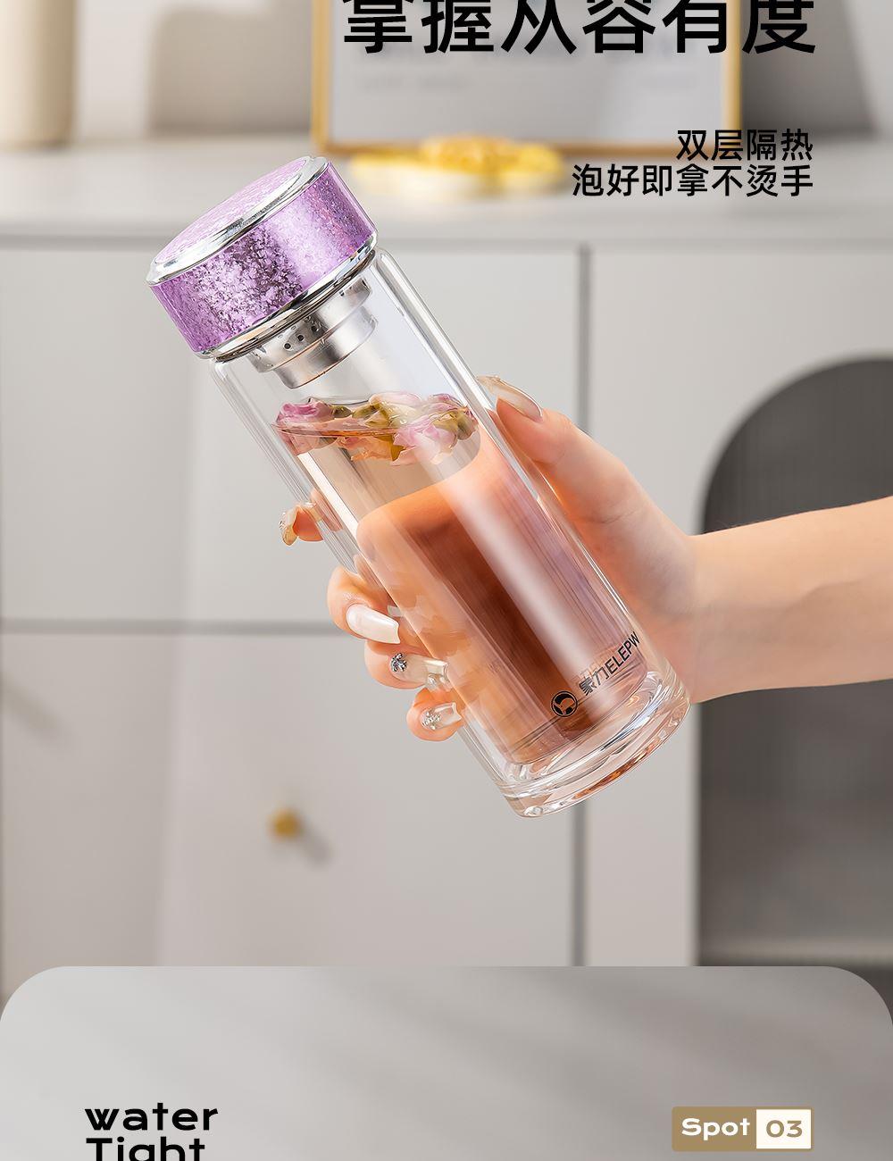 杯盖采用304不锈钢内芯。 杯体采用双层高硼硅玻璃,杯底手工加厚烧制一体成型。