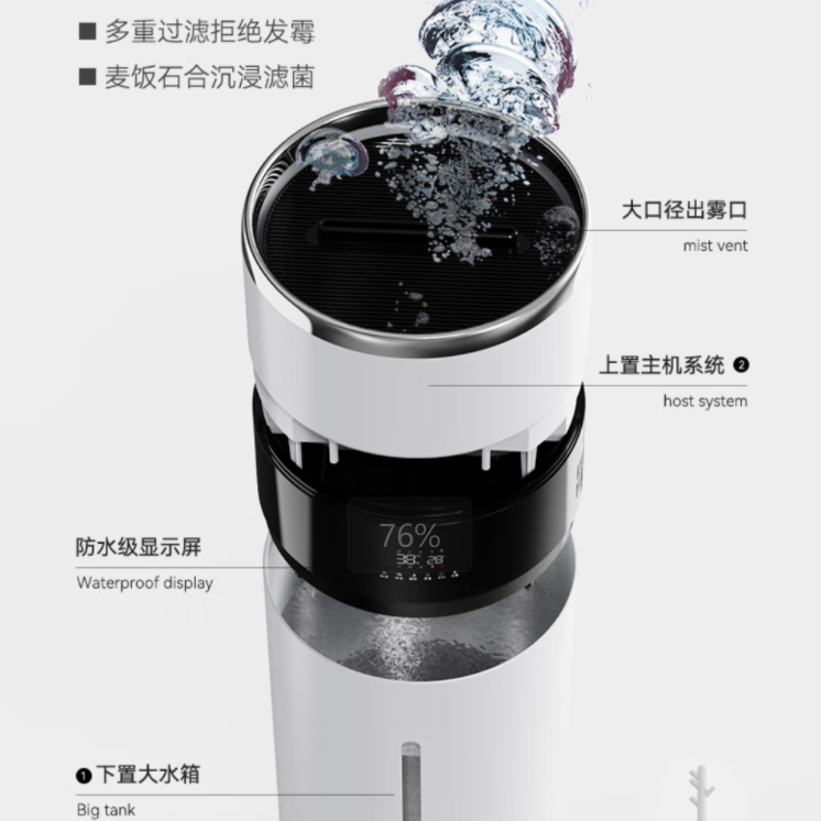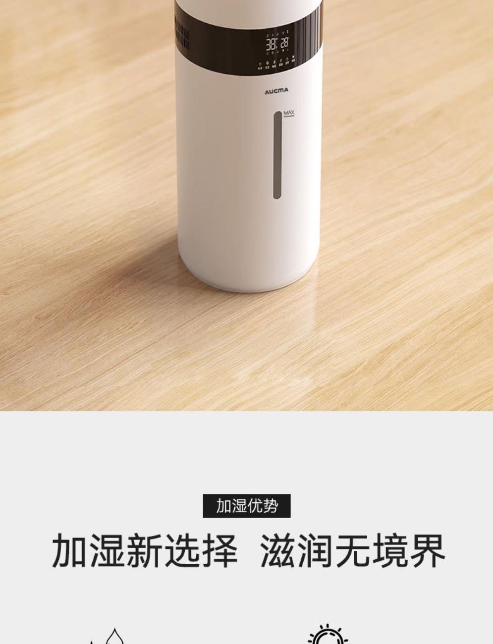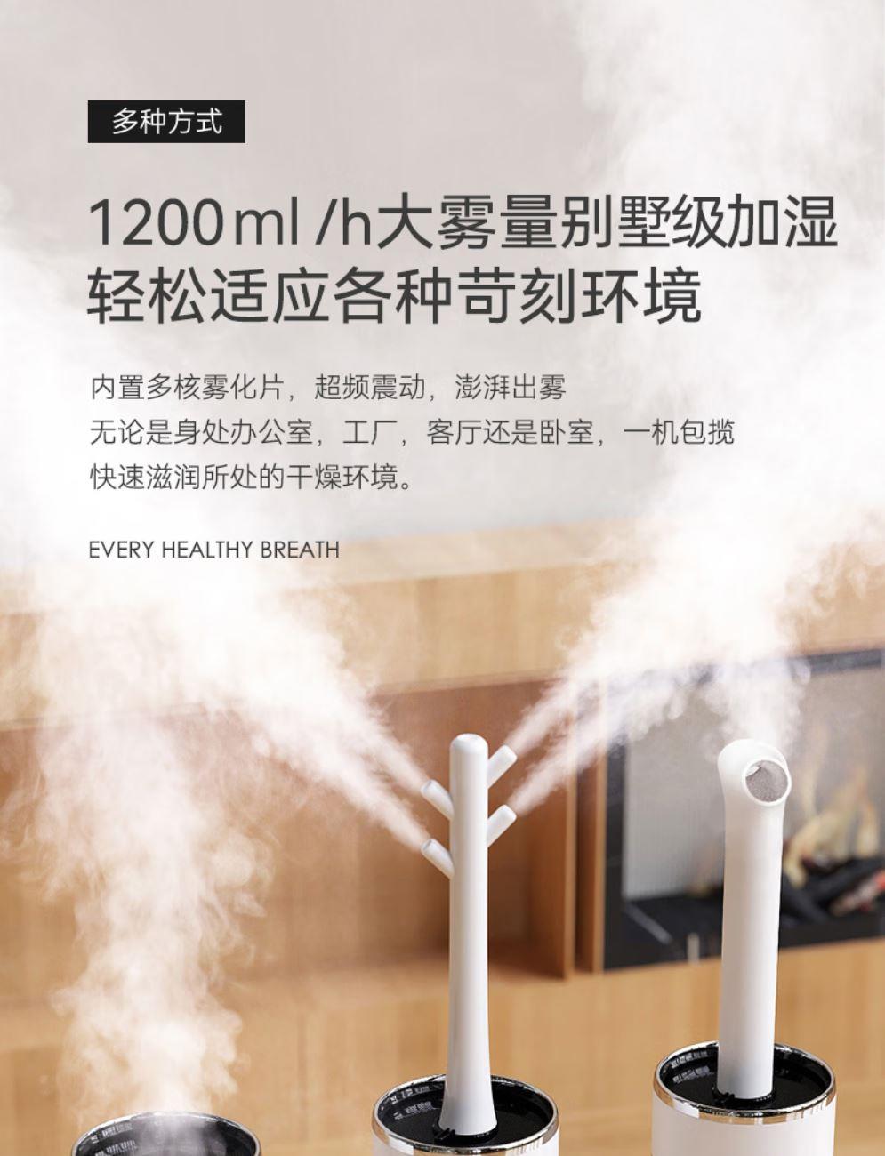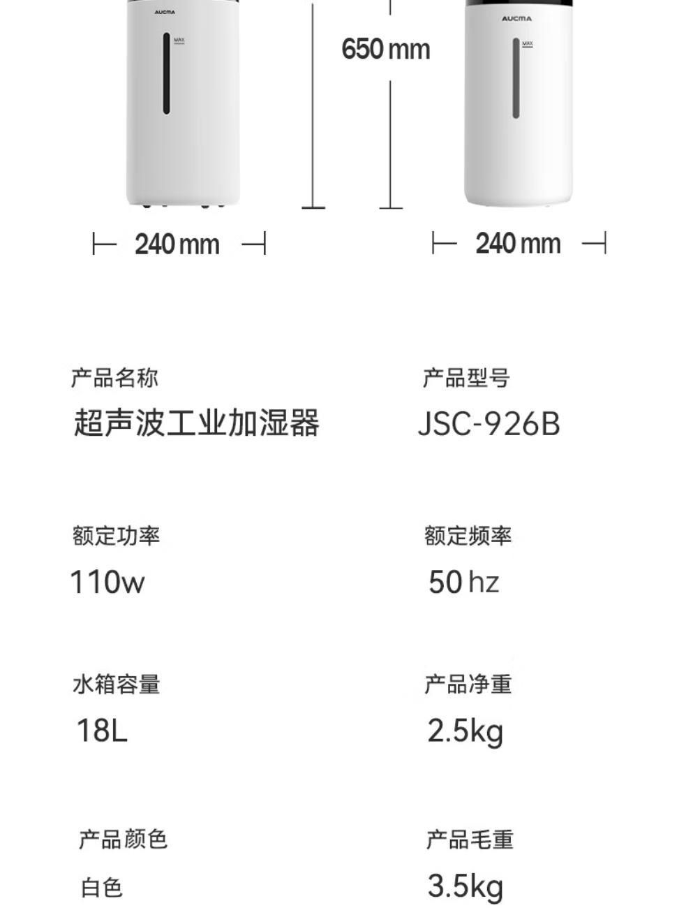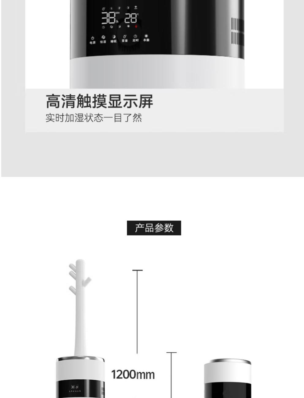 额定功率:110w 水箱容量:18L 产品净重:2.5kg 产品毛重:3.5kg 产品尺寸:240*240*1200mm 四核巨雾,一键开启全屋澎湃加湿 融合多项工业加湿黑科技,加适量更大,效果肉眼可见 1200ml/h大雾量别墅级加湿,轻松面对各种苛刻环境 内置波长灯,从源头真正做到消灭细菌 内置高精度湿度传感器,一键打造智能恒湿 18L海容量,足够加湿200平大空间一整天的要求