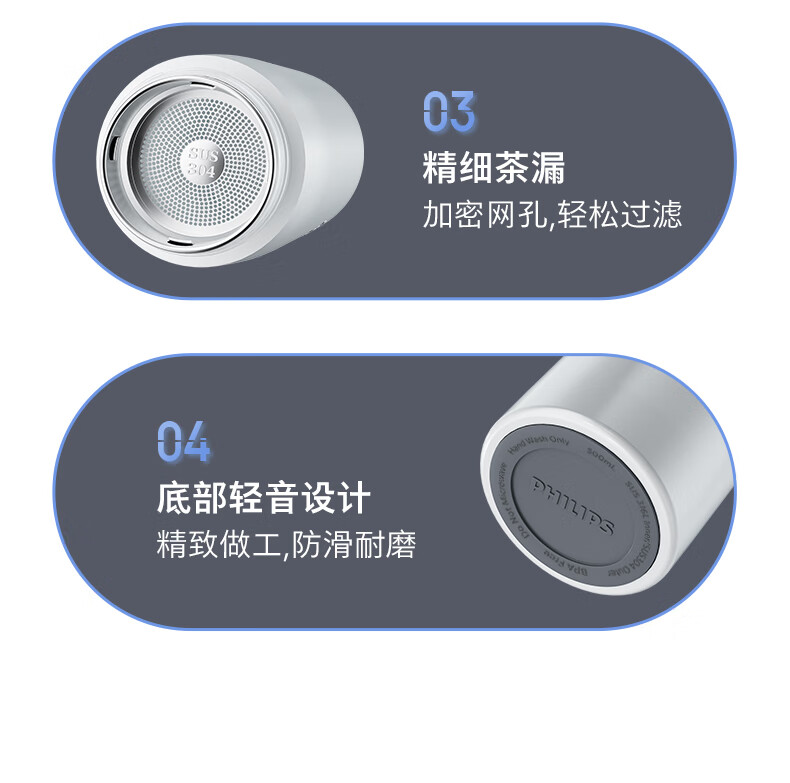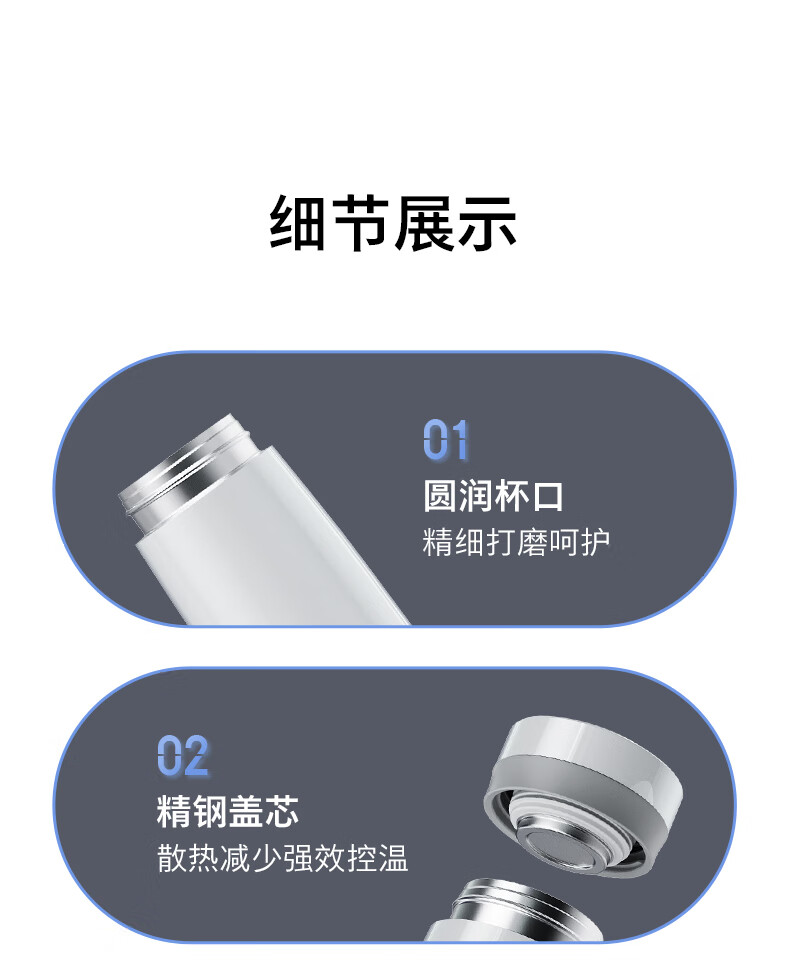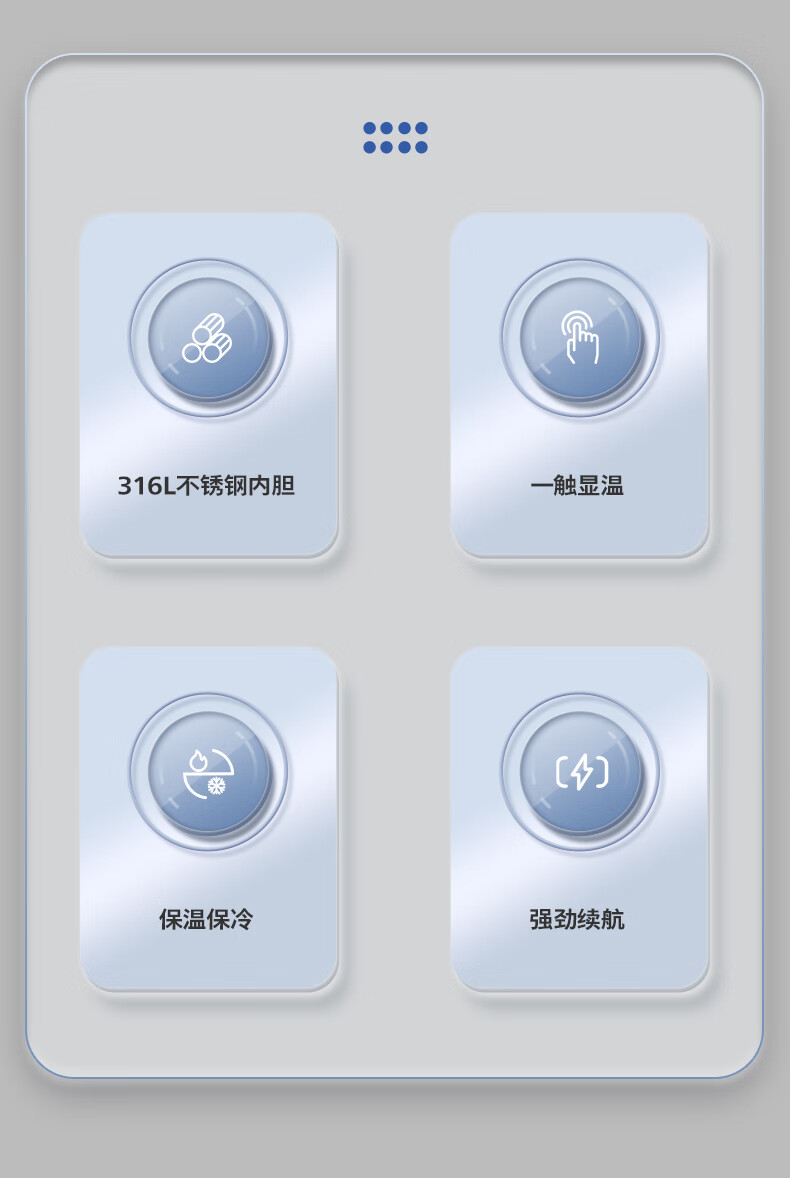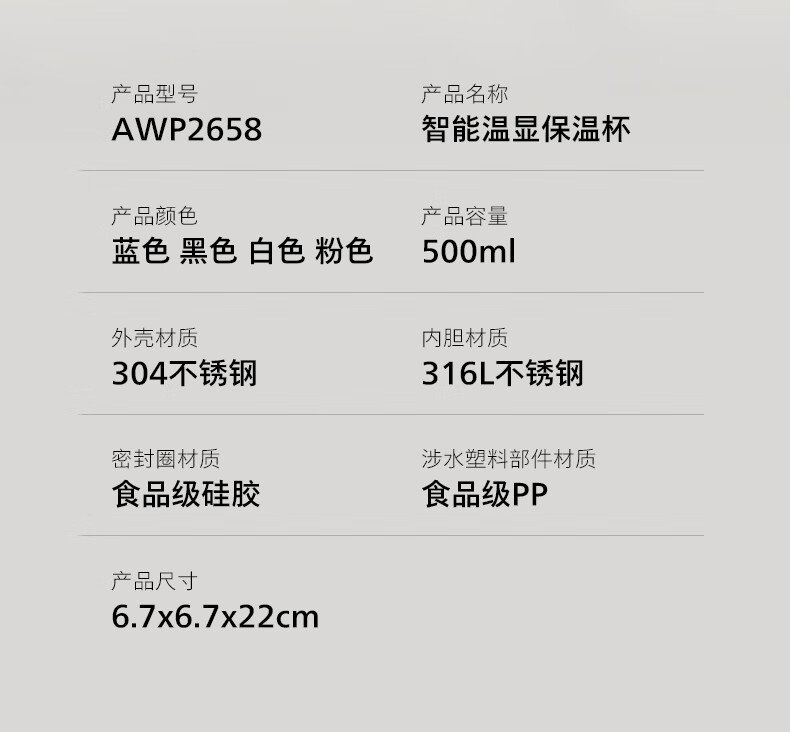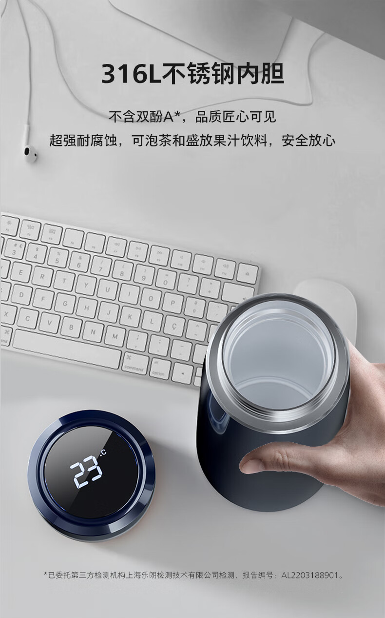长效保温保冷,24小时56°以上 智能芯片,测温实时显示 1年超长续航,不用频繁更换电池 316不锈钢无缝内胆,母婴级材质 内置茶漏,贴心设计 500ML大容量 内置硅胶封圈防漏,方便携带