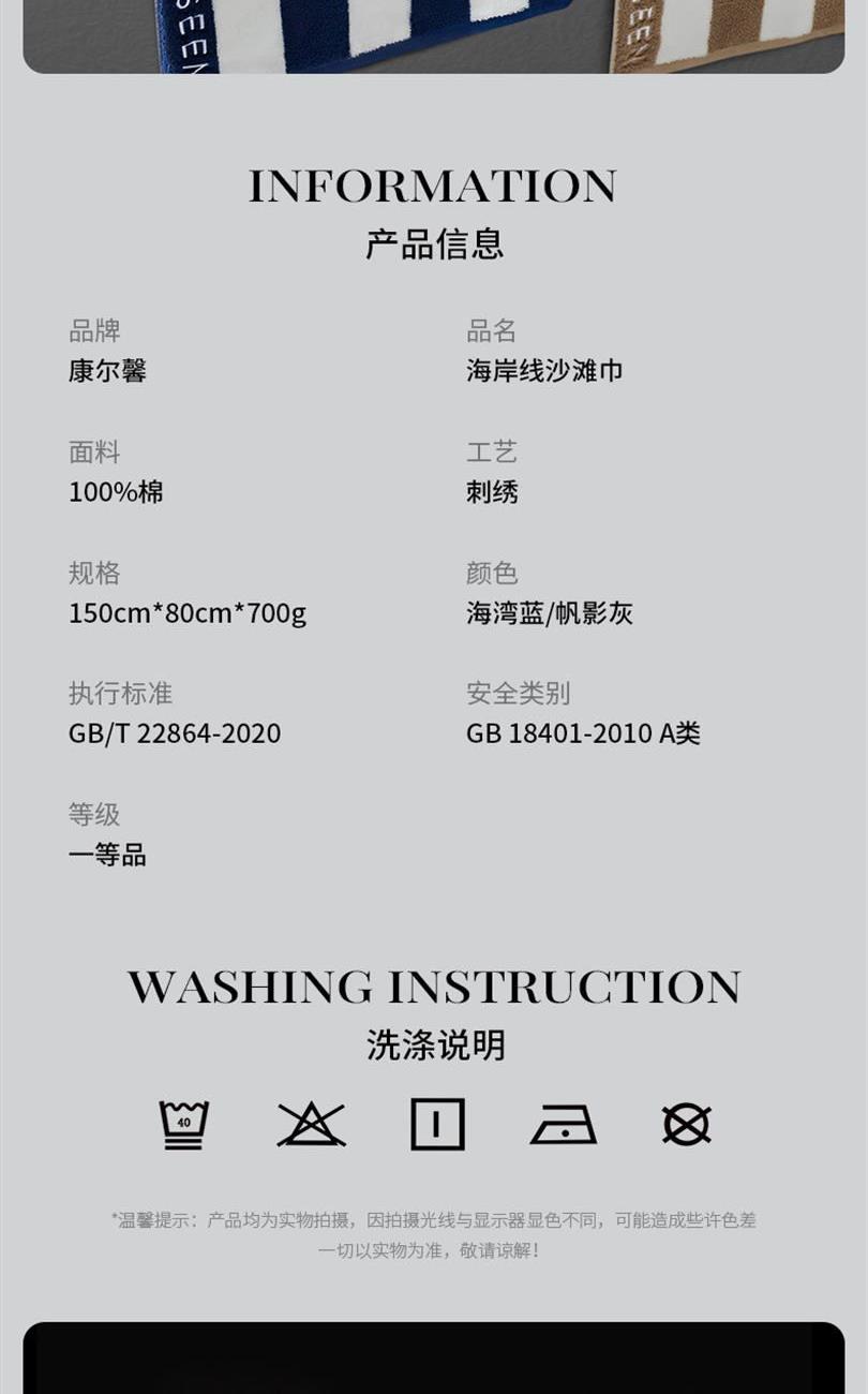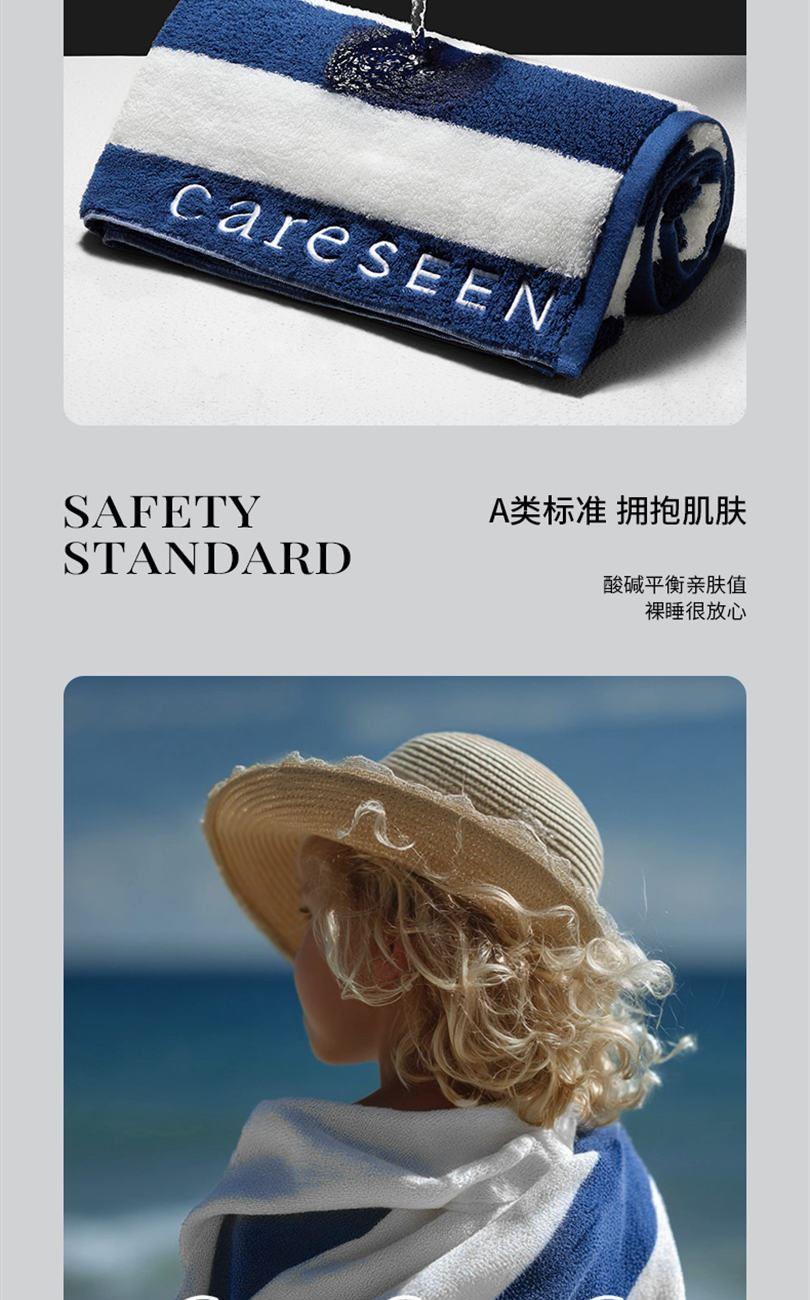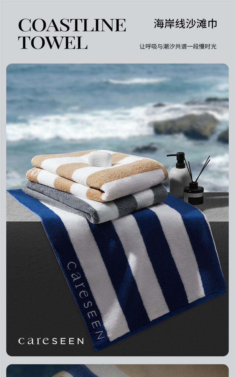 【产品面料】 纯棉 【产品颜色】海湾蓝/帆影灰 【产品规格】150*80cm/700g 【产品包装】careseen礼盒 瞬间吸水,580+GSM高克重,高密度纤维结构有效锁水 纯棉打造,从原料到面料严格把关。 安全健康,A类母婴级标准,更加安全放心使用