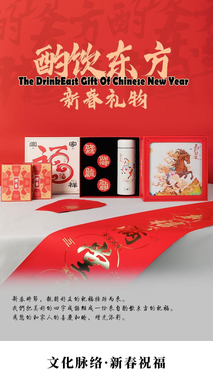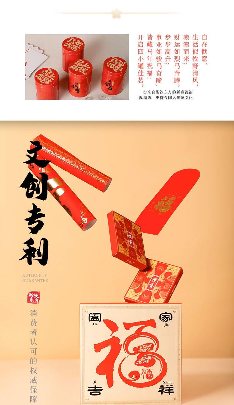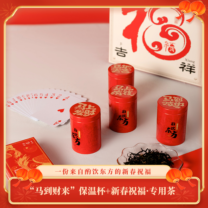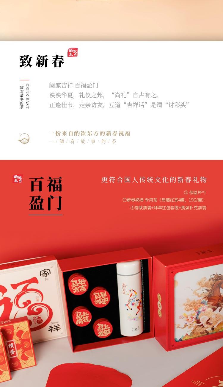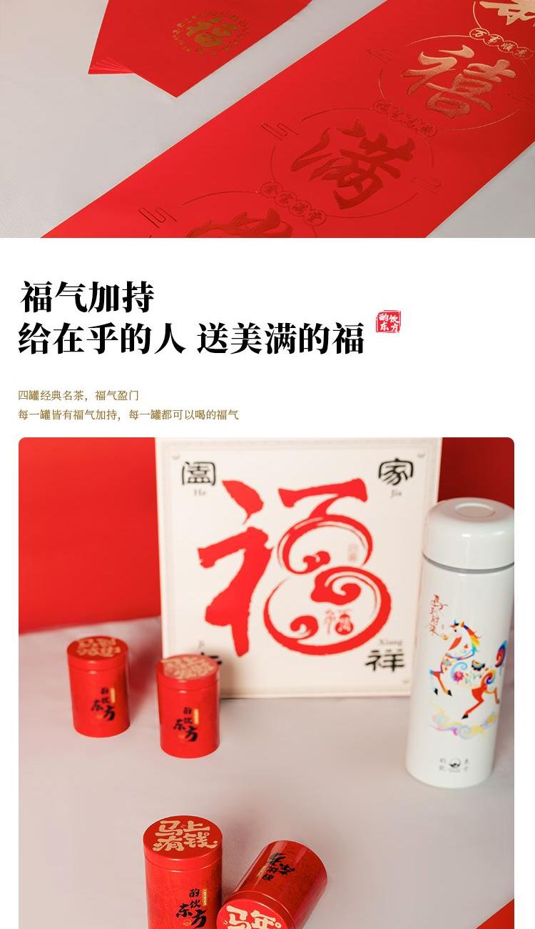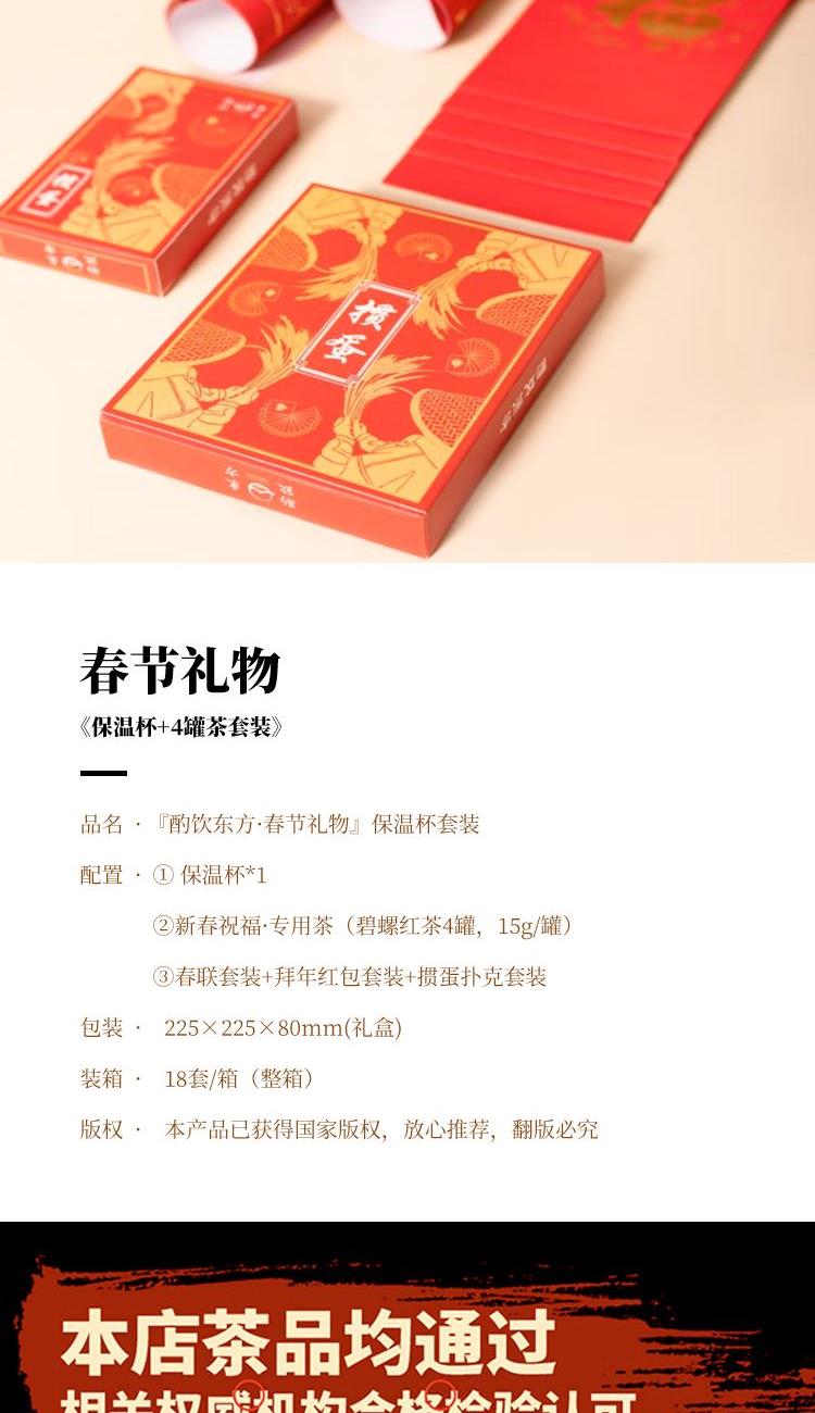 配置: ①保温杯*1 ②新春祝福·专用茶(碧螺红茶4罐,15g/罐) ③春联套装+拜年红包套装+掼蛋扑克套装