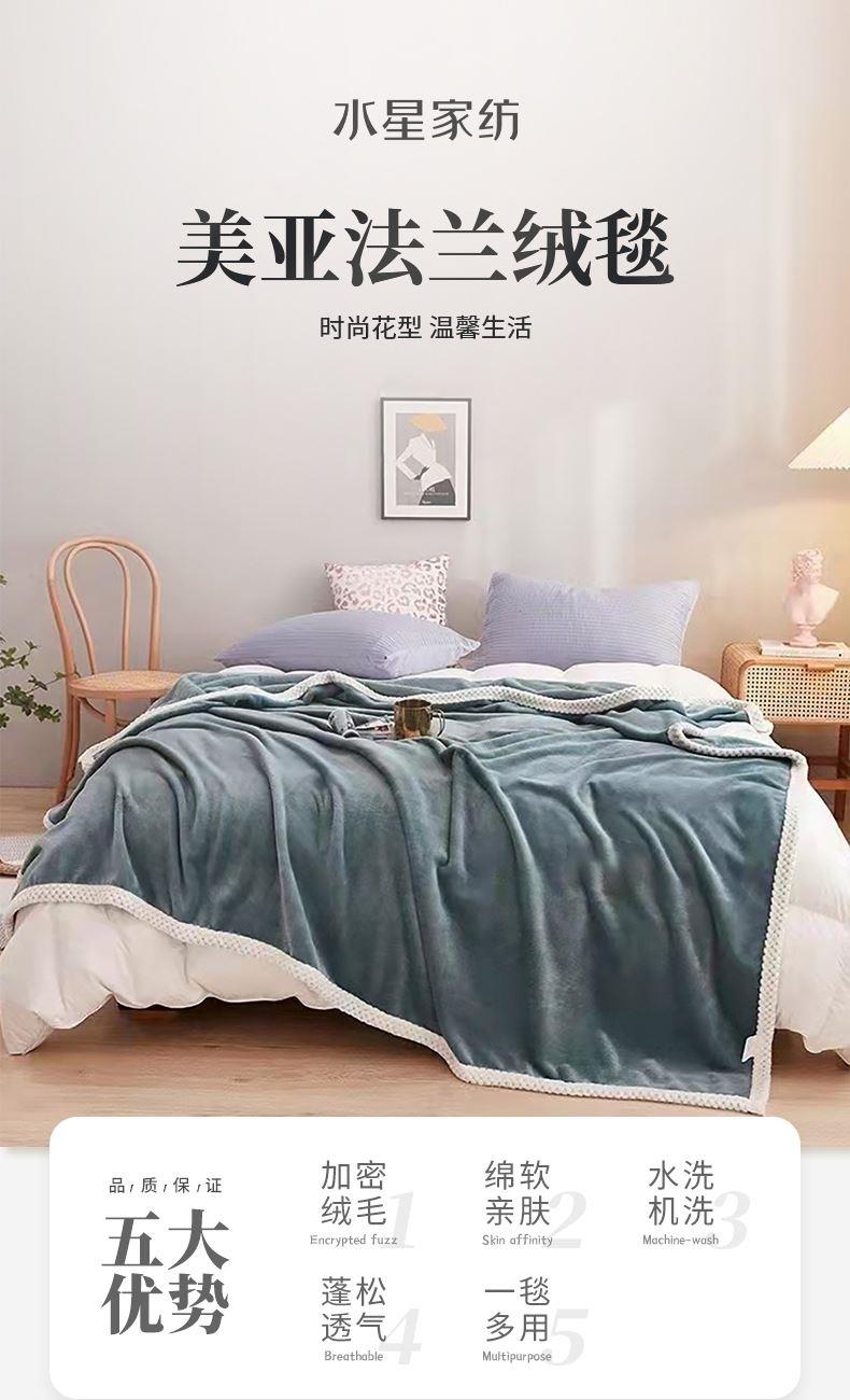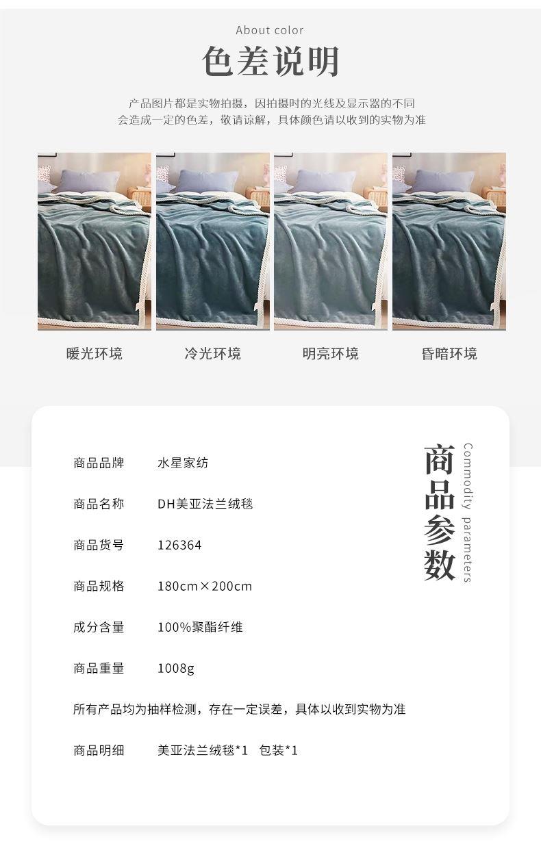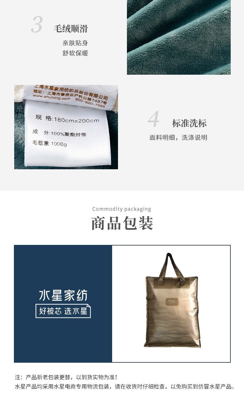 规格:180cm×200cm 面料:聚酯纤维 毯重:1008g 包装:手提无纺布软包