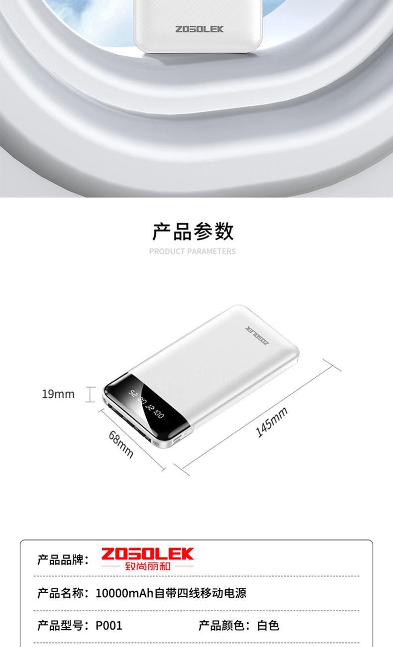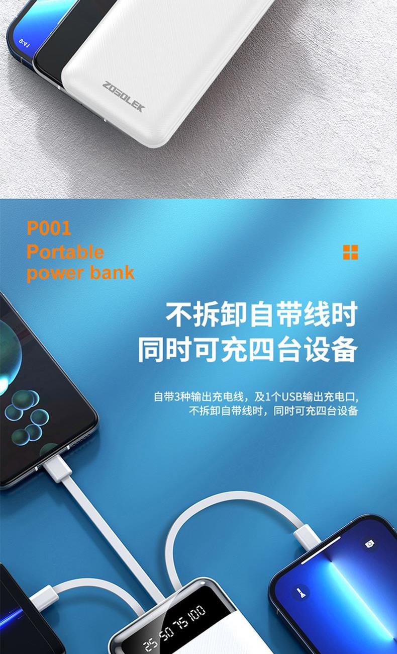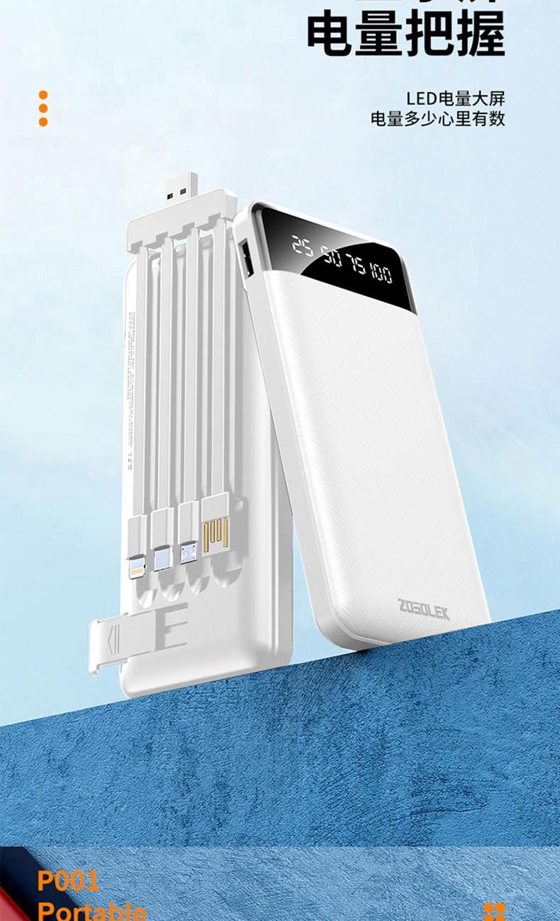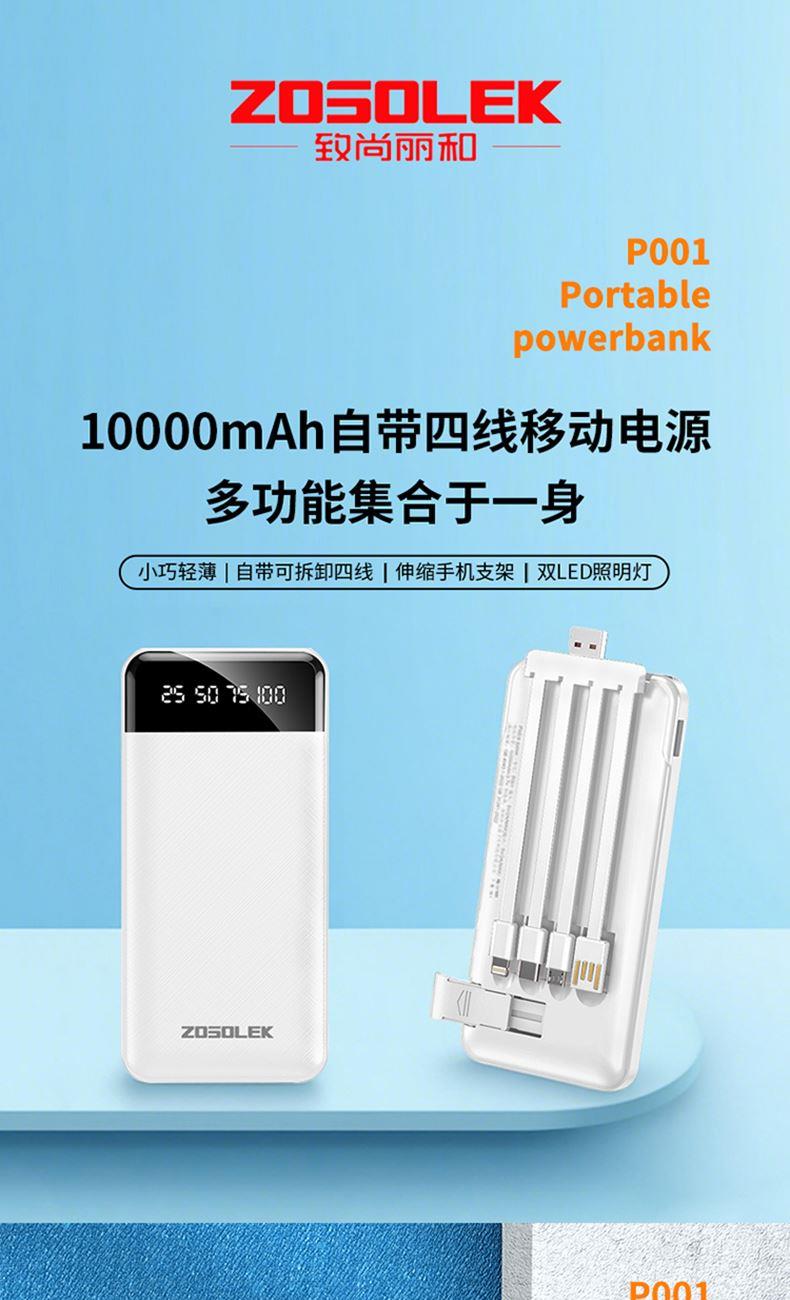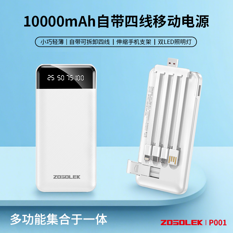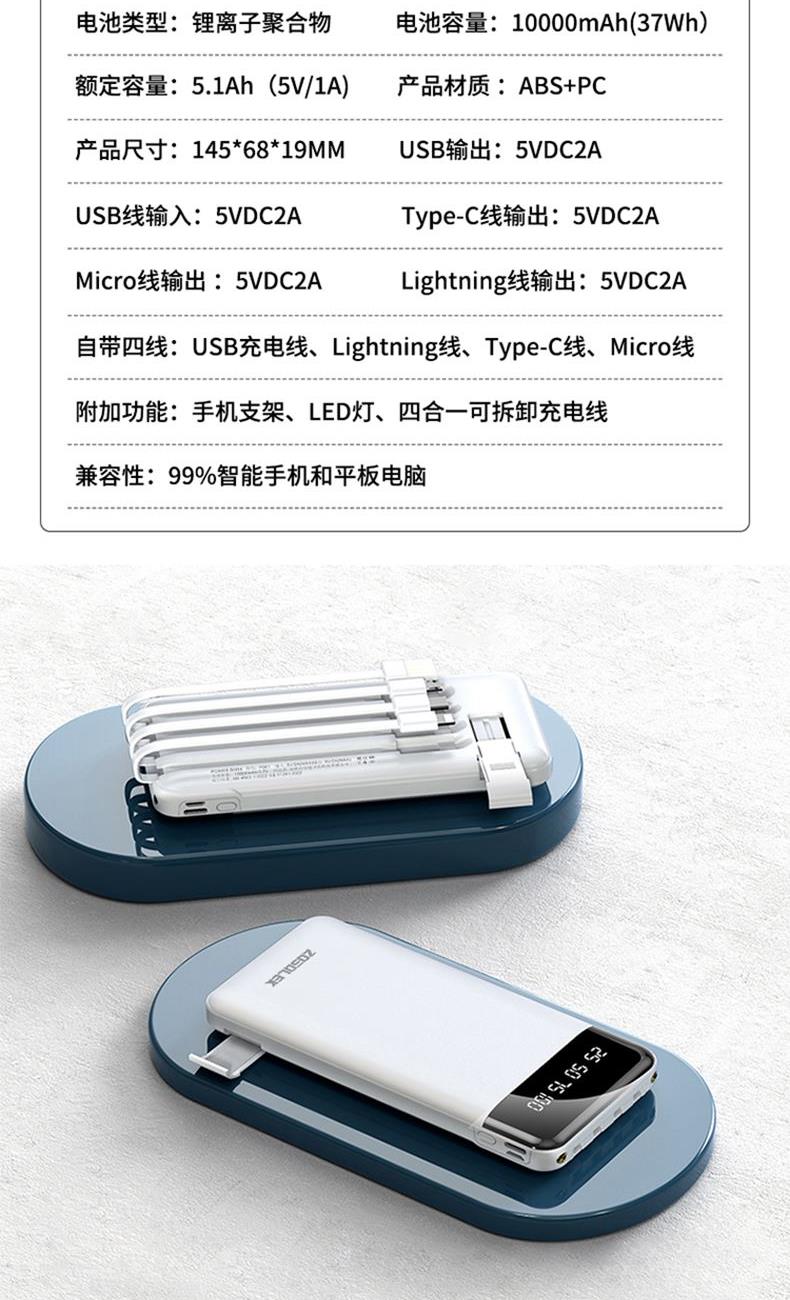 产品特点:1、多功能一体设计,小巧轻薄,携带方便;2、通过中国强制3C认证,符合中国安全标准,实标10000mAh容量,不玩虚假;3、自带四合一可拆卸充电线,出门无需带线;4、充电线拆卸时可以作为一拖三充电线使用,未拆卸时可以输入给自己充电,也可以同时输出充多台设备;5、智能5V2A输入输出,自带3种输入方式及5种输出方式,可满足大部分数码设备的日常应急充电需求;6、自带伸缩手机支架,解放双手,实用方便;7、自带双LED照明灯,黑暗环境使用无忧;8、数显电量,电量由您掌控;9、彩盒包装,支持各类定制需求。