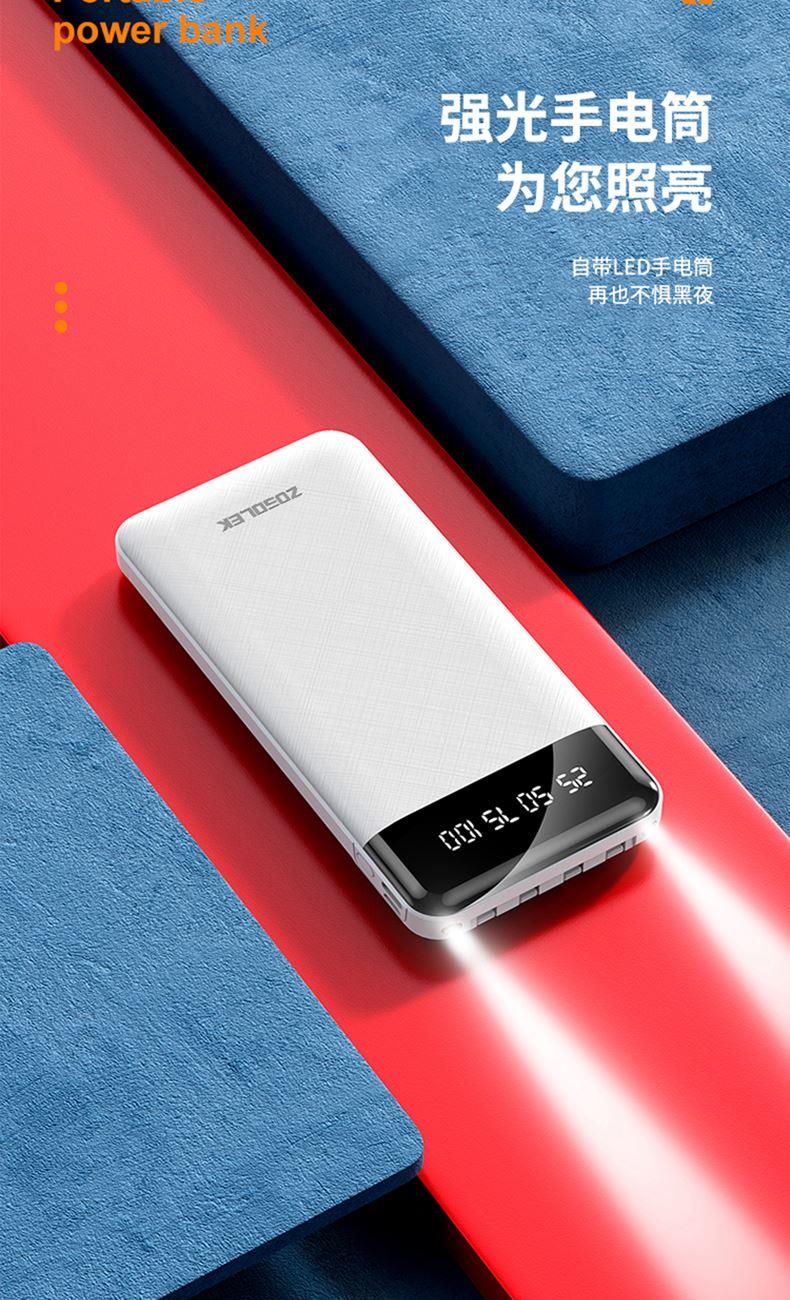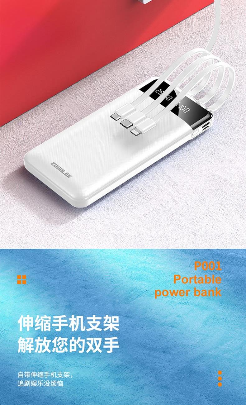 3C认证、数显电量、自带四合一可拆卸充电线、伸缩手机支架、双LED照明灯