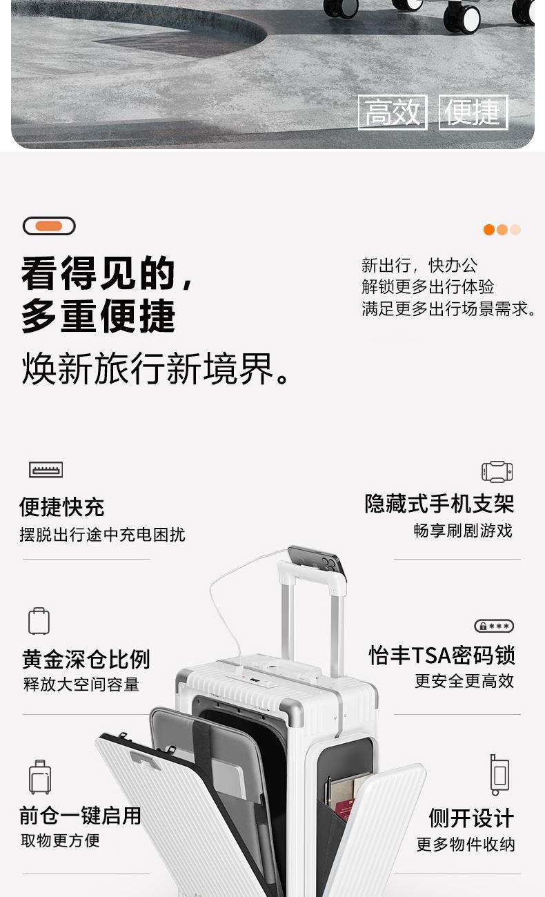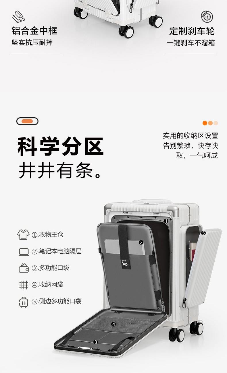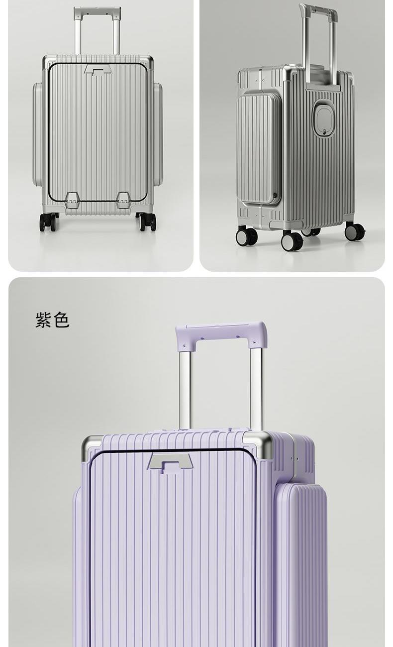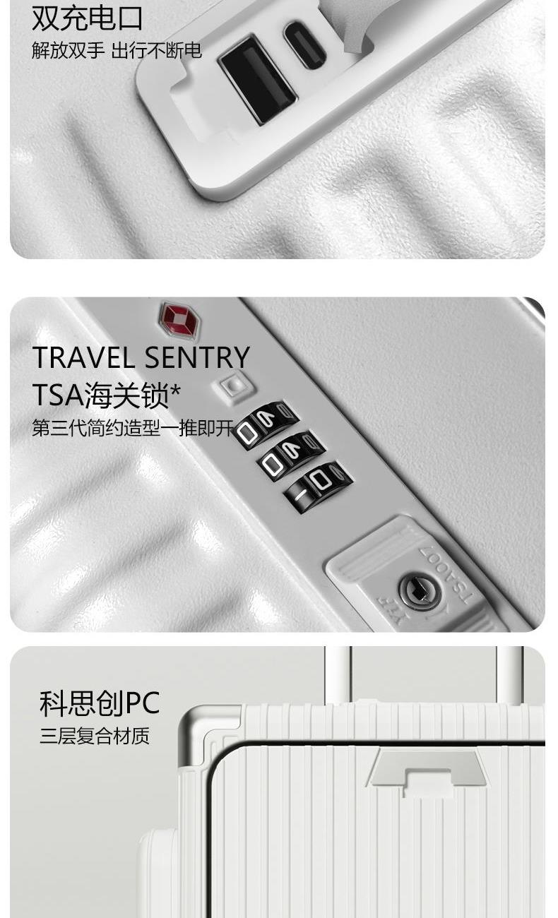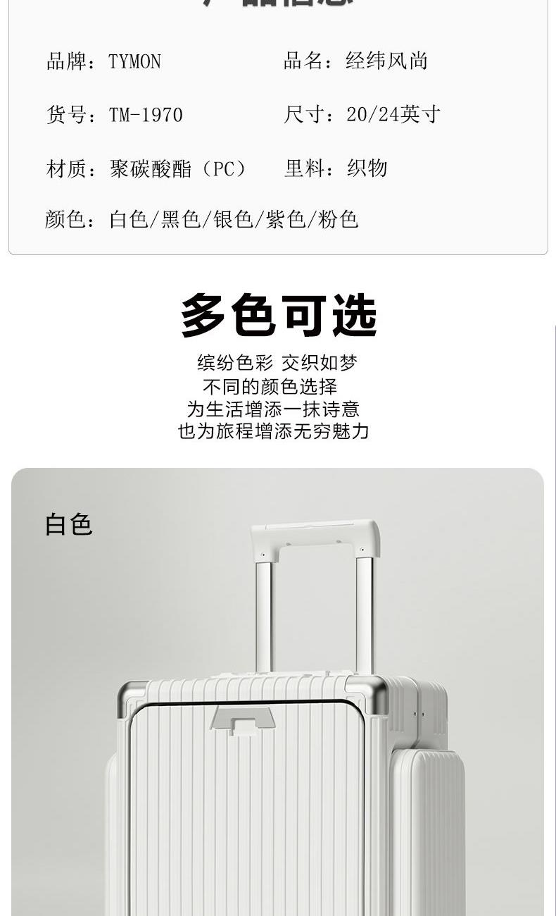 材质:聚碳酸酯(PC) 里料:涤纶 拉杆材质:全铝 尺寸:20英寸 颜色:黑色/白色//银色/紫色/粉色 货号:TM-1970 1、嵌入式前置独立电脑仓,滴答一下优雅出行; 2、外置USB+Type-C充电口,时刻能量满满; 3、手机支架,水杯支架,功能强大; 4、三把国际TSA海关锁,全球畅通无阻; 5、铆钉铝框中控闭合,内里干湿分离科学分区; 6、航空级合金拉杆,双排高弹力TPE刹车轮。 7、创新双侧口袋