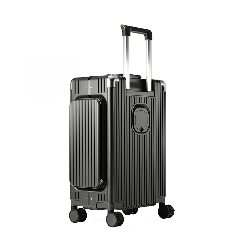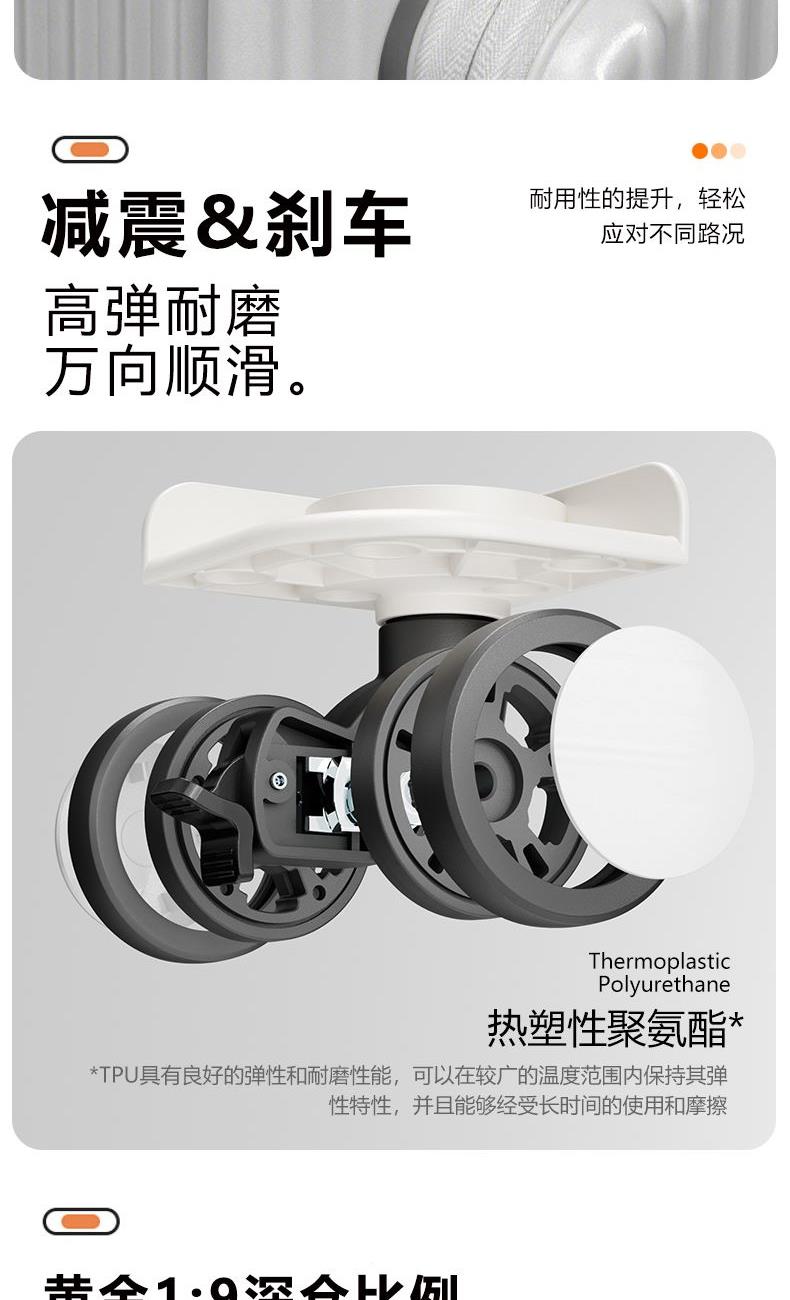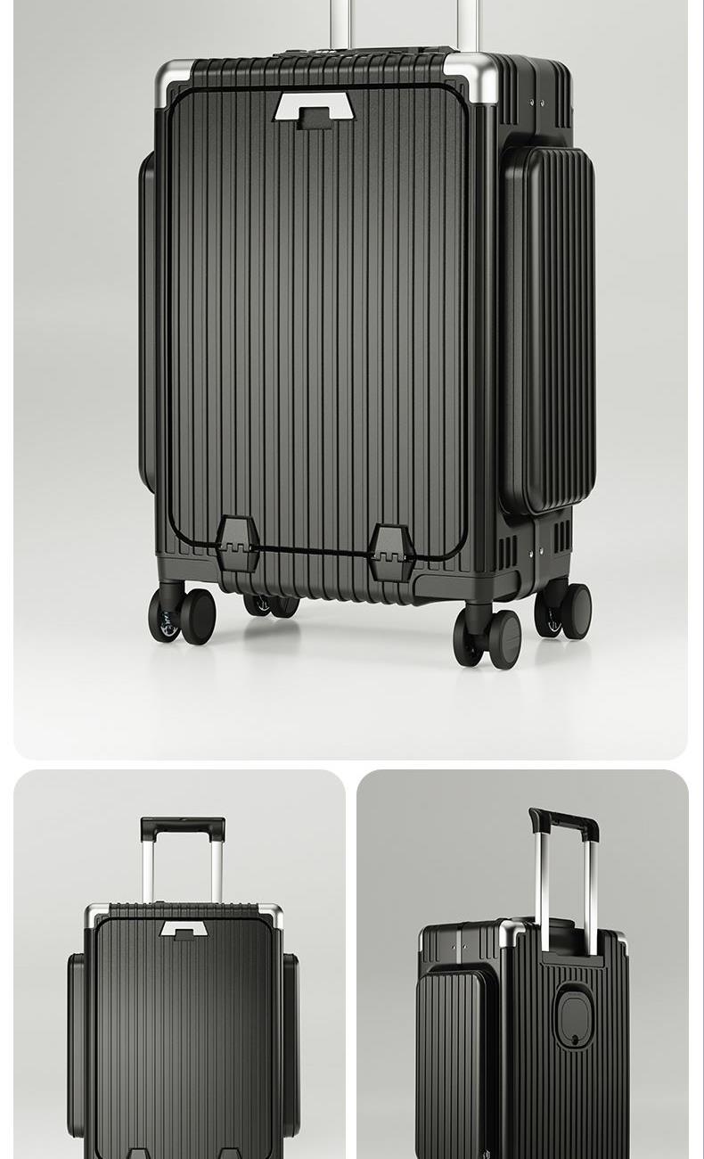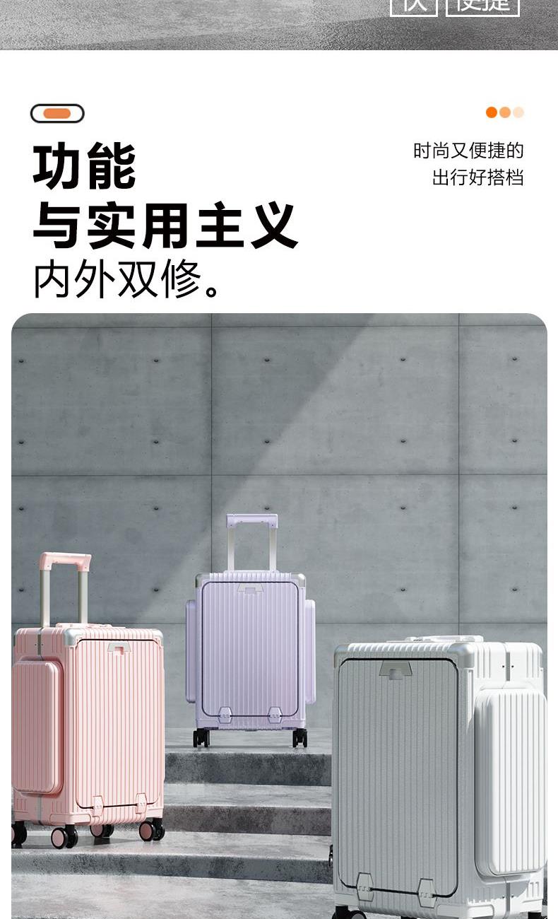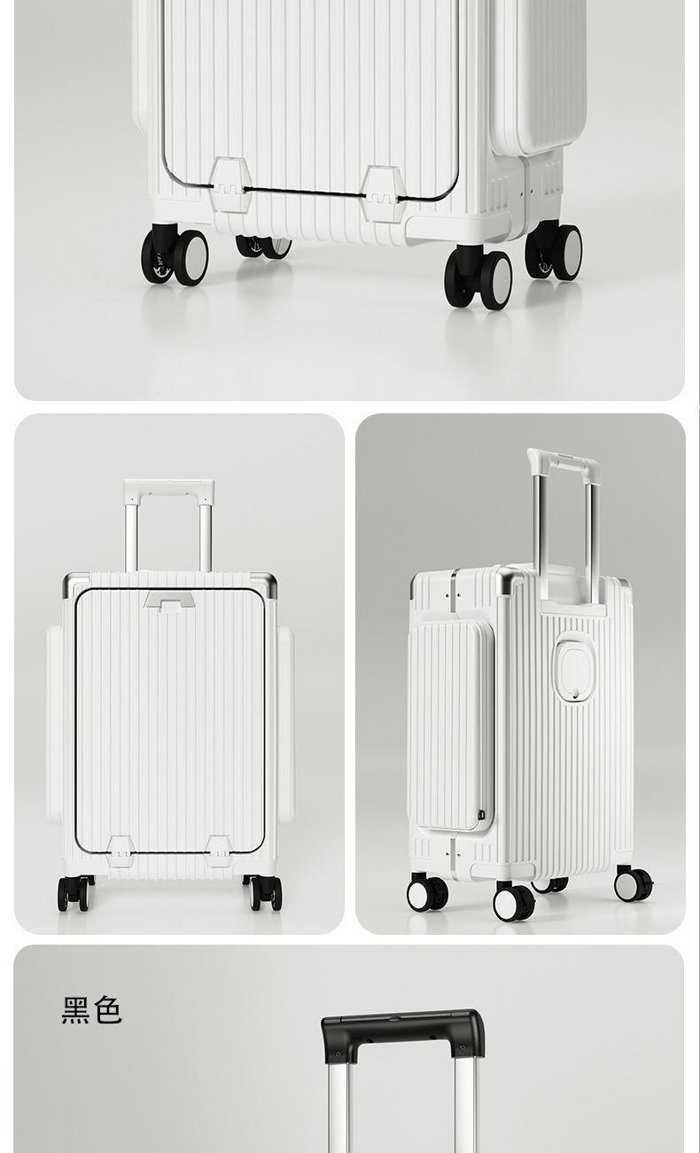 材质:聚碳酸酯(PC) 里料:涤纶 拉杆材质:全铝 尺寸:20英寸 颜色:黑色/白色//银色/紫色/粉色 货号:TM-1970 1、嵌入式前置独立电脑仓,滴答一下优雅出行; 2、外置USB+Type-C充电口,时刻能量满满; 3、手机支架,水杯支架,功能强大; 4、三把国际TSA海关锁,全球畅通无阻; 5、铆钉铝框中控闭合,内里干湿分离科学分区; 6、航空级合金拉杆,双排高弹力TPE刹车轮。 7、创新双侧口袋