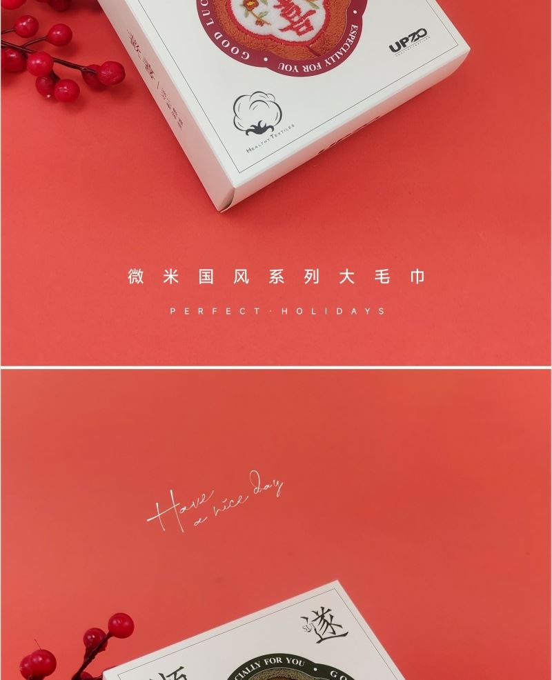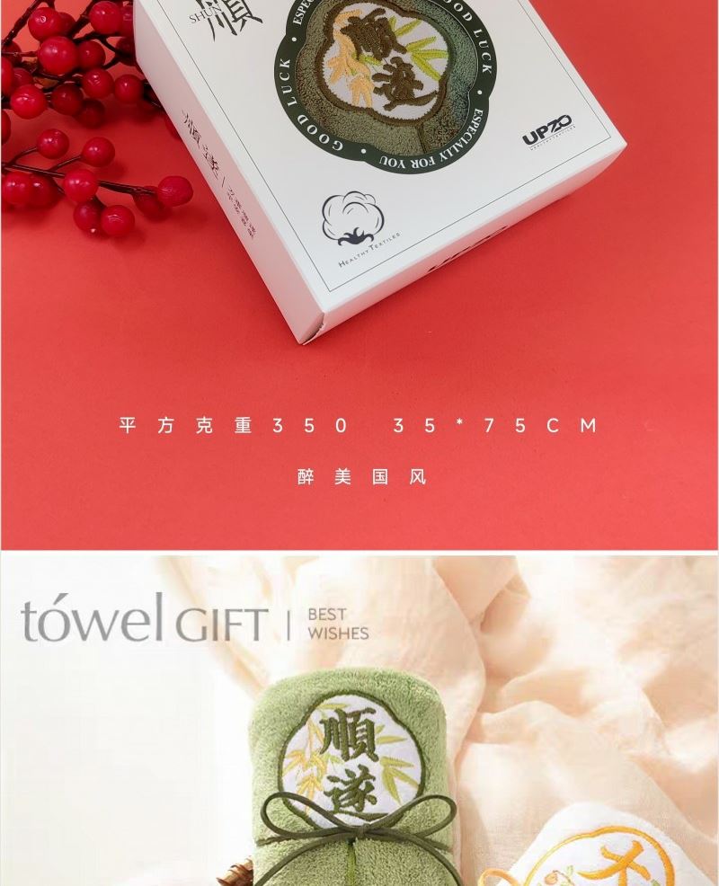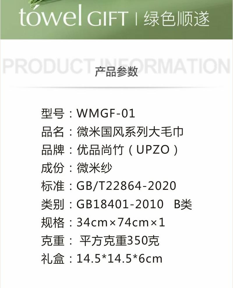 型号: WMGF-01 产品内容 微米国风系列大毛巾×1 平方克重350克 34*74CM (加厚加大设计 精致绣花及装饰) 成份:微米纱 外盒:14.5×14.5×6 cm 微米纱大毛巾 加厚设计 祝福融入礼盒与产品 创意礼品