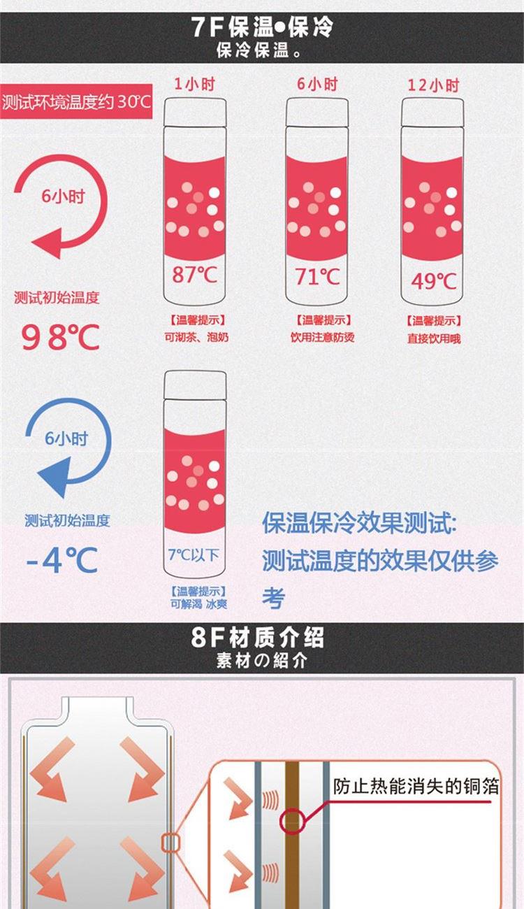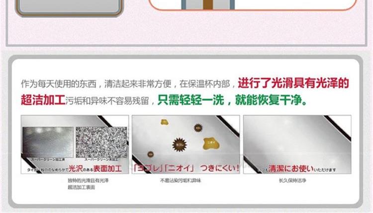 颜色:高光银蓝AM 高光银红PR,苹果绿GL 不锈钢XC 容量:0.48L 材质 :304不锈钢 尺寸 :6.6*6.6*21.2cm 重量:0.23kg 内部表面采用特殊镜面加工处理 不易脏污,不易沾染异味 本体可以整体清洗 栓体可分解清洗 饮水口可拆卸清