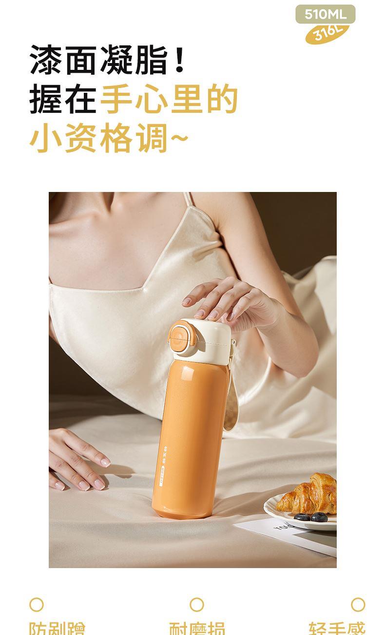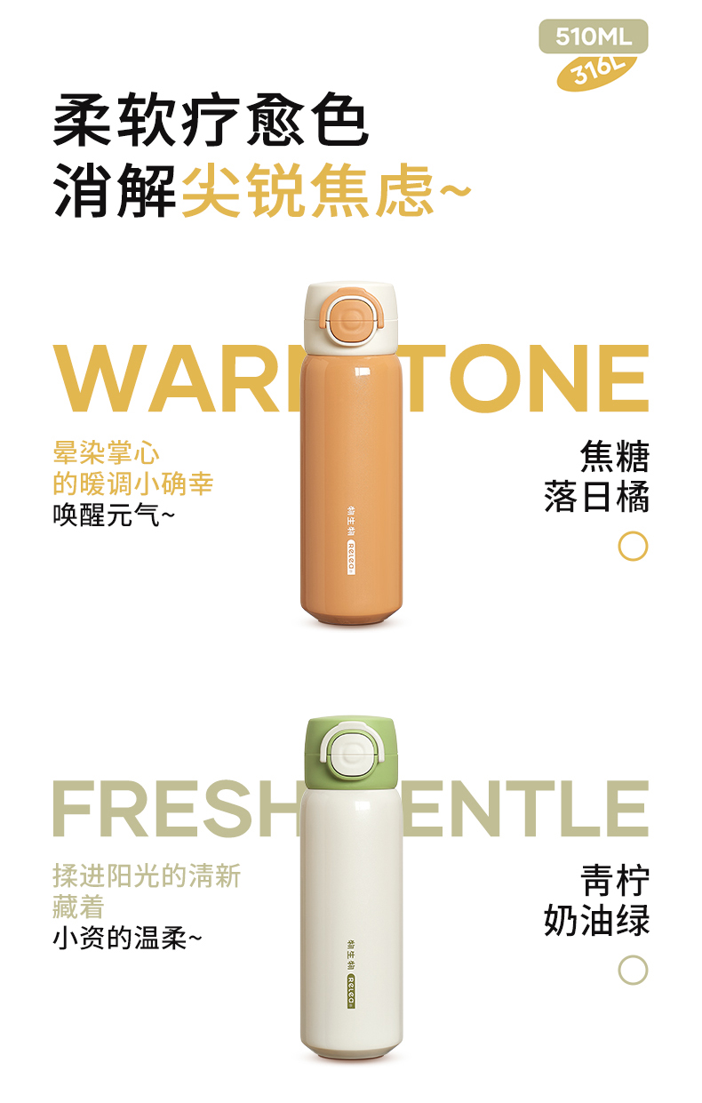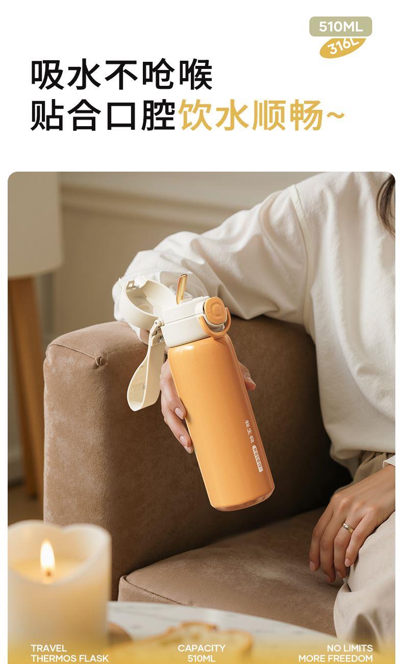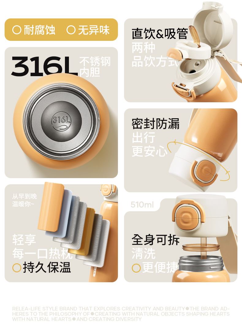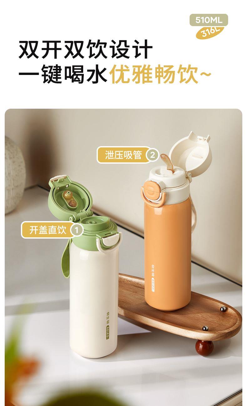 型号:JV012548-0510 颜色:焦糖落日橘 青柠奶油绿 材质:316不锈钢 容量:510ml 1:直饮&吸管两种品饮方式 2:密封防漏出行更安心 3:全身可拆清洗