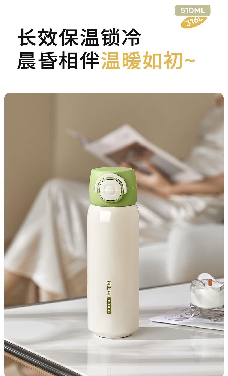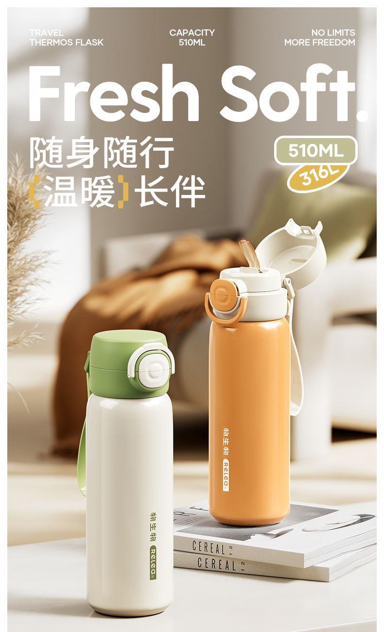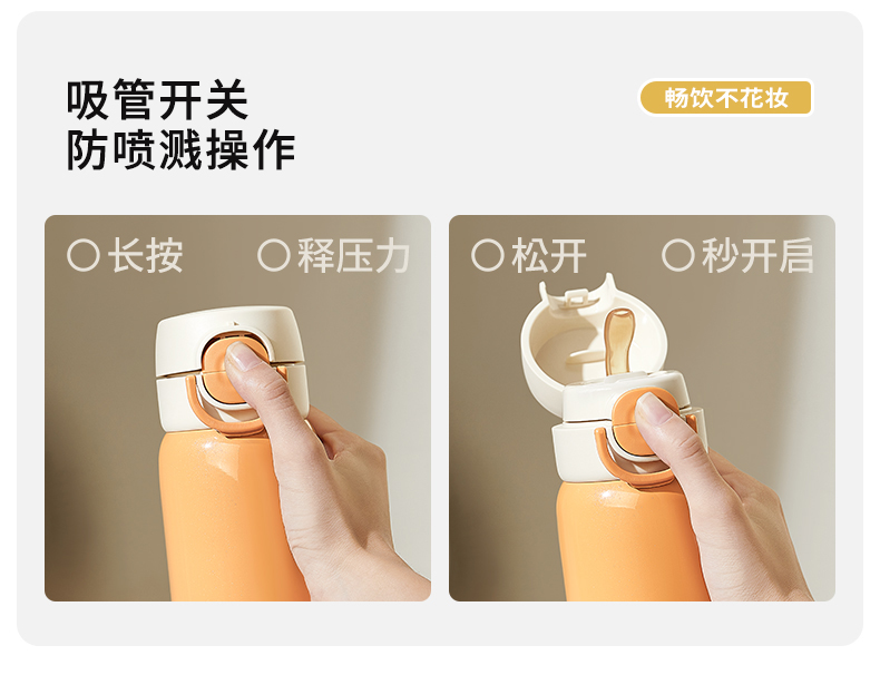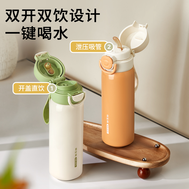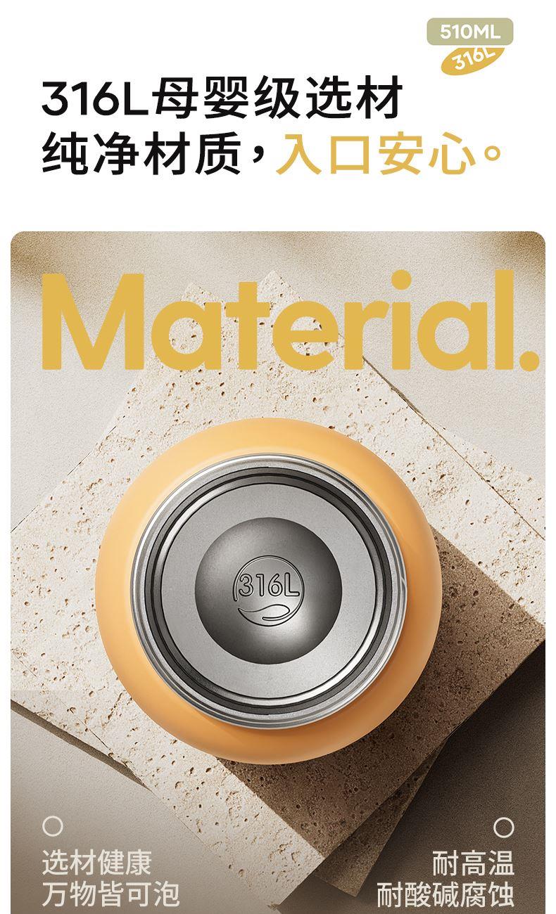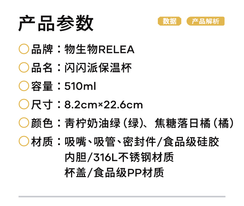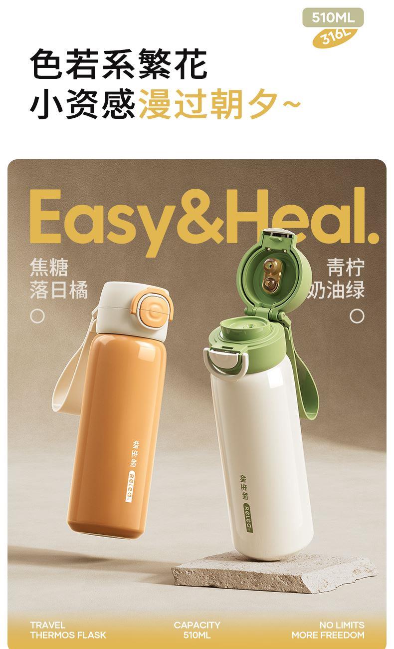 型号:JV012548-0510 颜色:焦糖落日橘 青柠奶油绿 材质:316不锈钢 容量:510ml 1:直饮&吸管两种品饮方式 2:密封防漏出行更安心 3:全身可拆清洗