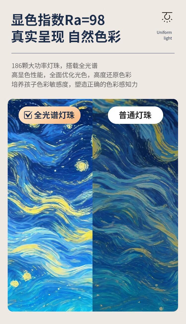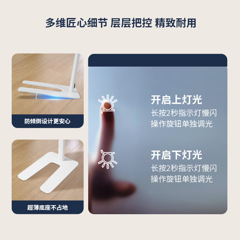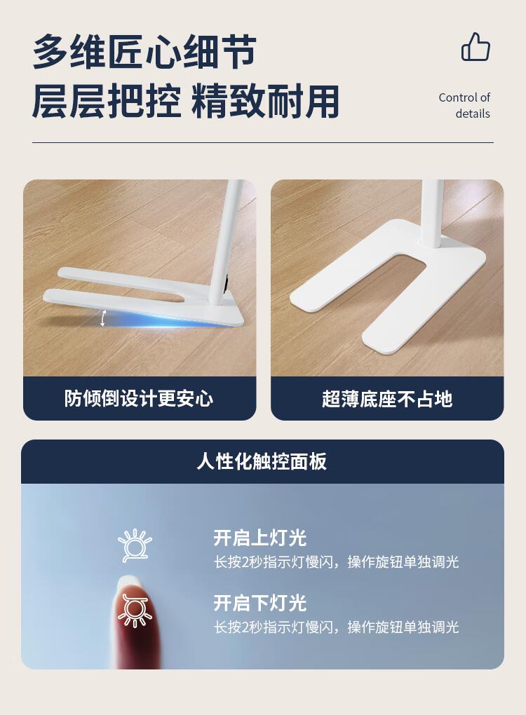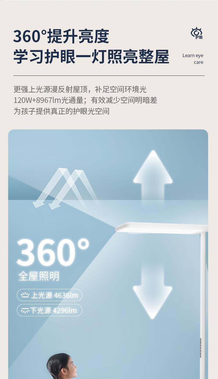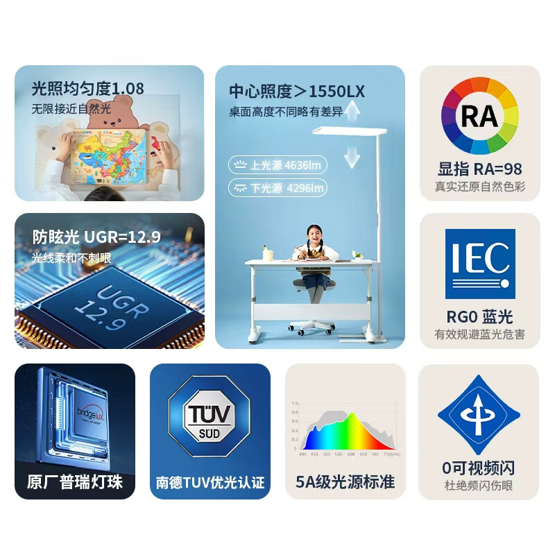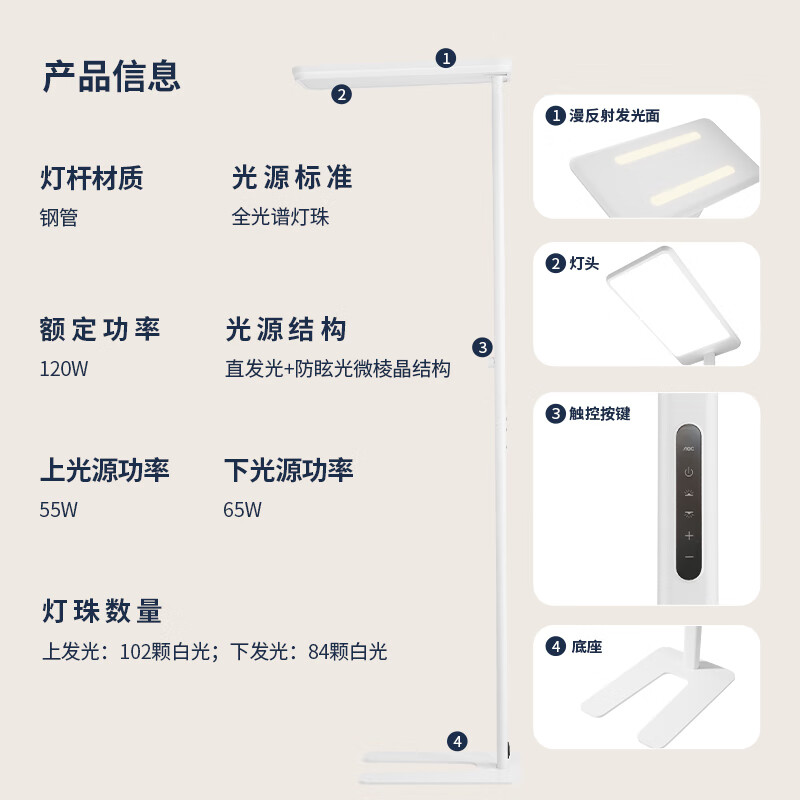 灯杆材质:铁灯杆+塑料灯头+碳素钢底座 操控方式:触控、上下无极调控 光源控制:原厂普瑞全光谱灯珠 光源结构:直发光+防眩光微棱镜结构 光源标准:原装普瑞灯珠 额定功率:120W 上光源功率:55W 下光源功率65W 总 光 通 量:9100lm 中心点照度:1470Lx 均 匀 度: ≤1.1 显色指数Ra:97+1 饱和红色显指R9:>90