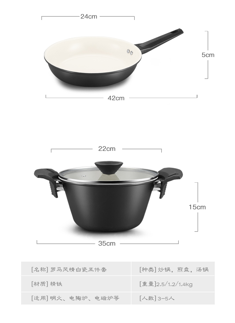 产品型号:LD-104 产品参数:炒锅30cm、煎锅24cm、汤锅24cm 产品材质:精铁 彩盒尺寸:660*160*370 外箱尺寸:68.5*66*39.5(4/只) 条 形 码:6971388522269