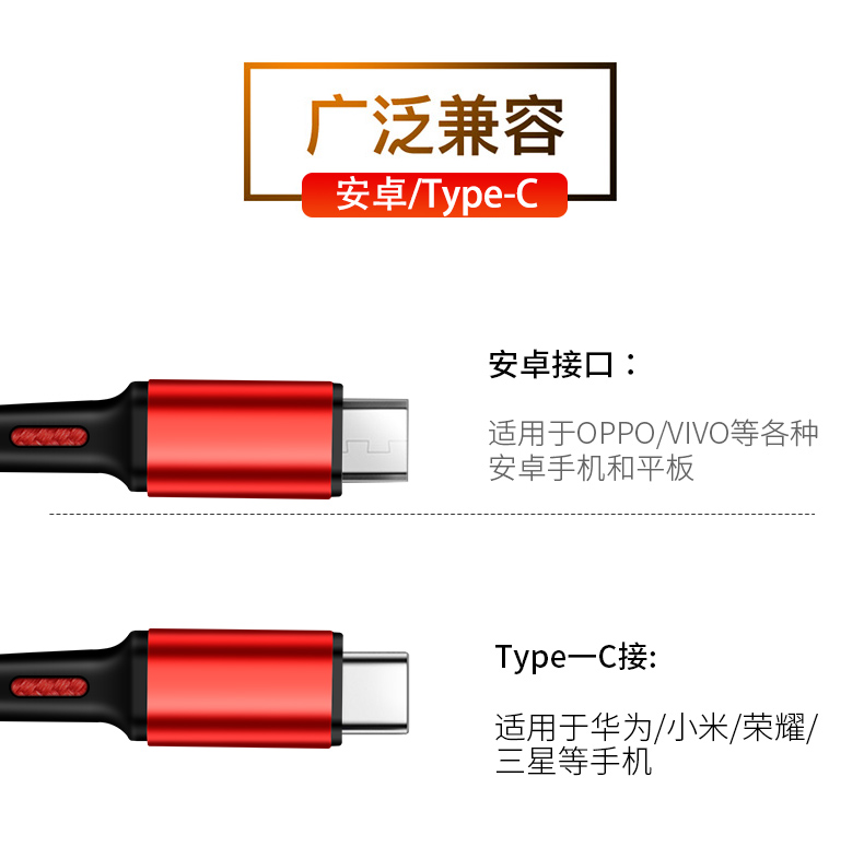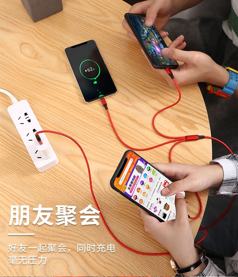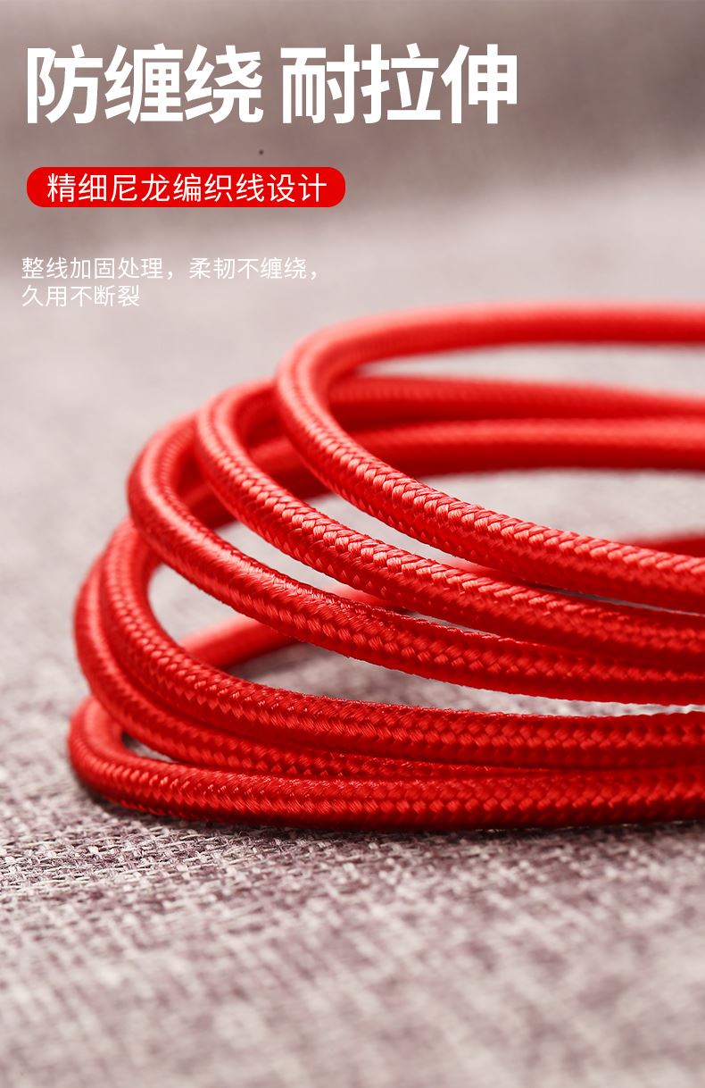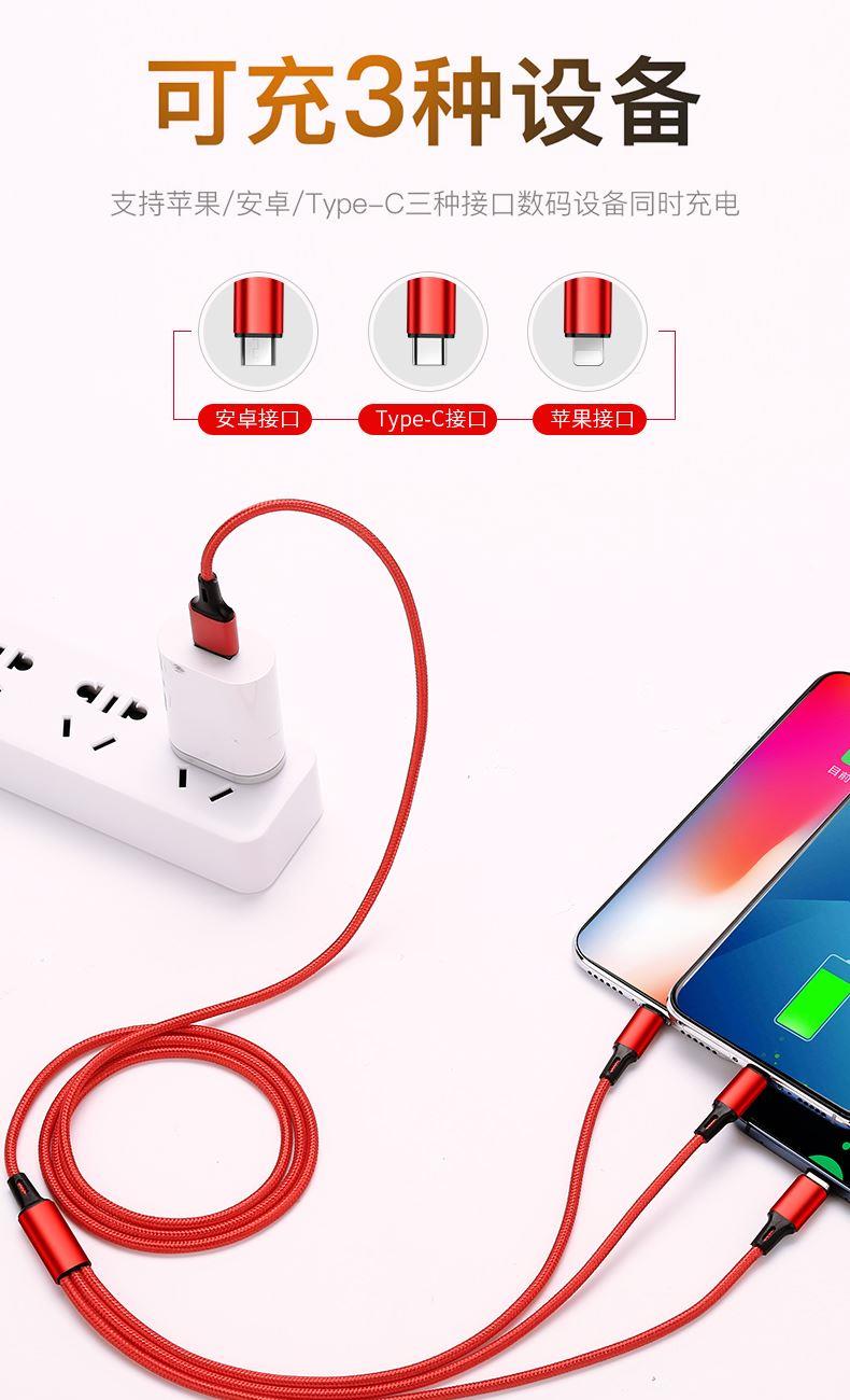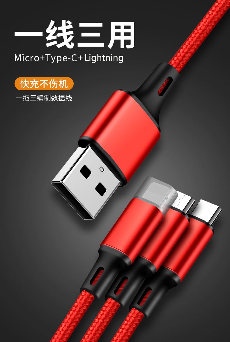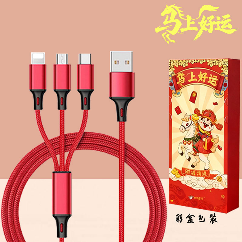 数据线长度:120cm 颜色:红色 材料:尼龙编织+铝金合头 适用机型:苹果/安卓/Type-C 分线接头数量:一托三 • 编织一拖三数据线:可充电任何手机,数码设备接口 • 经济实用性价比高,中转可定制LOGO • 马上好运彩盒包装 引流随手好礼