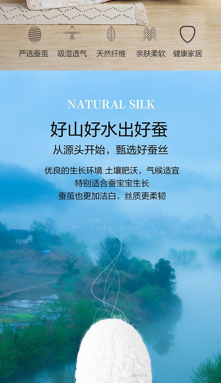 面料:聚酯纤维 规格:200cm*230cm 填充材质:50%柞蚕丝(中长丝绵)+50%聚酯纤维 填充重量:350g