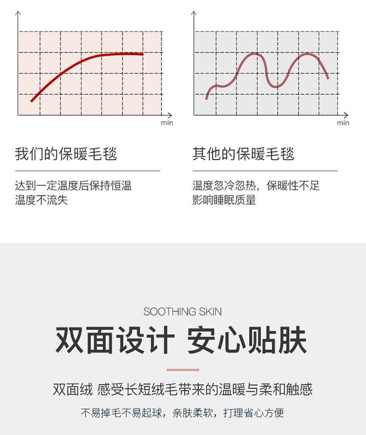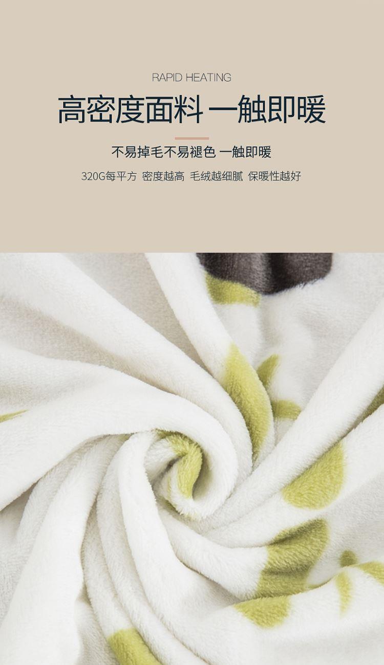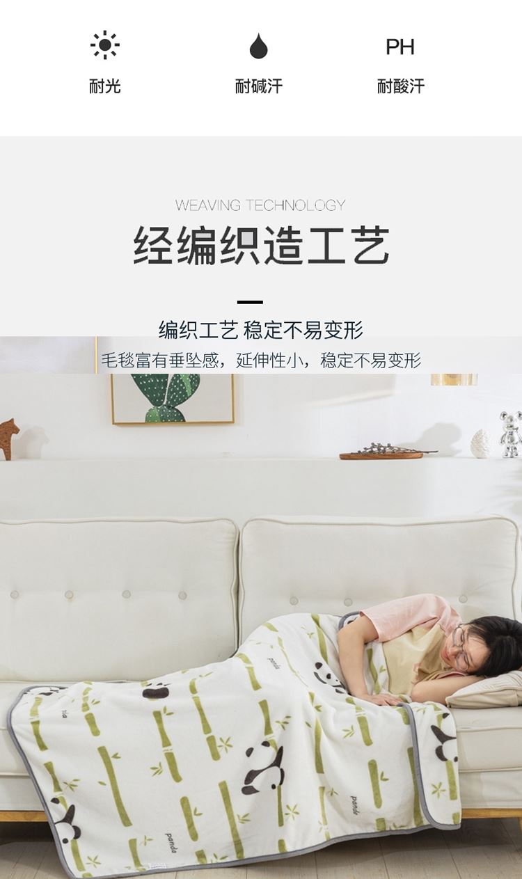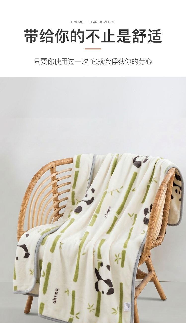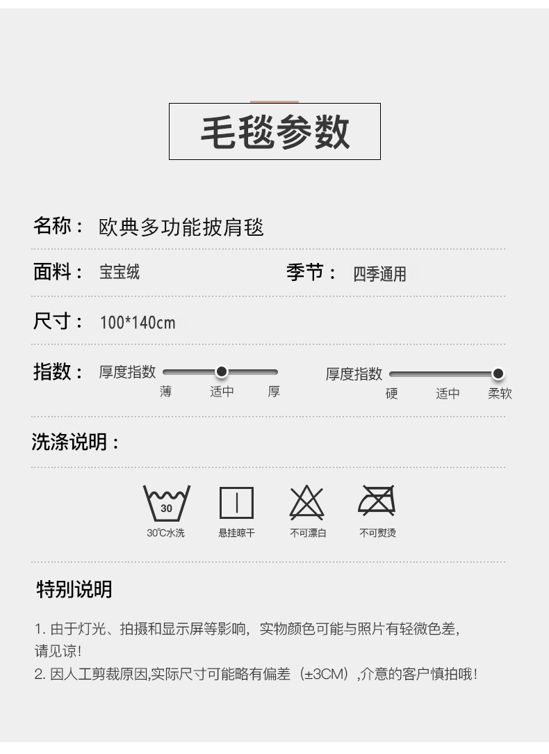 规格:100*140cm 面料:宝宝绒 克重:400g 产品特点: 1.宝宝绒面料手感佳,光滑柔软,易于清楚。 2.宝宝绒是一种独特的面料,非常适用在贴近皮肤。