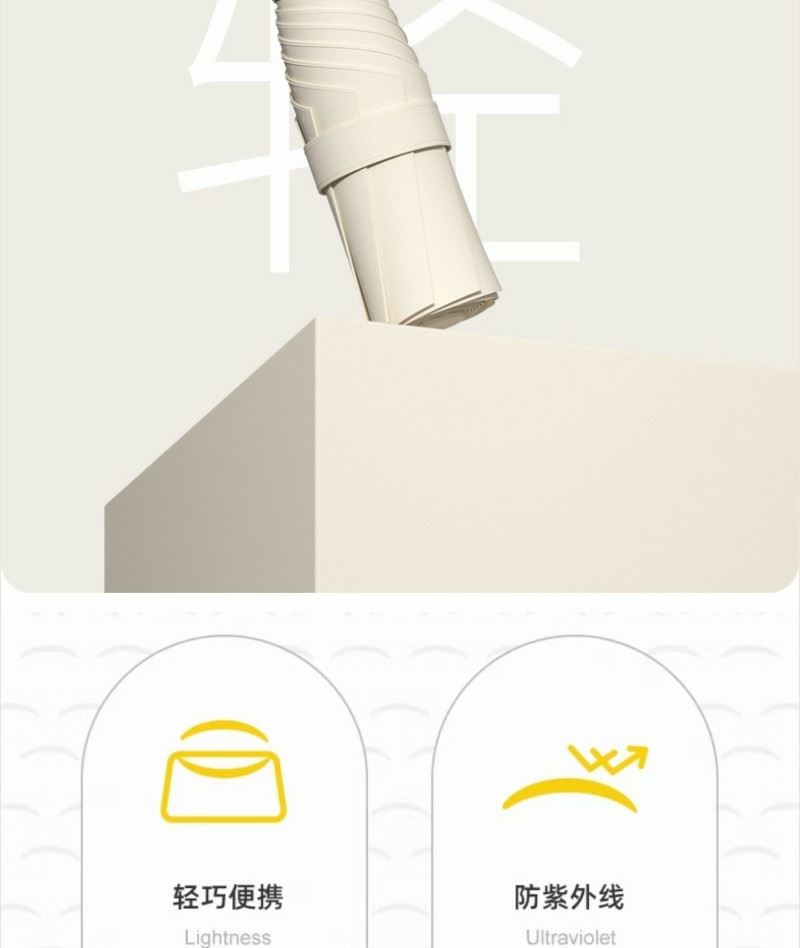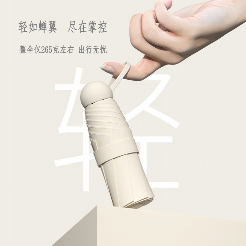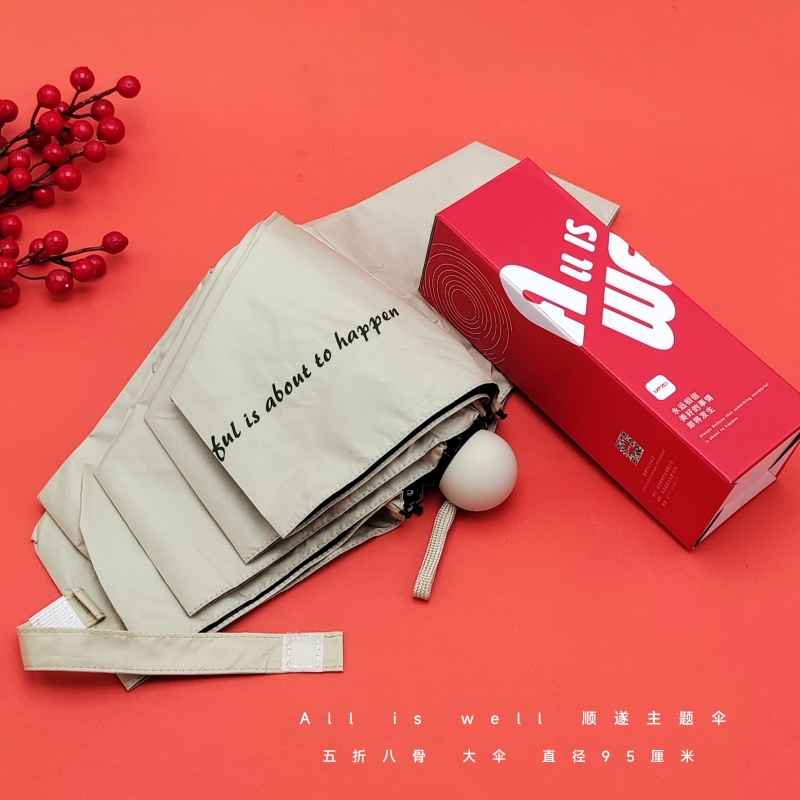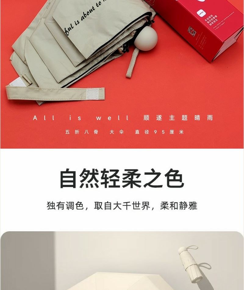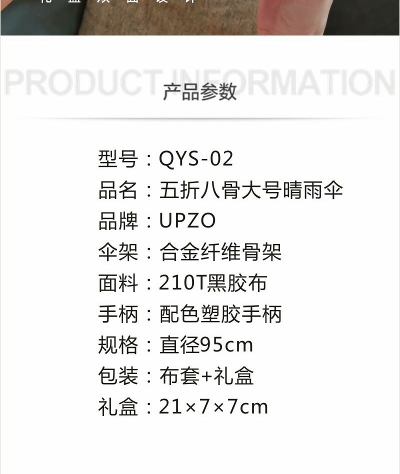 型号:QYS-02 规格:直径95CM 伞架:合金纤维骨架 面料:210T黑胶布 手柄:配色塑胶手柄 包装:布套+礼盒 颜色:梧桐米 礼盒:21*7*7CM