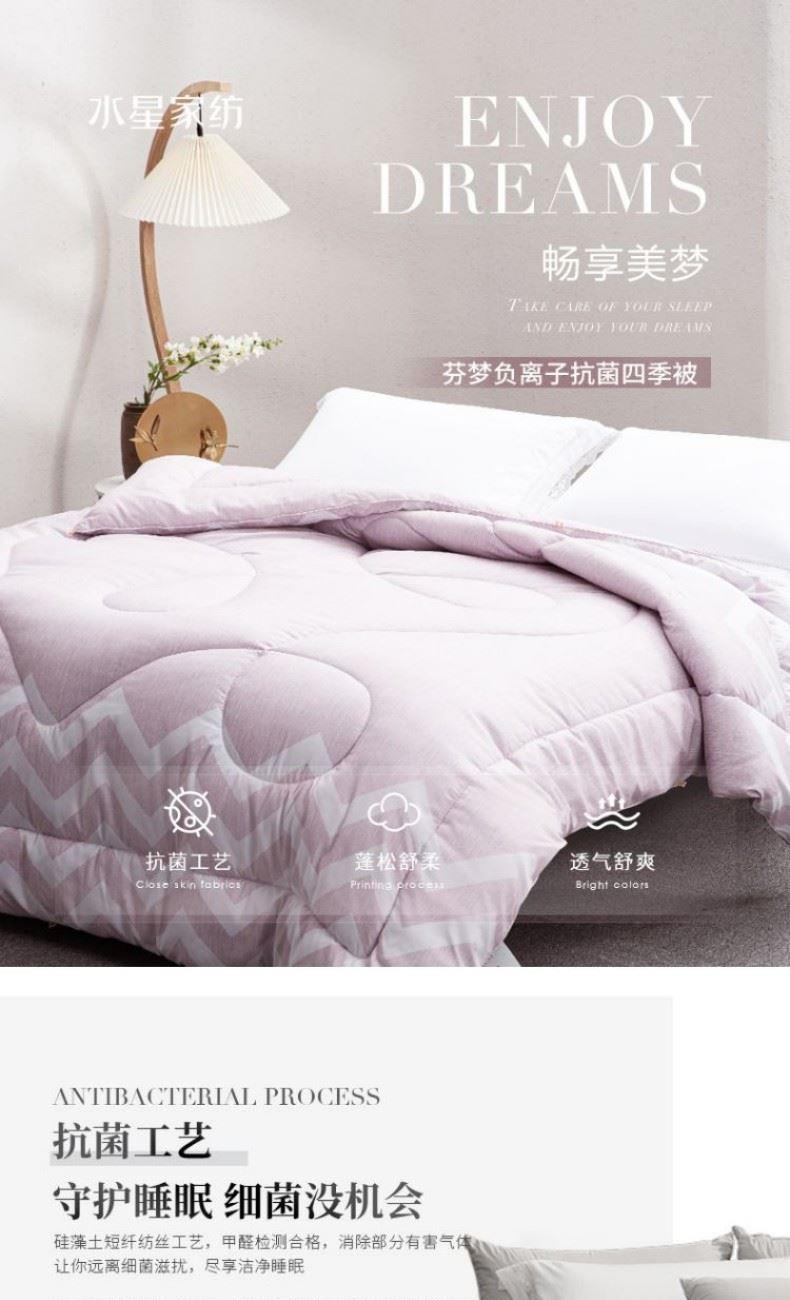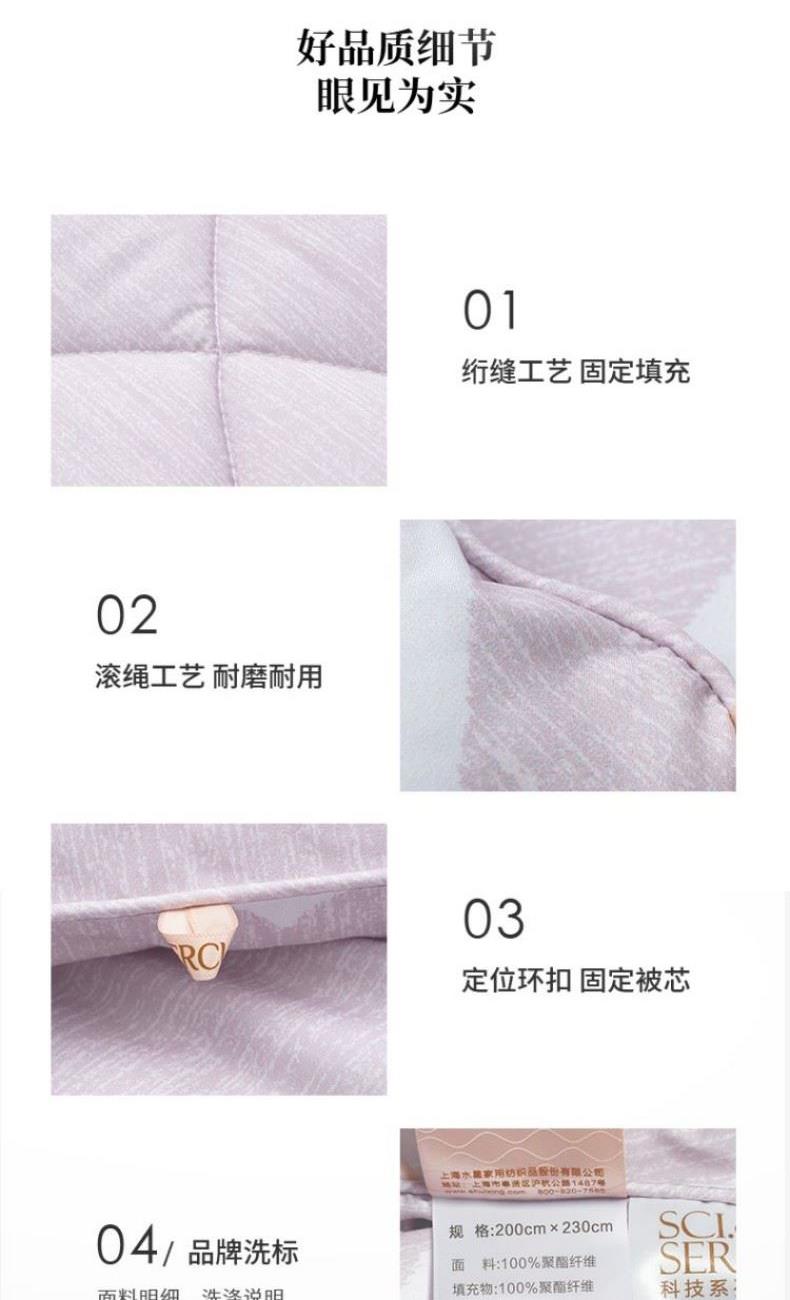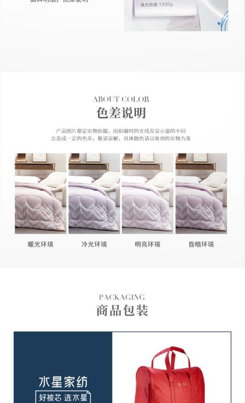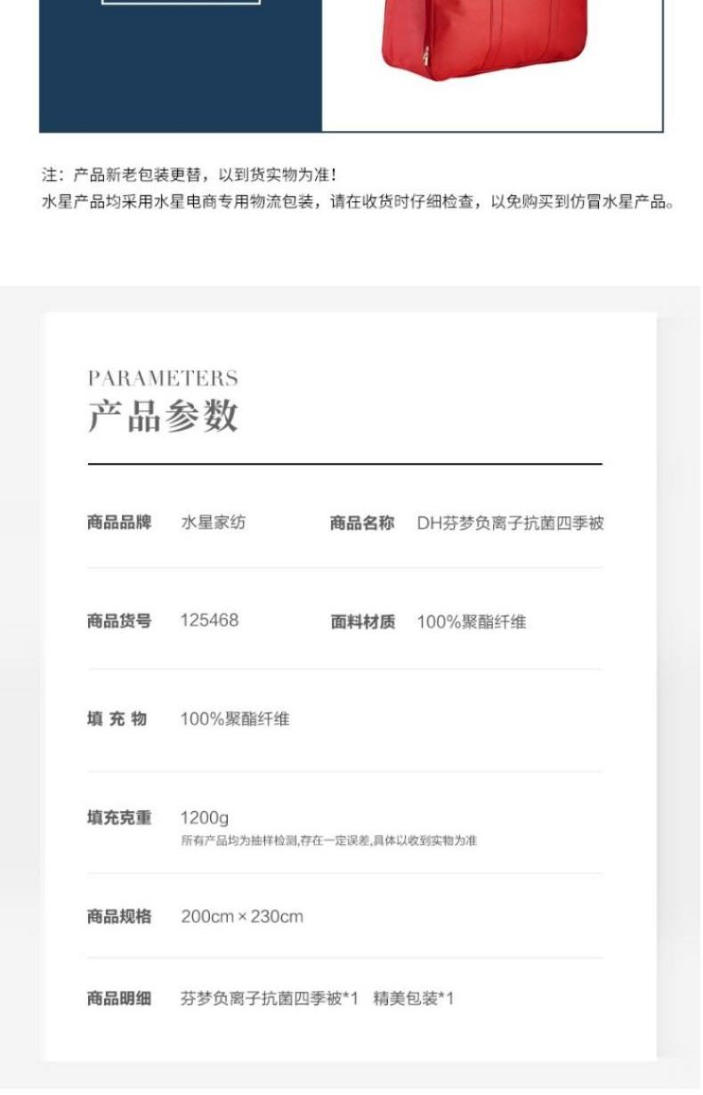 面料:聚酯纤维 规格:200*230cm 填充物:聚酯纤维(内含七孔聚酯纤维;50%硅藻土纤维) 填充克重:1200g