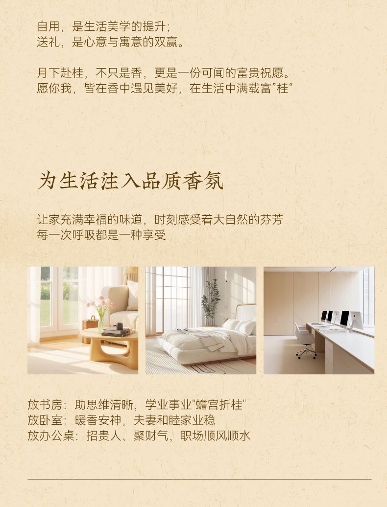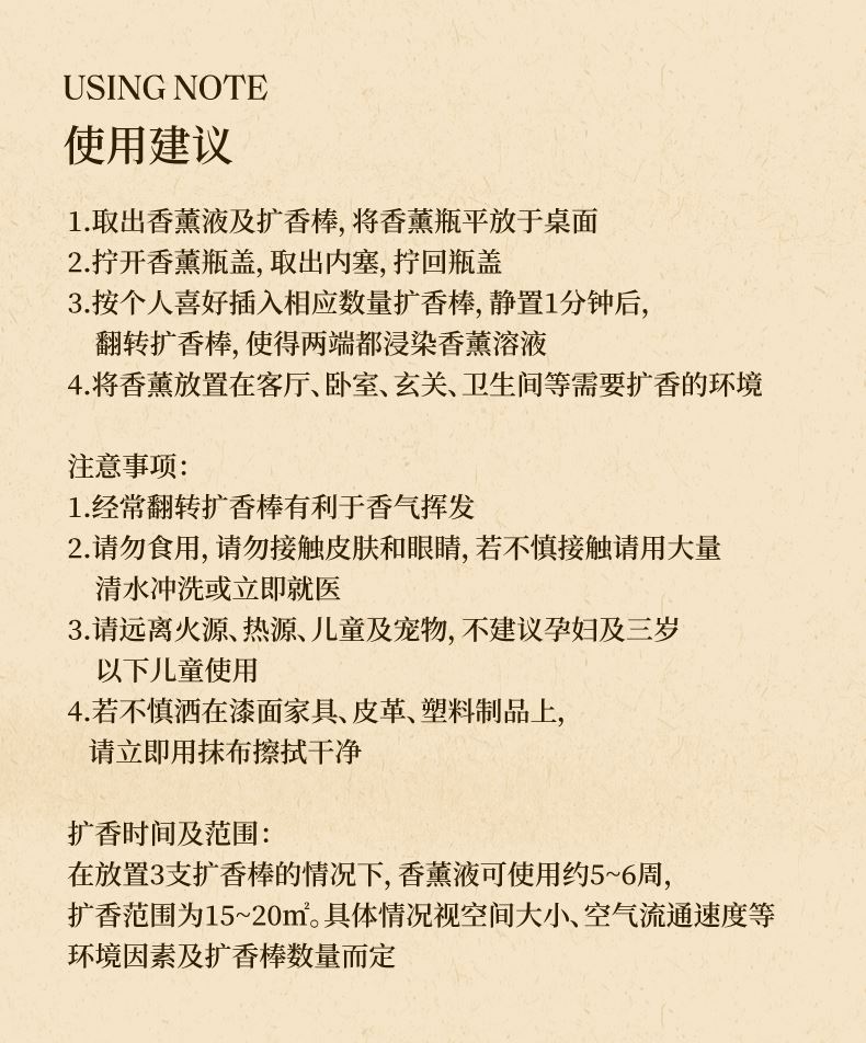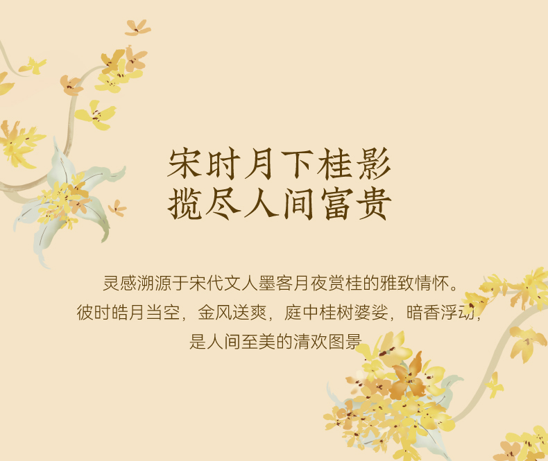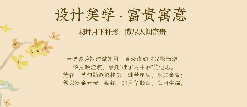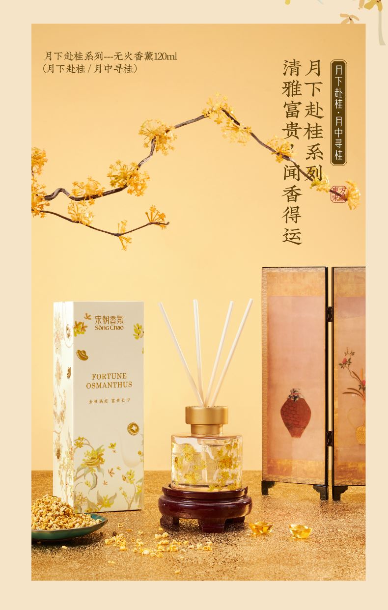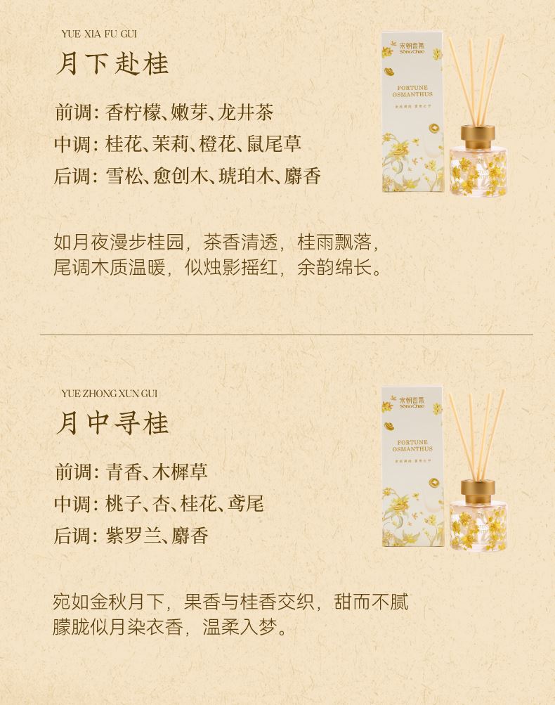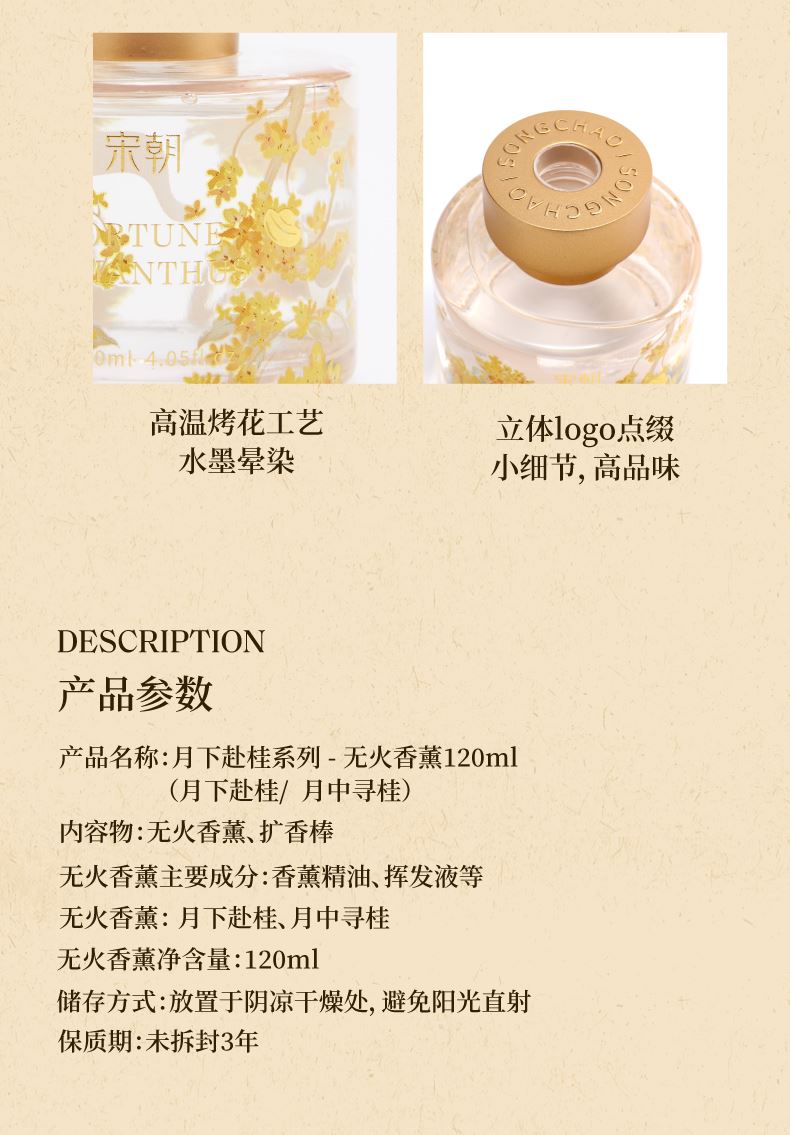 【规格】无火香薰净含量:120ml 【香型】月下赴桂(复合型桂花香)、月中寻桂(还原型桂花香) 【生产日期】见包装喷码 【保质期】未拆封3年 【储存方法】请置于阴凉处,避免阳光直射