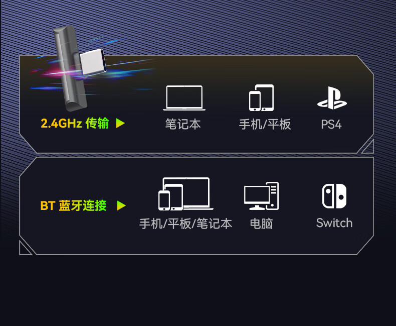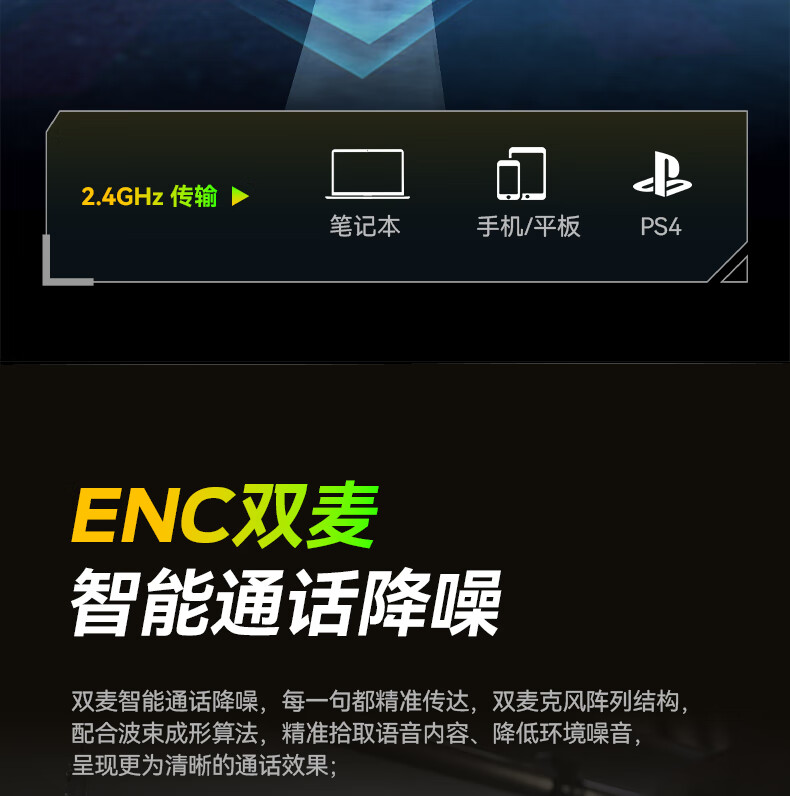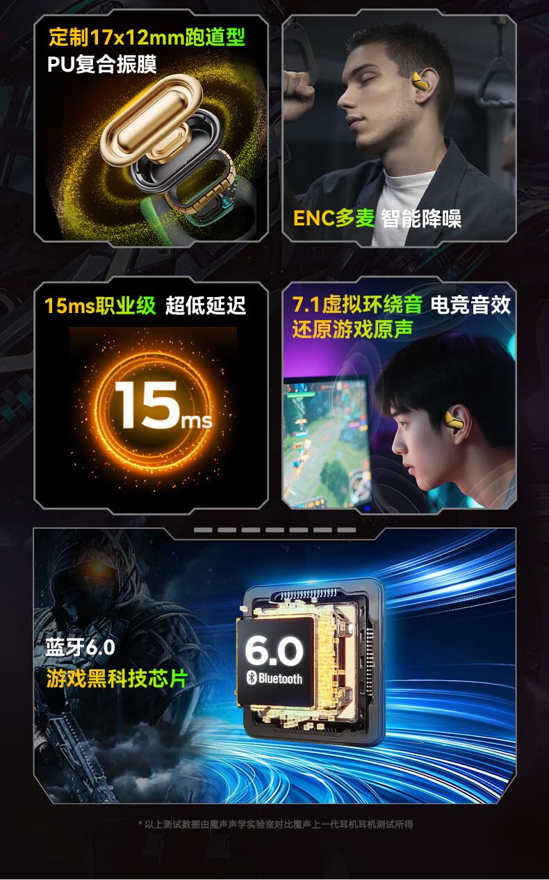 芯片方案:JL7016G8+JL6976M 蓝牙版本:6.0 喇叭规格:1712mm 音频解码:AAC、SBC 播放时长:约12小时(50%音量) 通话时长:约10小时(50%音量) 电池规格:耳机80mAh,充电仓700mAh 充电时长:耳机约1.5小时,充电仓约2小时 充电次数:仓给耳机充电约3次 充电接口:Type-C(5V/1A) 防水等级:耳机IPX5,充电仓不防水 2.4G+蓝牙6.0两种连接方式,更长距离更稳定连接 游戏电竞音画同步,实现极低的延迟。 减少干扰延迟,避免因信号干扰而产生的额外延迟,确保游戏过程流畅。 高码率音频传输,能够接收更高质量的音频数据,从而还原出丰富的音频细节。 宽频带音频传输,从低频的爆炸声、重低音效果到高频的武器射击清脆声、角色的细微喘息声等都能清晰呈现
