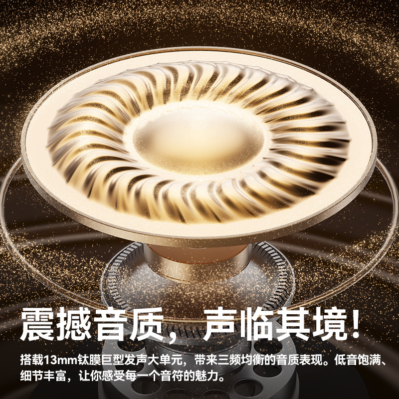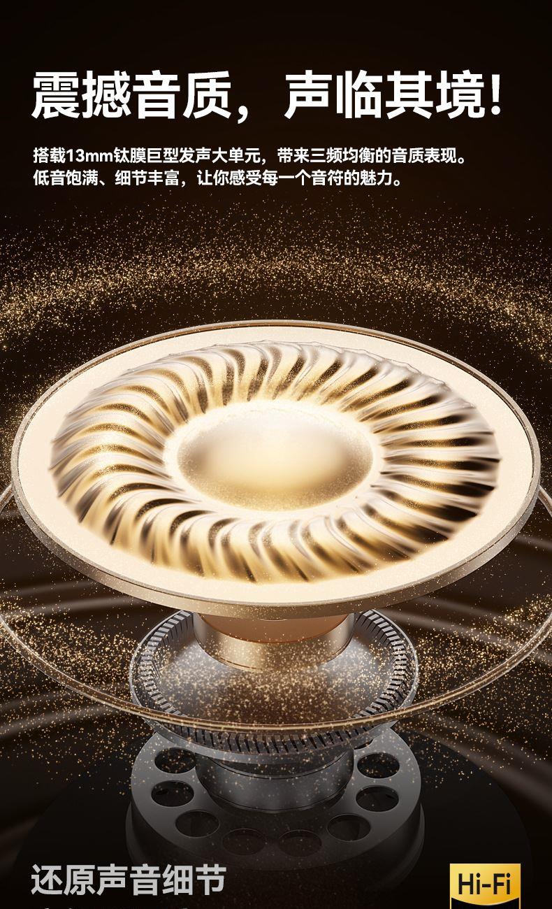 搭载13mm钛膜巨型发声大单元,带来三频均衡的音质表现。