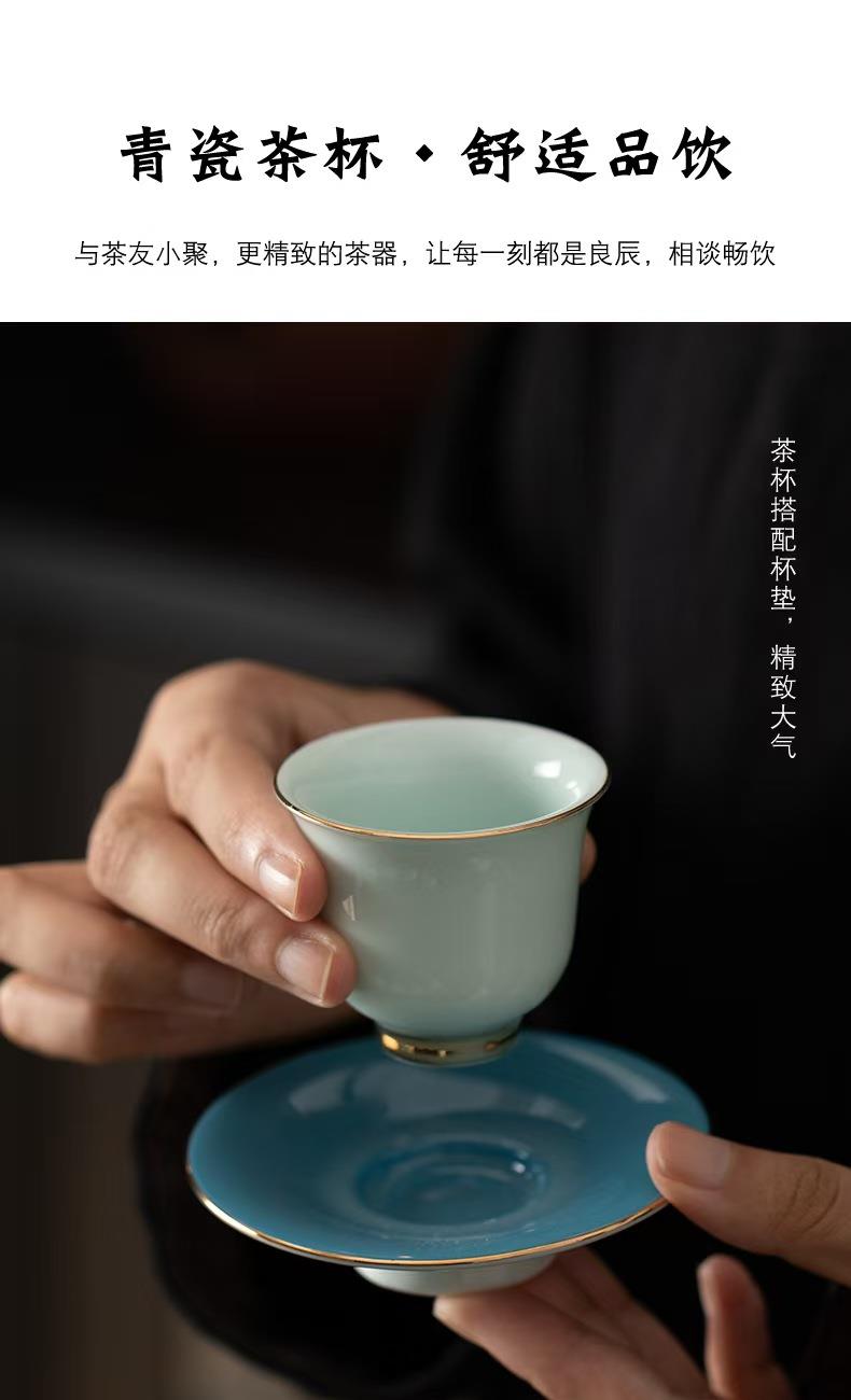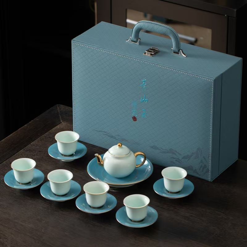 配制:1壶 6杯 1壶承 6碟 1锦盒 规格:壶:12*8cm 公道杯:9.2*9.1cm 茶杯:6cm*5cm 手提锦盒:39*27*13cm 材质:青山玉 24K真金 推荐说明:青山玉是青瓷新品,以瓷质细腻,线条明快流畅,色泽纯洁而斑斓著称。青如玉,明如镜,声如磬,描24K真金奢华装饰,被称为瓷器之花。