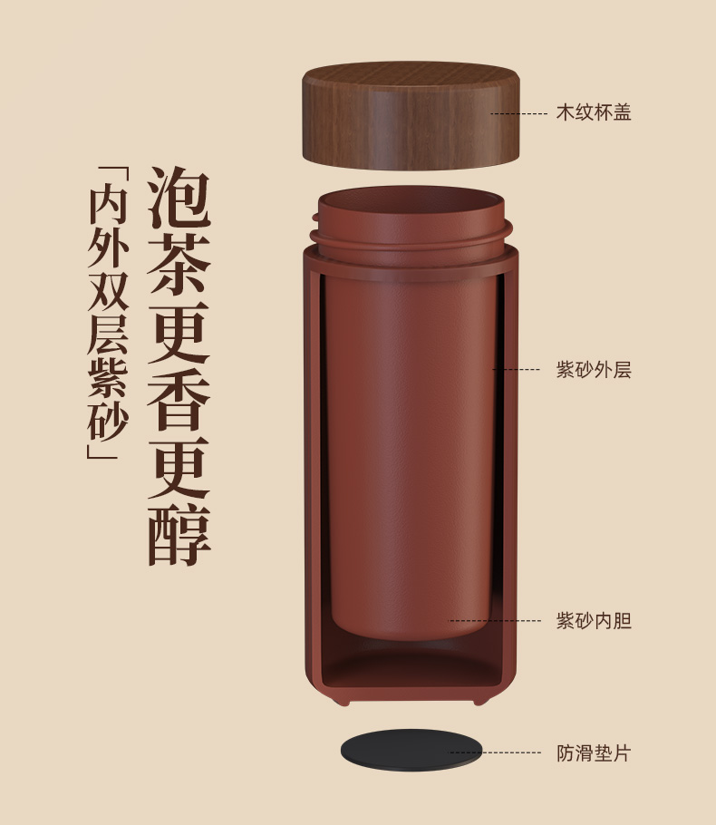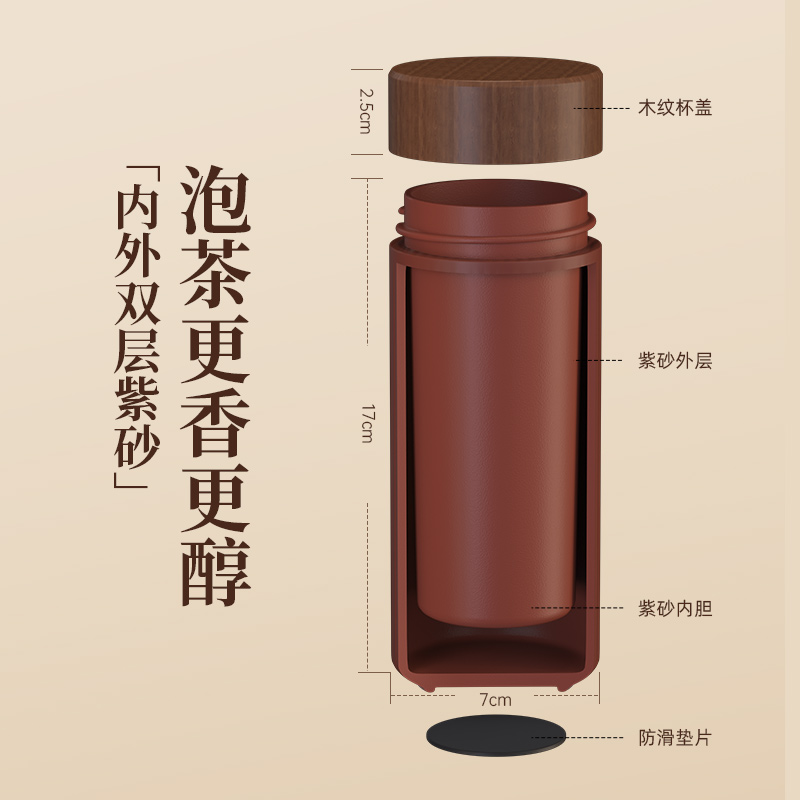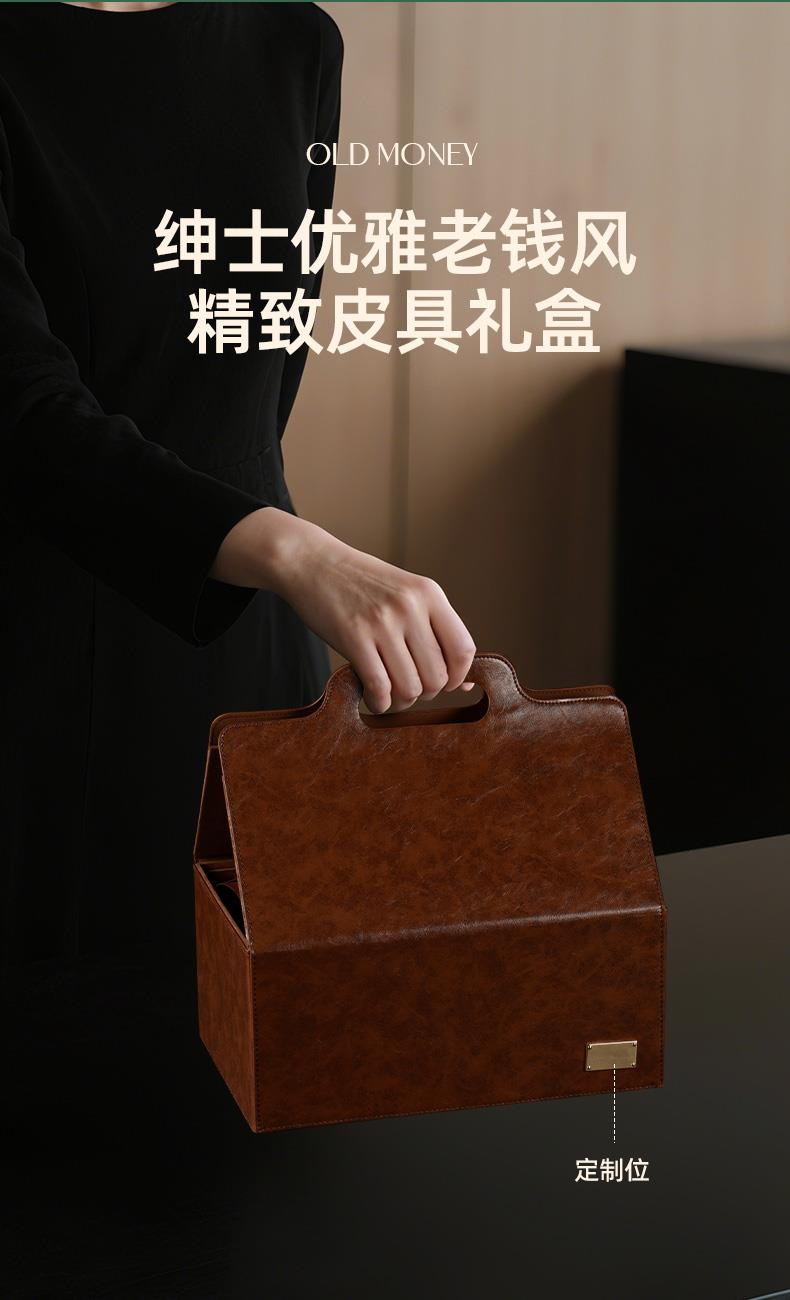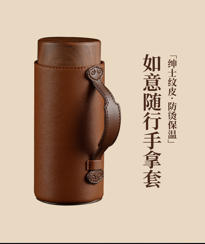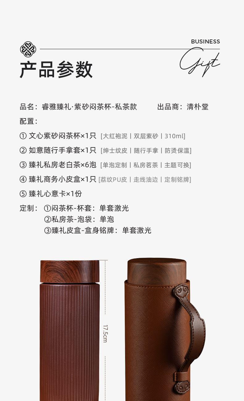 配置 · ① 文心紫砂闷茶杯×1只 【大红袍泥丨双层紫砂丨310ml】 ② 如意随行手拿套×1只 【绅士纹皮丨随行手拿丨防烫保温】 ③ 臻礼私房老白茶×6泡 【单泡定制丨私房茗茶丨主题可换】 ④ 臻礼商务小皮盒×1只 【荔纹PU皮丨走线油边丨定制铭牌】 ⑤ 臻礼心意卡×1份