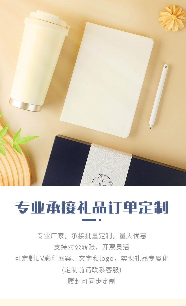 1.觅芳境--双饮咖啡杯 容量:500ml 内胆:316 外壳:304 杯盖:食品级PP 吸管:食品级硅胶 吸嘴:食品级PP 密封圈:食品级硅胶 2.自洁转动签字笔 规格:0.5mm 3.A5平装笔记本 规格:80张100克太阳纸 (64张点格纹,16张空白纸张) 礼盒尺寸:340*255*100(MM) 手提袋尺寸:350*265*110(MM)
