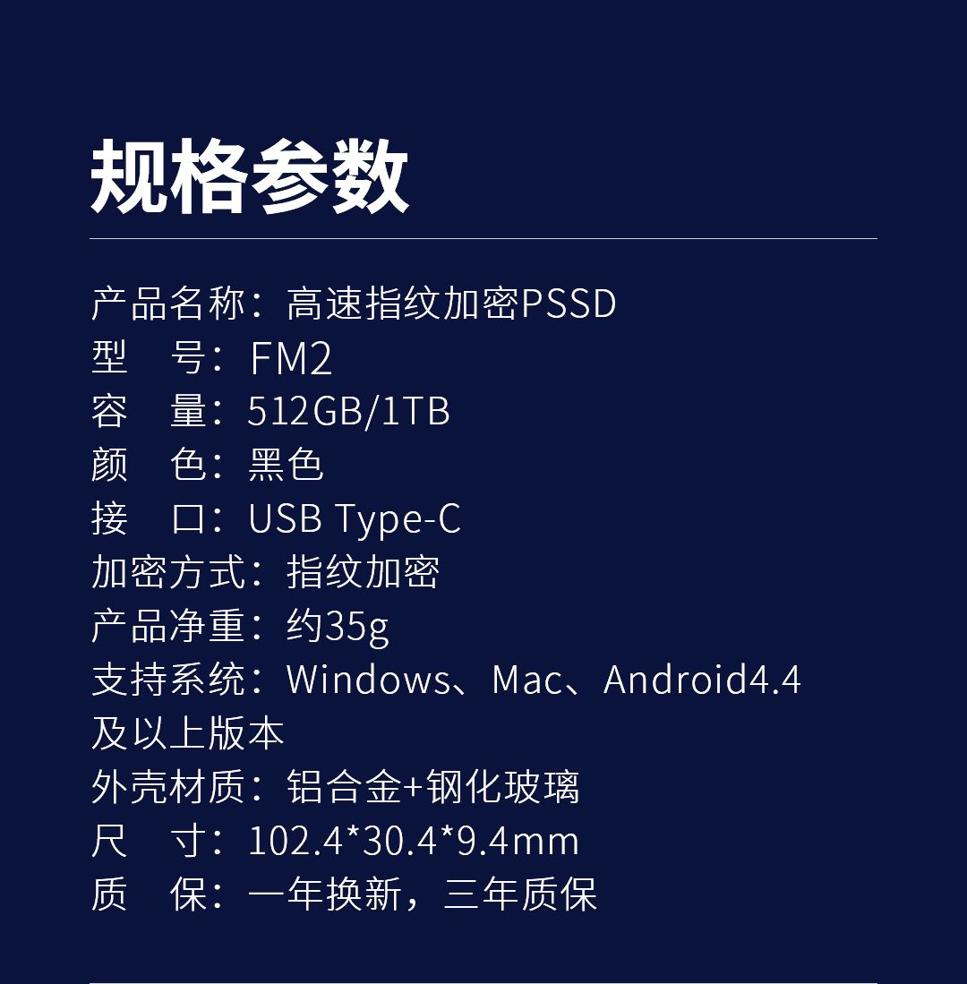 采用Type-C接口 芯片:固态级TLC颗粒高速传输 速度:420mb/s(写入速度) 530mb/s(读取速度) 电镀金属效果,美观大气 专属礼盒包装,送礼佳品 产品尺寸:102*30*9mm 包装尺寸:135*80*30mm 单品重量:35g