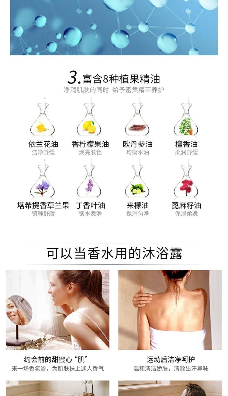 香水级氛(馥郁香气 丝丝索饶),产品功效:清洁皮肤,滋润美肌,留香更长,植物精油成分,细致渗透力,肌肤易吸收,打造润泽美肌。 润体乳:1、香水配方,持久留香; 2、添加3钟保湿精油保湿身体乳; 3、低刺激配方,5不添加敏感肌肤也使用(不添加甲酸酯、人工色素、三乙醇胺、丙二醇、矿物油)