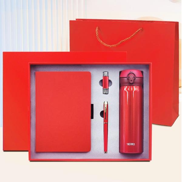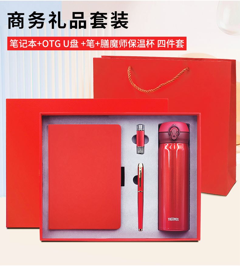 礼盒配置: 1、膳魔师保温杯(500ml)尺寸225X70mm 2、A5搭扣硬皮PU皮笔记本 3、电脑、手机双用16G(Type-c) OTG优盘 4、金属烤漆签字笔 5、包装盒尺寸:328x263x75mm 6、手提袋尺寸:335x293x85mm 7、重量:27kg/箱
