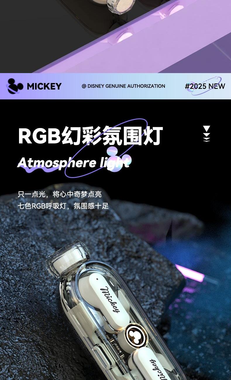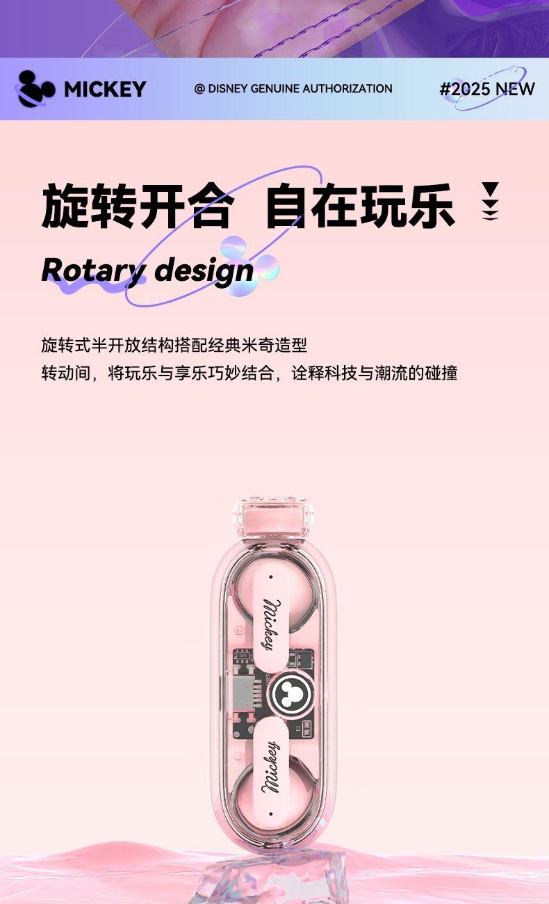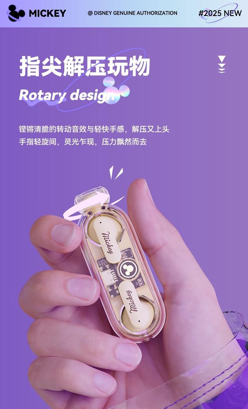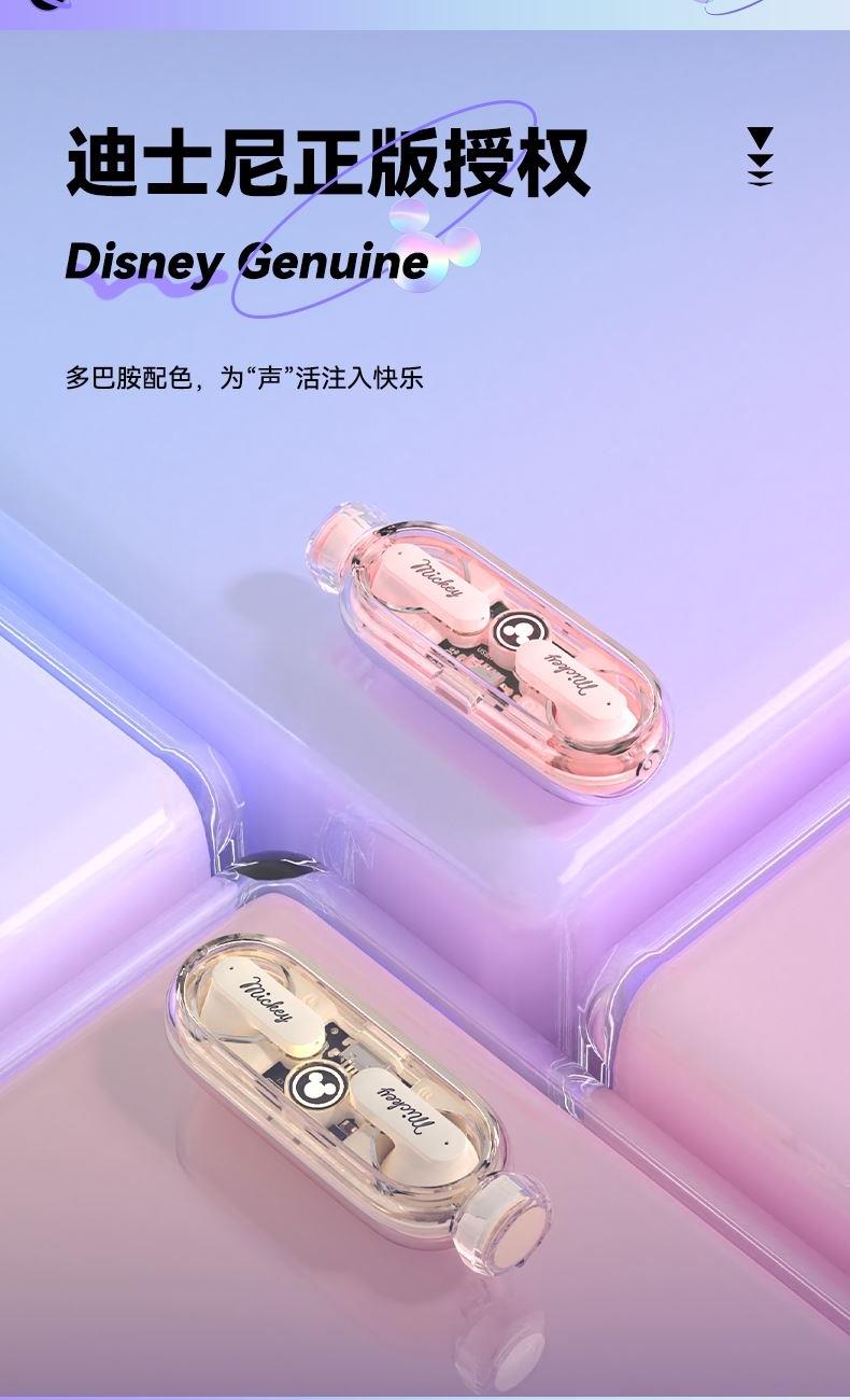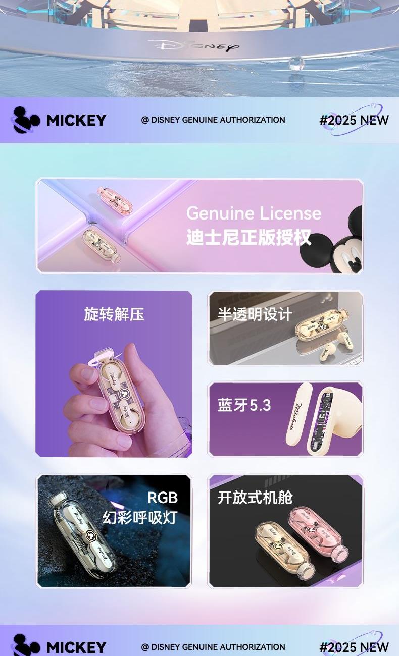 蓝牙版本:V5.3 供电电压:DC3.7V 喇叭尺寸:13MM 电池容量:250mah(充电仓);30mah(耳机) 使用时长:4H 频率:2.4GHz 充电口类型:Type-C 1.迪士尼正版授权; 2.经典旋转设计,解压上头; 3.RGB幻彩呼吸灯,氛围感十足; 4.半透明设计,赛博风主板; 5.胶囊机身,附赠精美挂绳,轻巧便携; 6.游戏音乐双模式,13MM动圈单元;