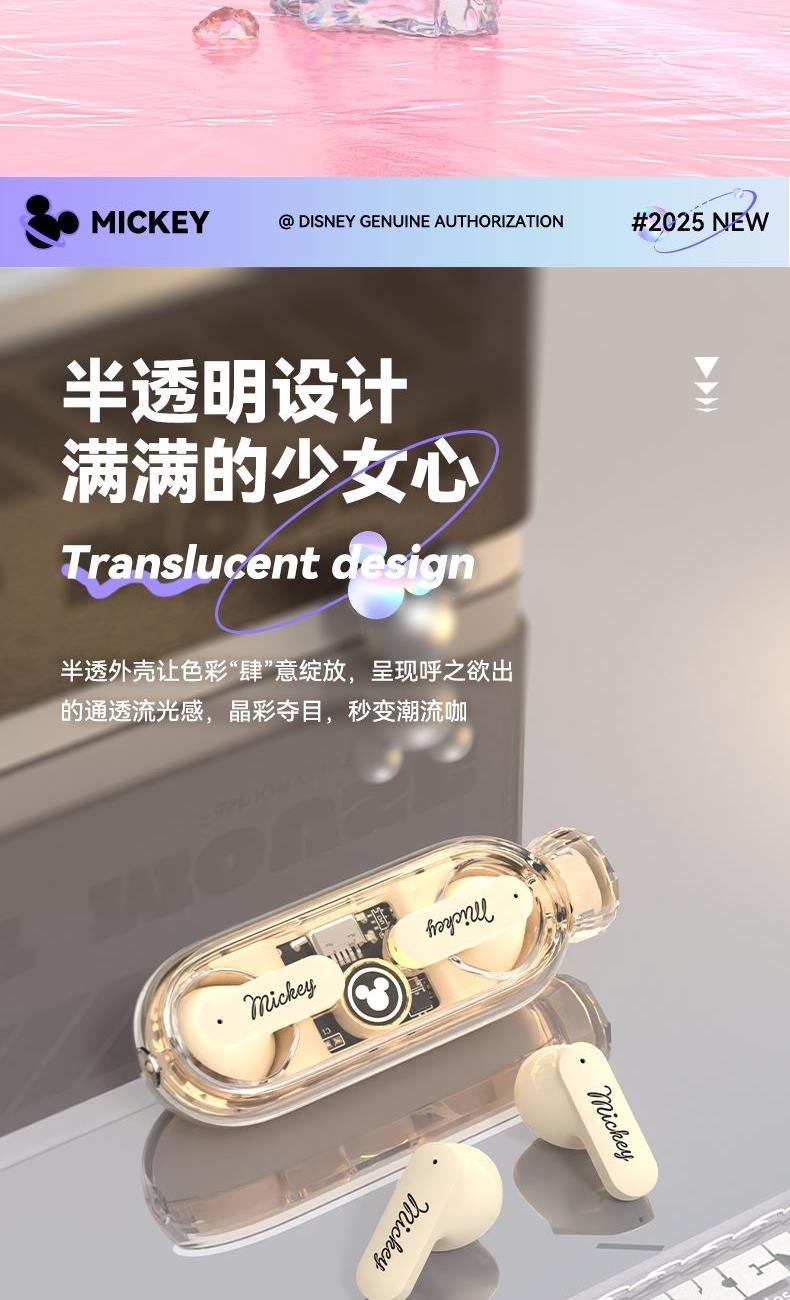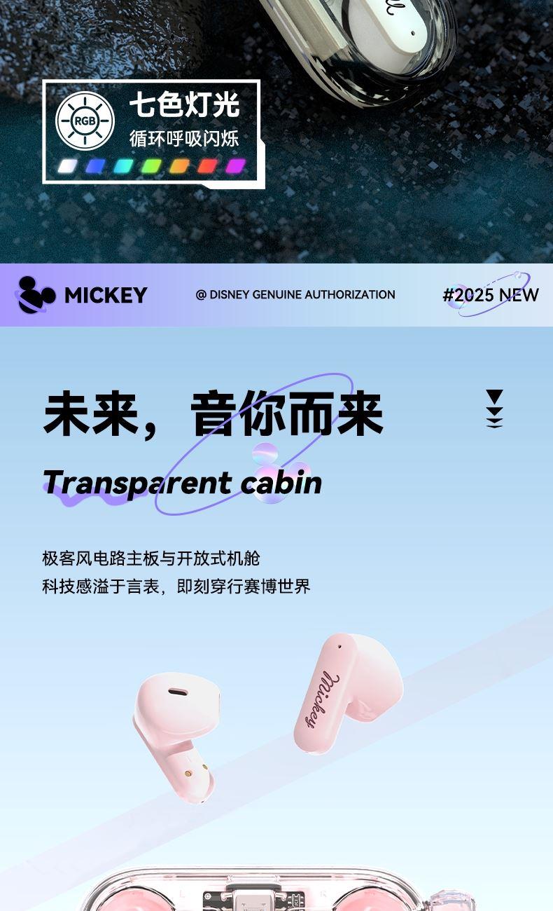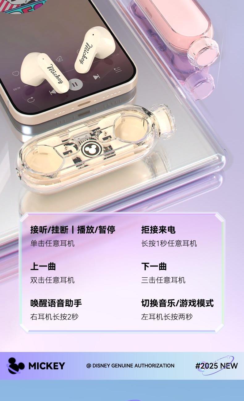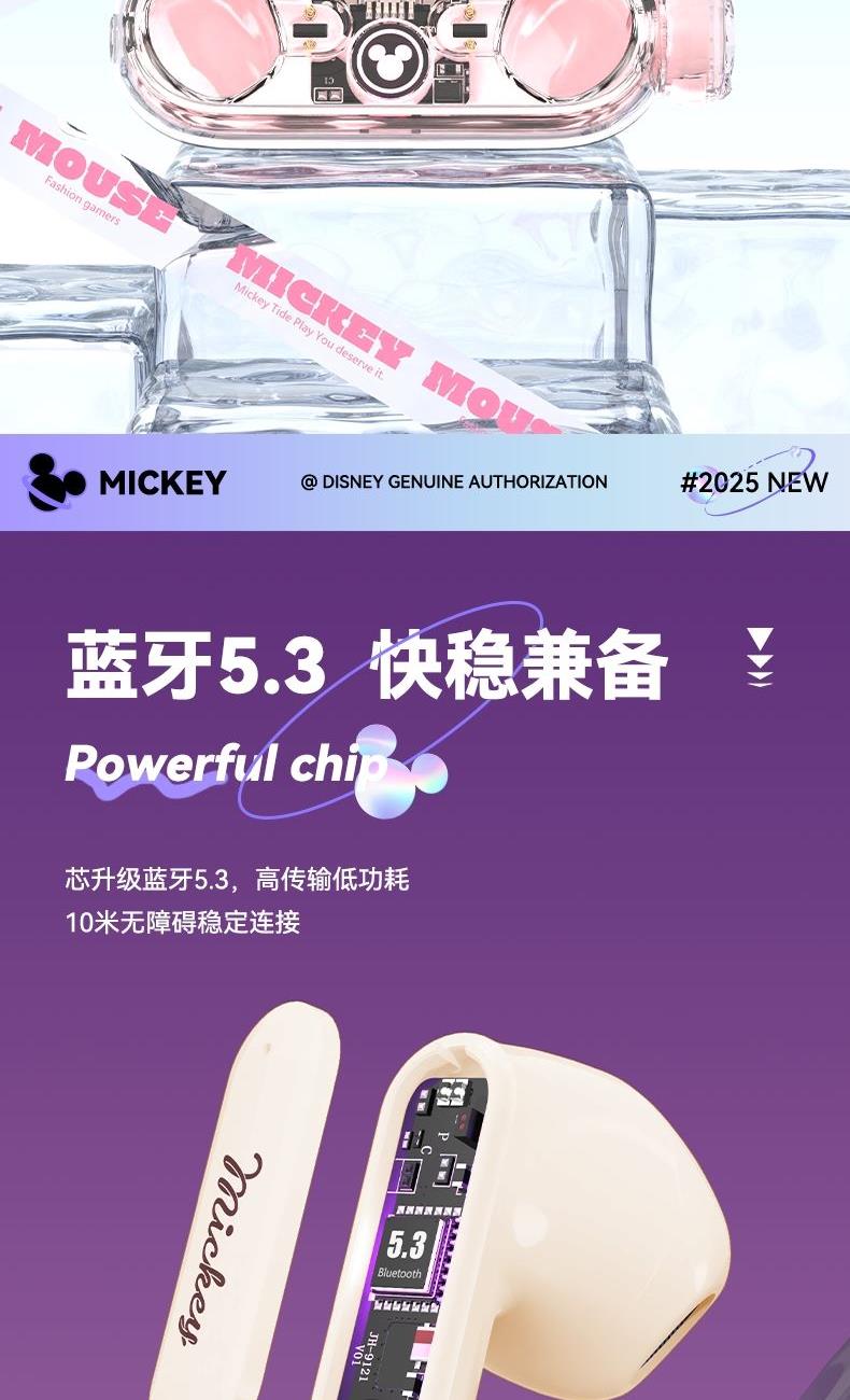 蓝牙版本:V5.3 供电电压:DC3.7V 喇叭尺寸:13MM 电池容量:250mah(充电仓);30mah(耳机) 使用时长:4H 频率:2.4GHz 充电口类型:Type-C 1.迪士尼正版授权; 2.经典旋转设计,解压上头; 3.RGB幻彩呼吸灯,氛围感十足; 4.半透明设计,赛博风主板; 5.胶囊机身,附赠精美挂绳,轻巧便携; 6.游戏音乐双模式,13MM动圈单元;