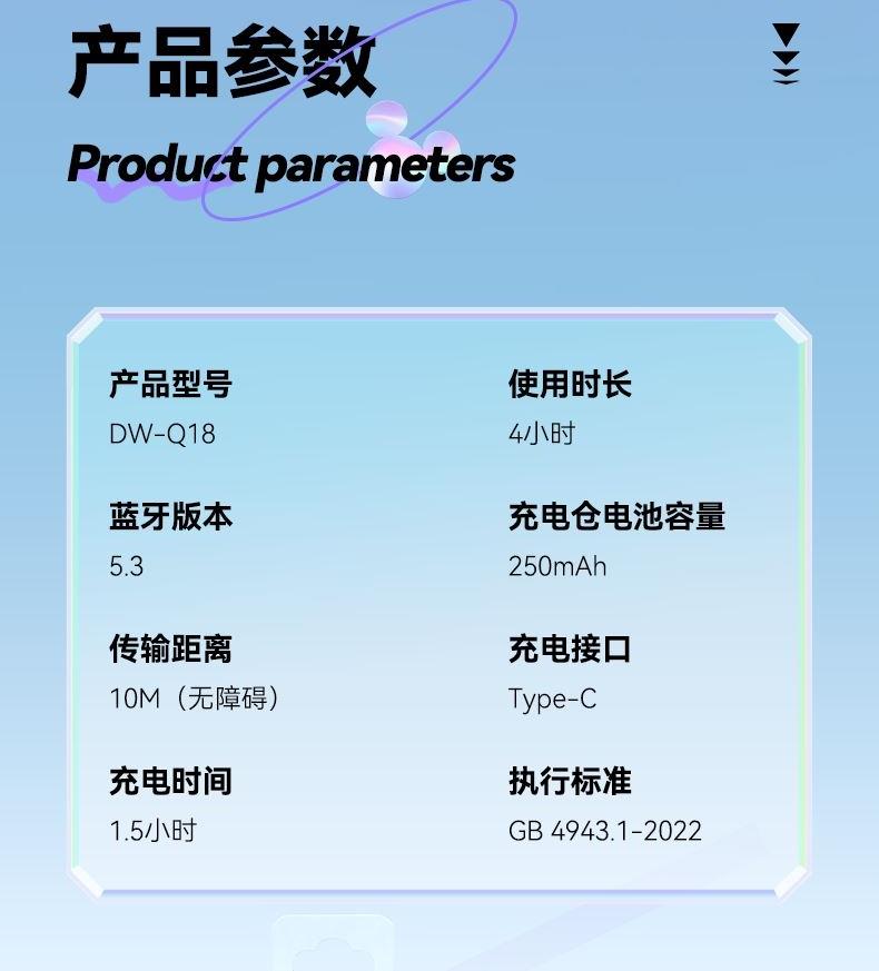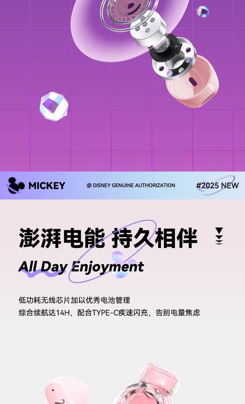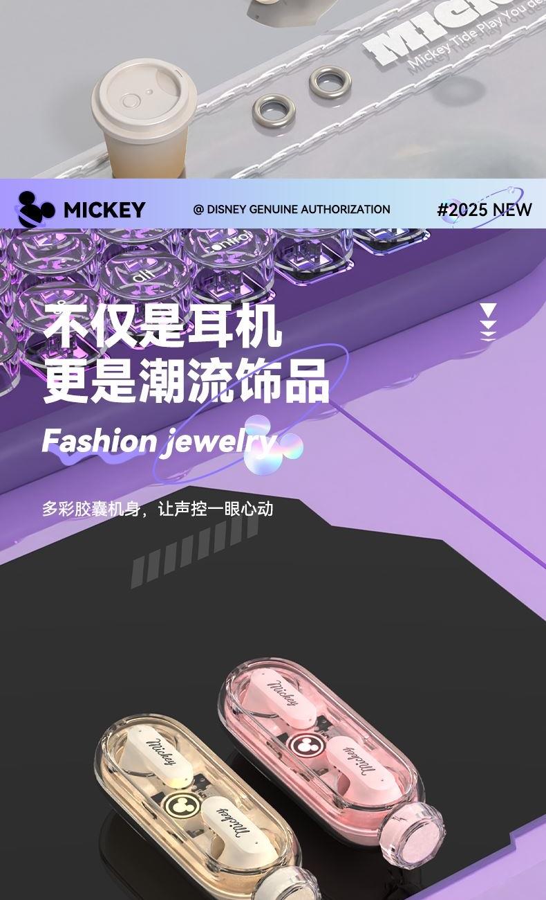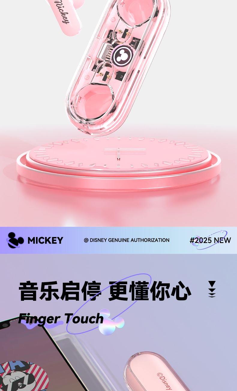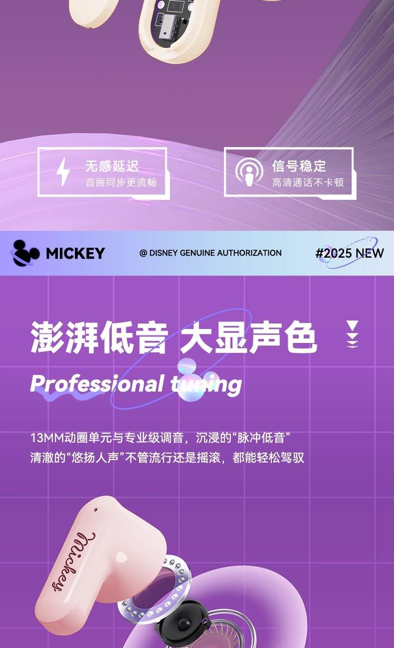 蓝牙版本:V5.3 供电电压:DC3.7V 喇叭尺寸:13MM 电池容量:250mah(充电仓);30mah(耳机) 使用时长:4H 频率:2.4GHz 充电口类型:Type-C 1.迪士尼正版授权; 2.经典旋转设计,解压上头; 3.RGB幻彩呼吸灯,氛围感十足; 4.半透明设计,赛博风主板; 5.胶囊机身,附赠精美挂绳,轻巧便携; 6.游戏音乐双模式,13MM动圈单元;