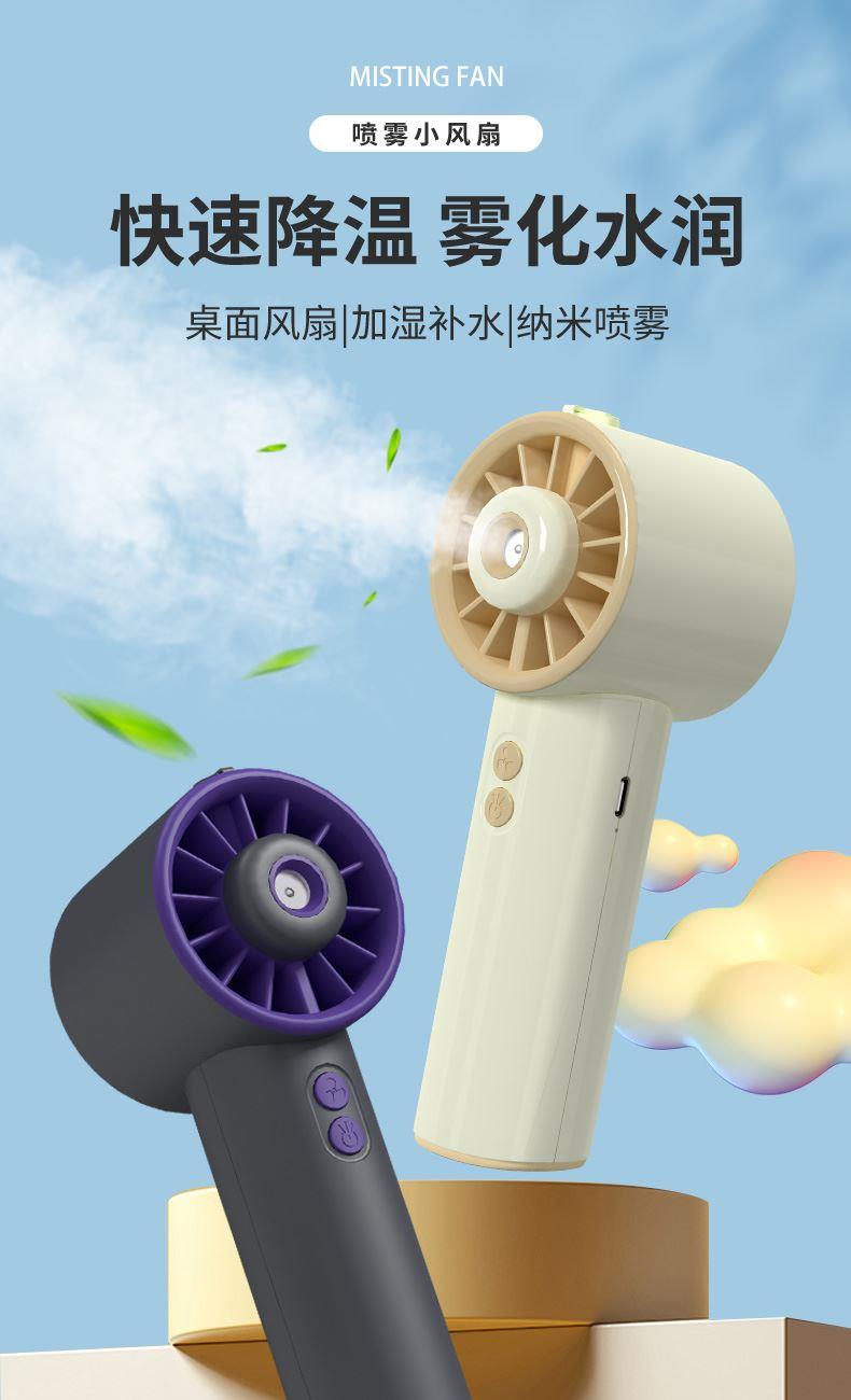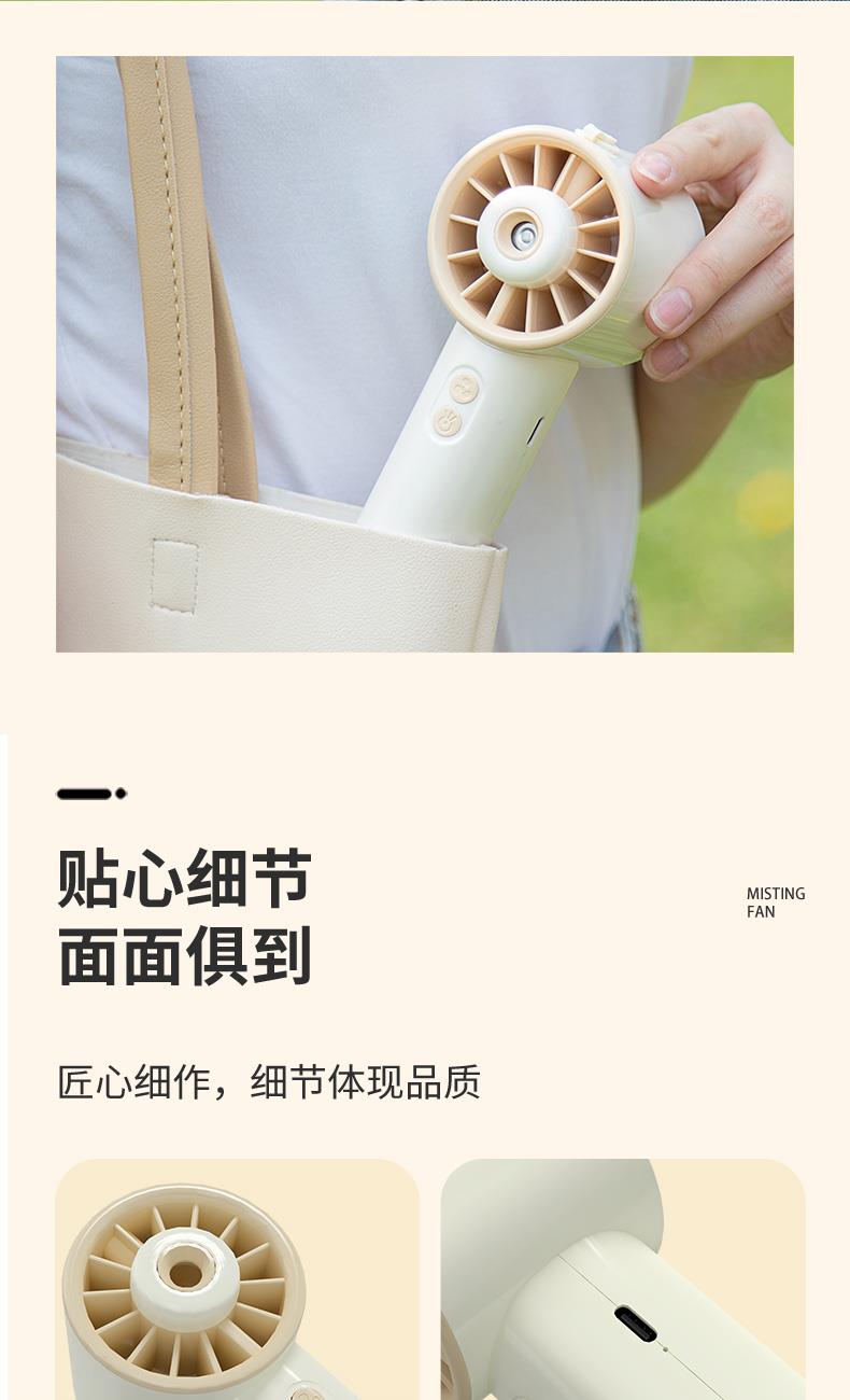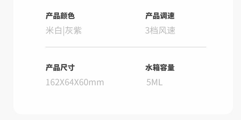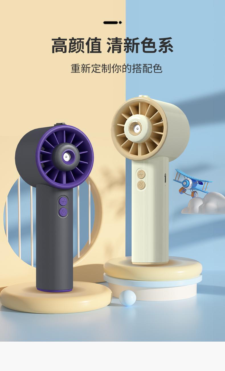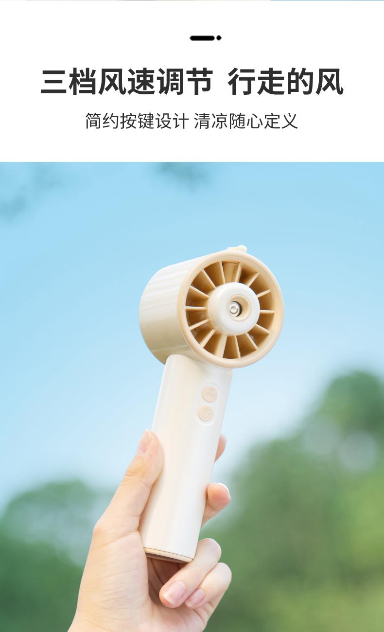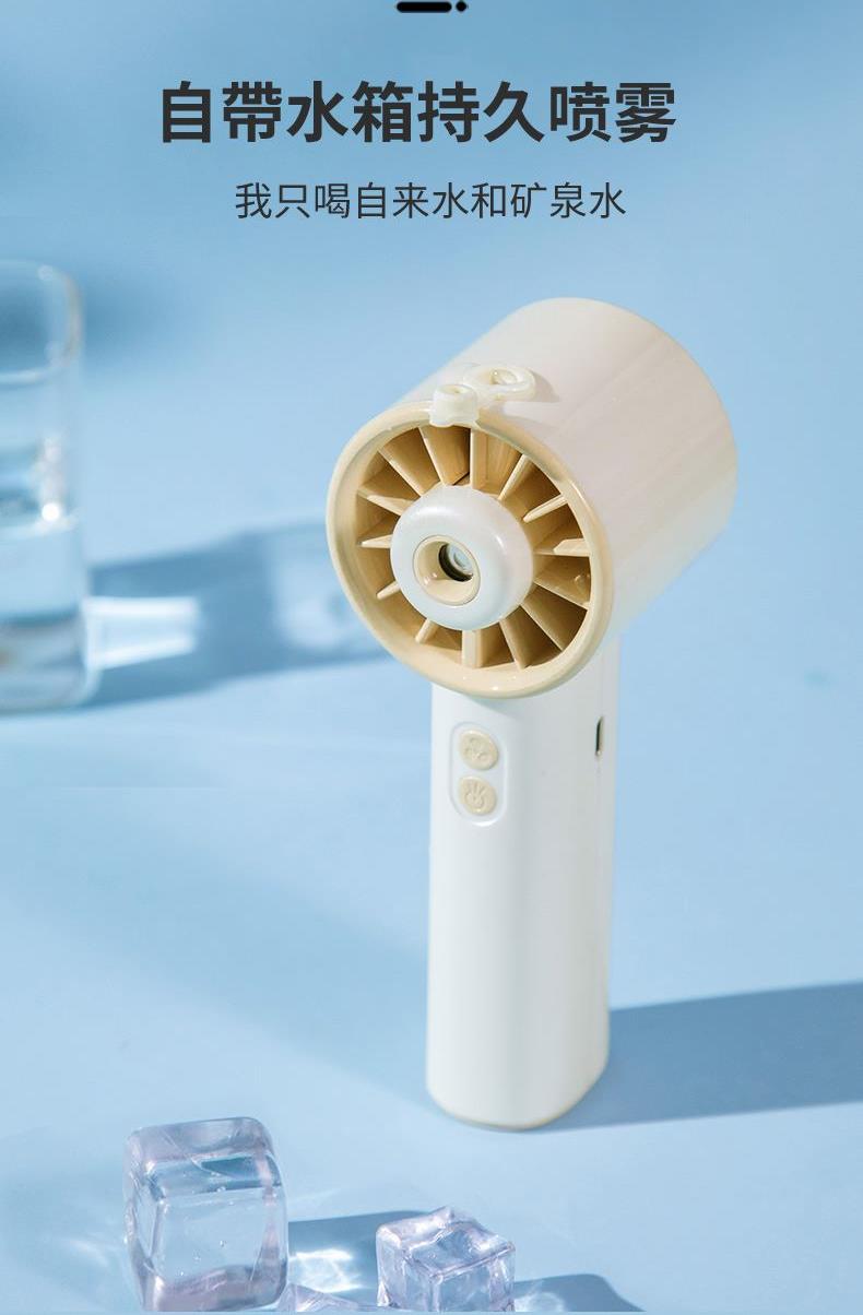 *手持+桌面+喷雾 *三档风力、2000mAh、补水加湿 *材质:ABS/电子元件/硅胶/雾化片 *产品重量:162g/200g *产品尺寸:162*64*60mm *包装盒尺寸:162*64*59.4mm *外箱尺寸:37.8*33.5*34.3CM *整箱重量:12/13KGS *颜色:灰色/香槟色 *标配:风扇、充电线、说明书、水瓶*1