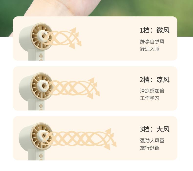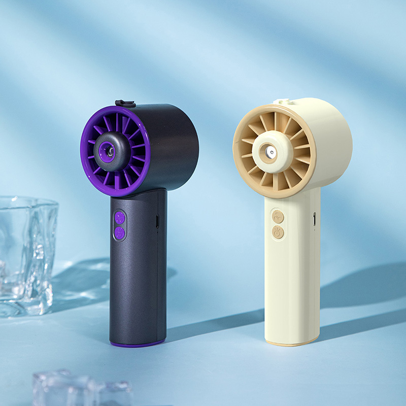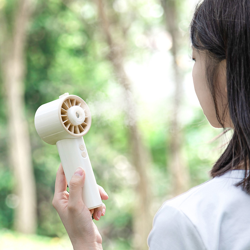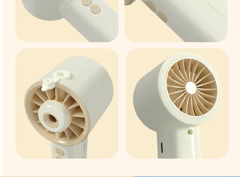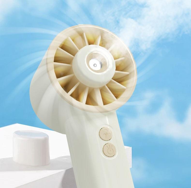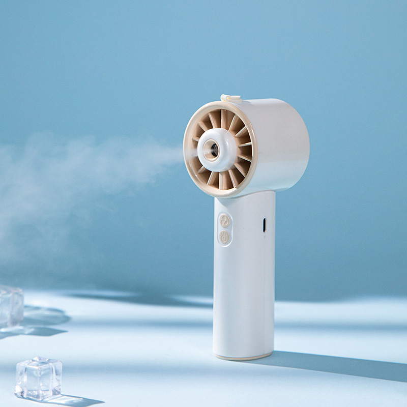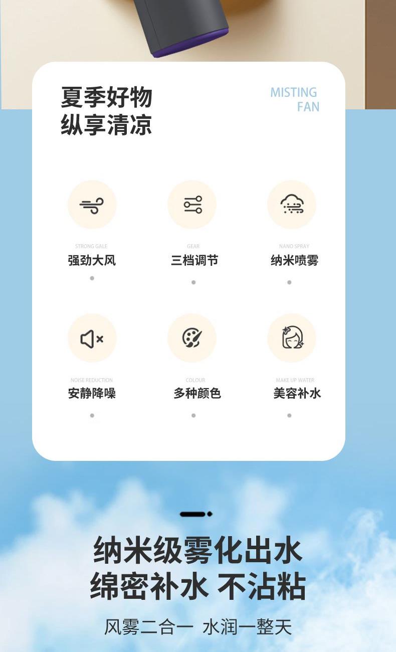*手持+桌面+喷雾 *三档风力、2000mAh、补水加湿 *材质:ABS/电子元件/硅胶/雾化片 *产品重量:162g/200g *产品尺寸:162*64*60mm *包装盒尺寸:162*64*59.4mm *外箱尺寸:37.8*33.5*34.3CM *整箱重量:12/13KGS *颜色:灰色/香槟色 *标配:风扇、充电线、说明书、水瓶*1