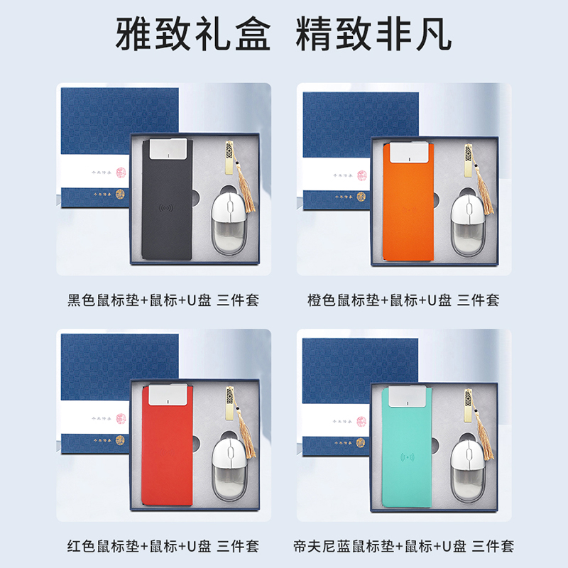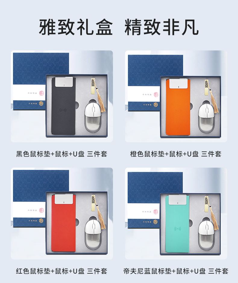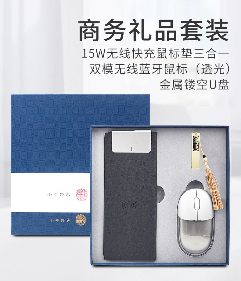 礼盒配置: 1、无线充鼠标垫(15W快充) 2、双模无线蓝牙鼠标(透光LOGO) 3、金属镂空16G U盘 4、蓝色包装盒尺寸:228x228x35mm 5、蓝色手提袋尺寸:270x270x55mm 6、重量:32kg
