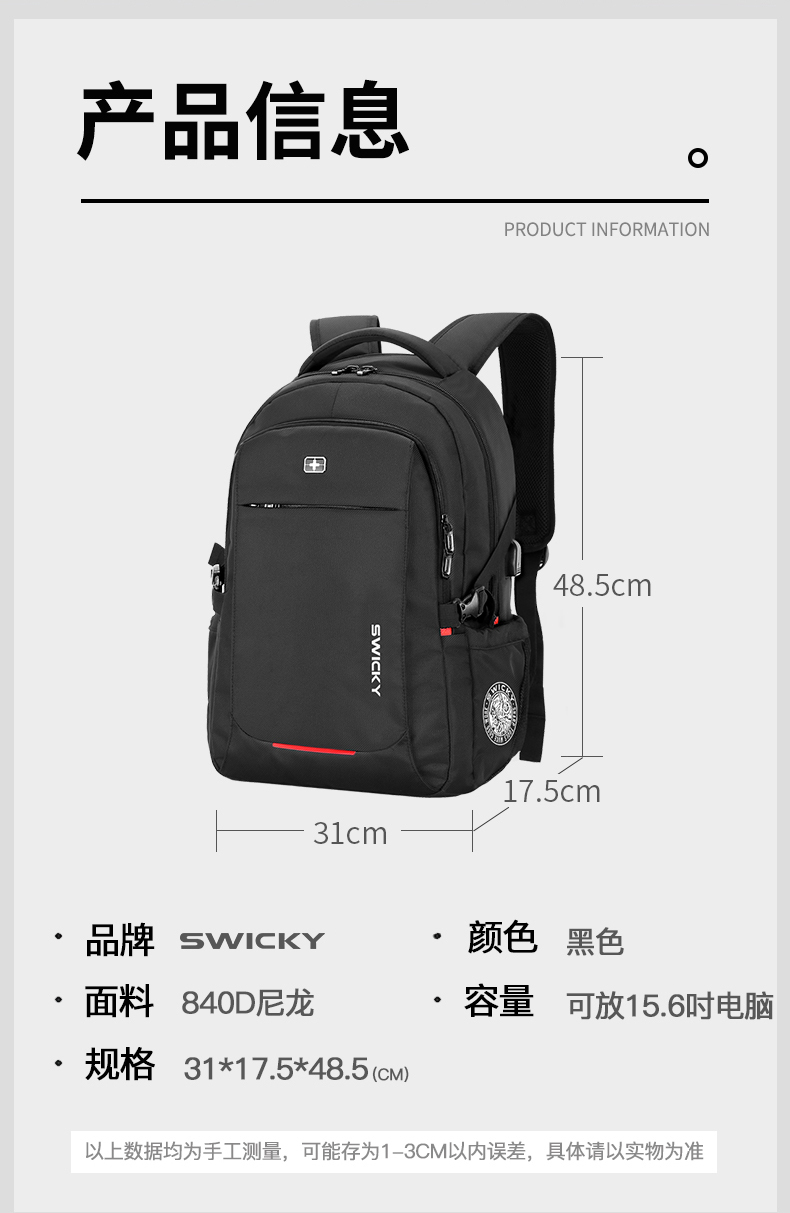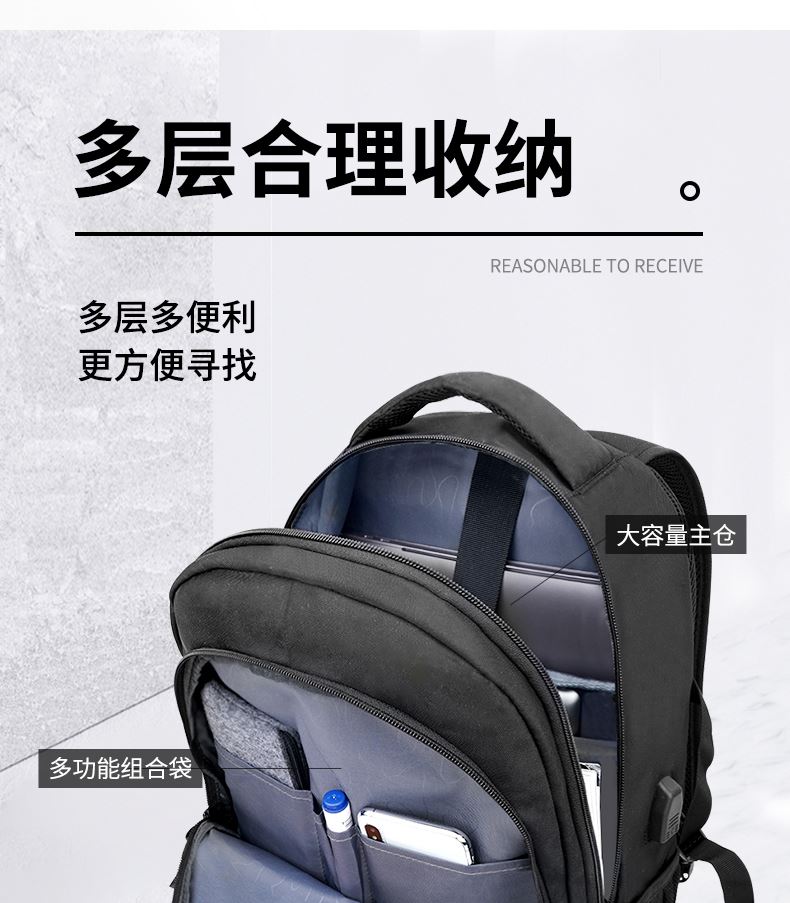 2.超大容量设计可放15.6寸电脑;主袋内加厚电脑隔层;内部多层文组收纳.