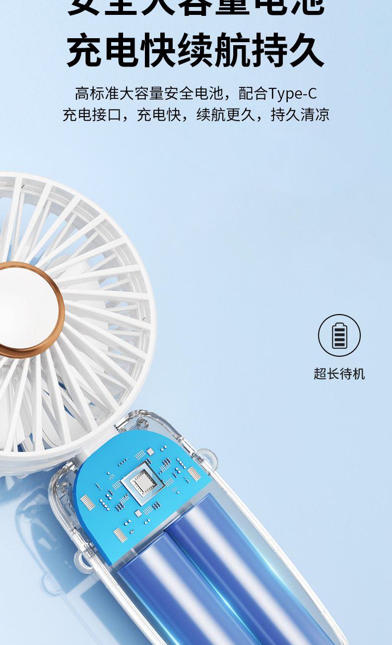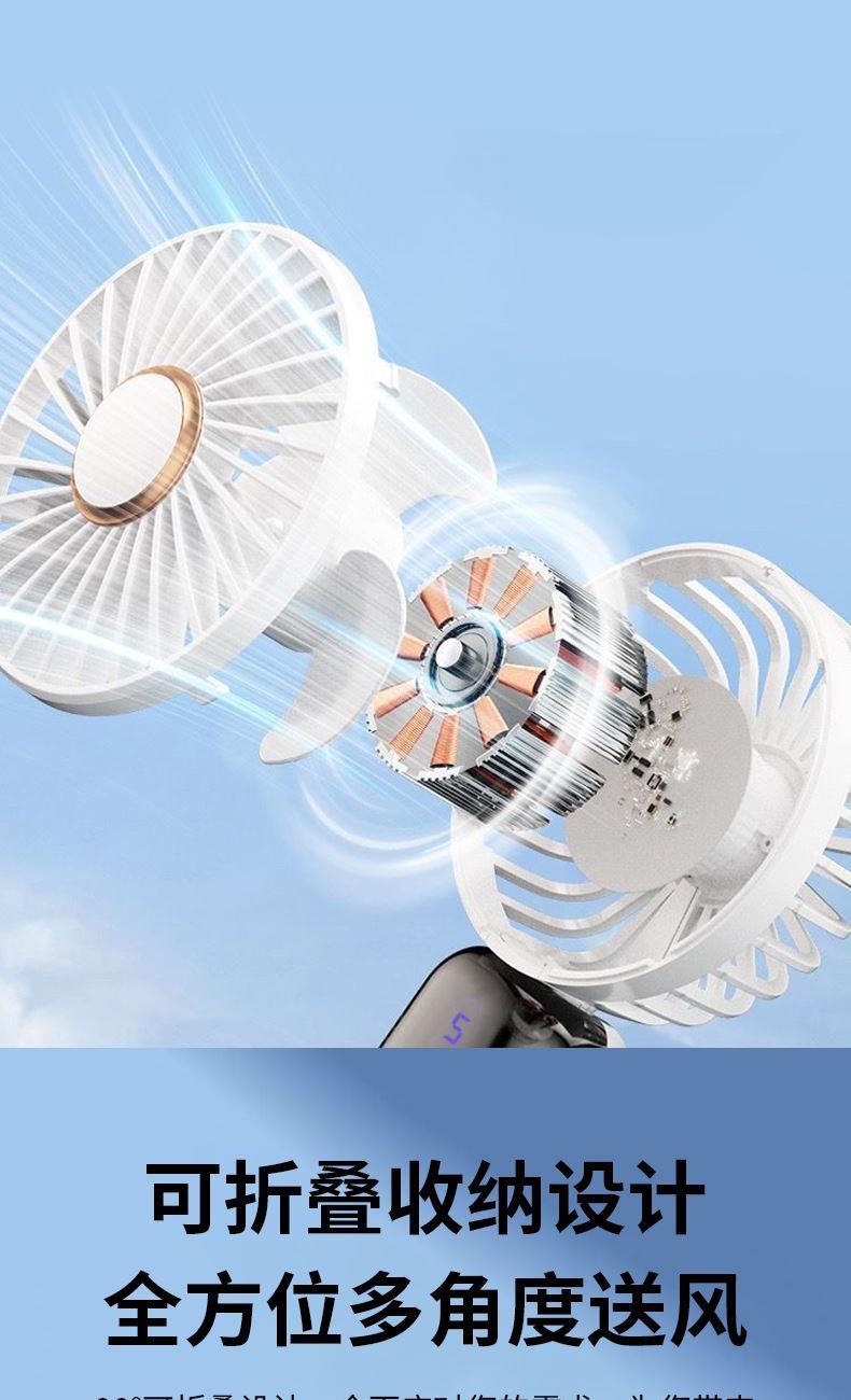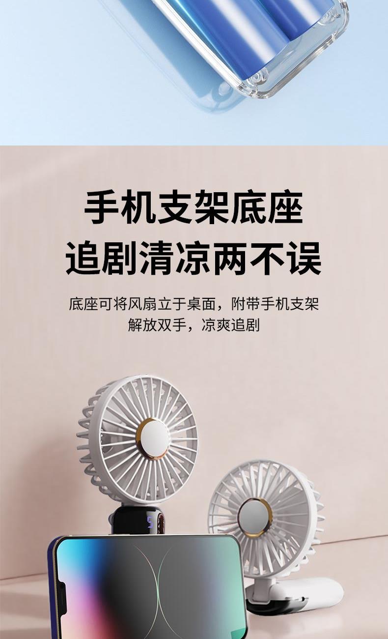 产品型号:F001 产品颜色:白色 产品尺寸:约200*90*40MM(含底座) 产品材质:ABS+电子元件 电池容量:800mAh 额定功率:1W 充电参数:DC5V1A 充电时长:约1小时 使用时长:约1-3小时(视不同档位风量) 使用方式:手持、挂脖、桌面三种 附加功能:手机支架 手持挂脖桌面三用、数显档位、智能数显、五档强劲大风力 产品特点:1、精致小巧,携带方便,通用手持挂脖桌面三种使用方式;2、数显档位,随心调档,一目了然;3、五档可调风量,总有适合您的风力;4、低功耗静音马达,配合消音风叶,风力强劲,静音省电;5、90度可调节出风角度,清凉无死角;6、充插两用,可以一边充电一边使用;7、底座可当手机支架使用,解放双手,尽情娱乐;8、可靠电池,快速充电,超长续航;9、彩盒包装,支持各类定制。
