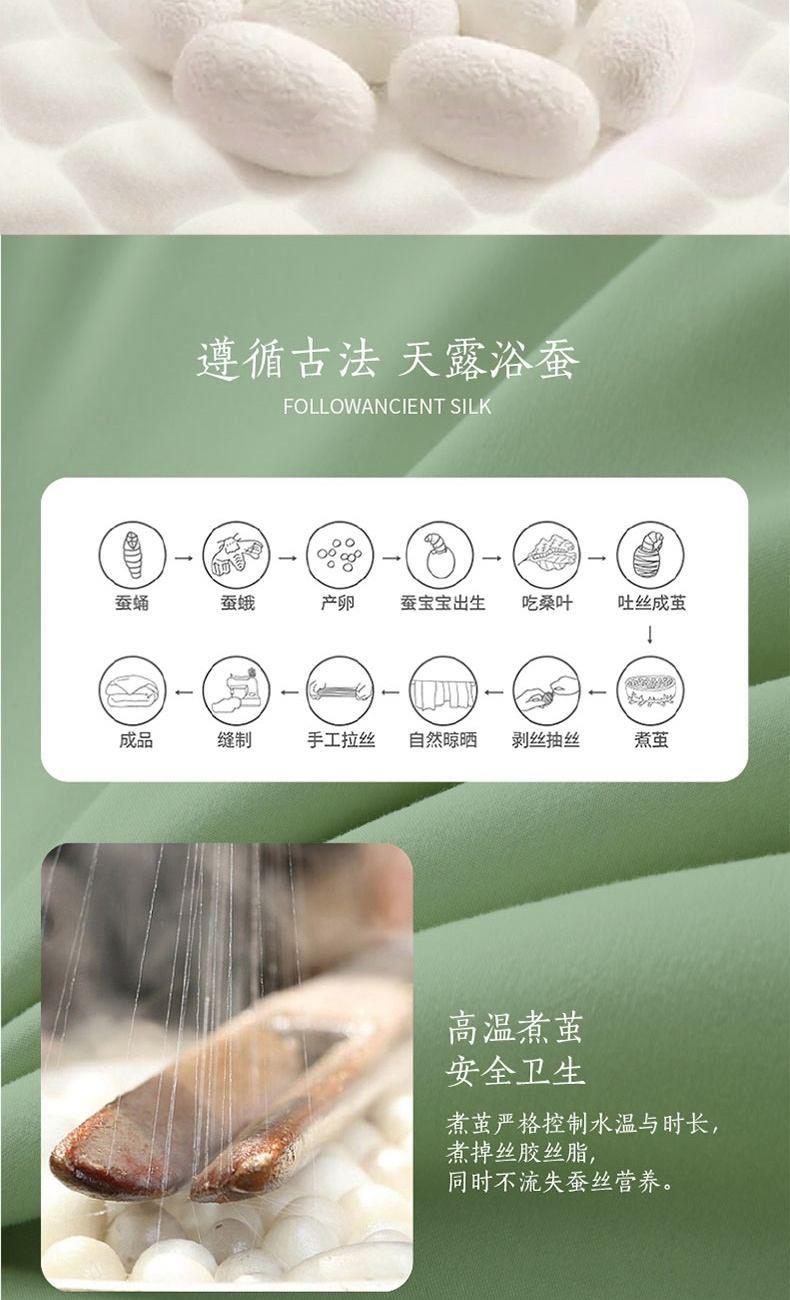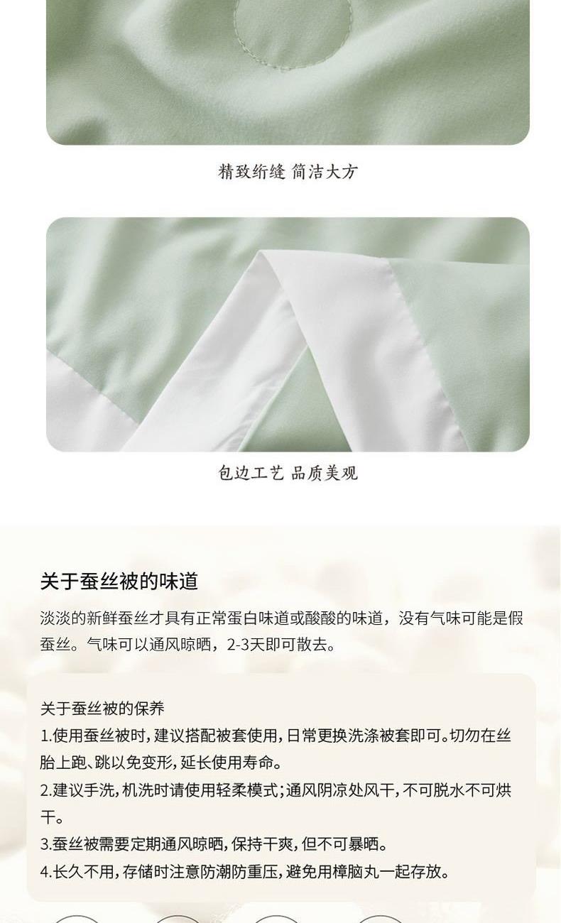 规格:200*230cm 面料:全涤提花面料 填充物: 柞蚕丝(中长丝绵) 填充:400g 1、选用优质提花面料:搭配经典素色小提花,让您从视觉上获得舒适体验,同时提花面料更贴合被套。 2、优质填充:采用0污蚕丝、有机丝源、天然健康;蚕丝内部中空,纤维重量更轻,无压迫感,透气性优良,柔滑质感带来舒适睡眠; 3、靠究细节:四边按筋设计使被芯不易变型,被面多个订点绗缝确保丝胎稳定性能。天然柔和,婴幼儿接触无刺激