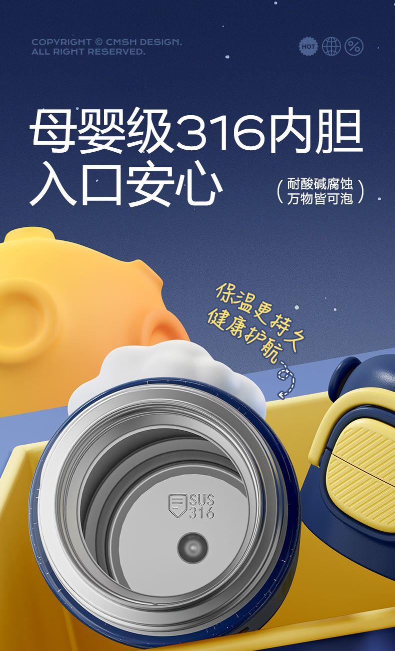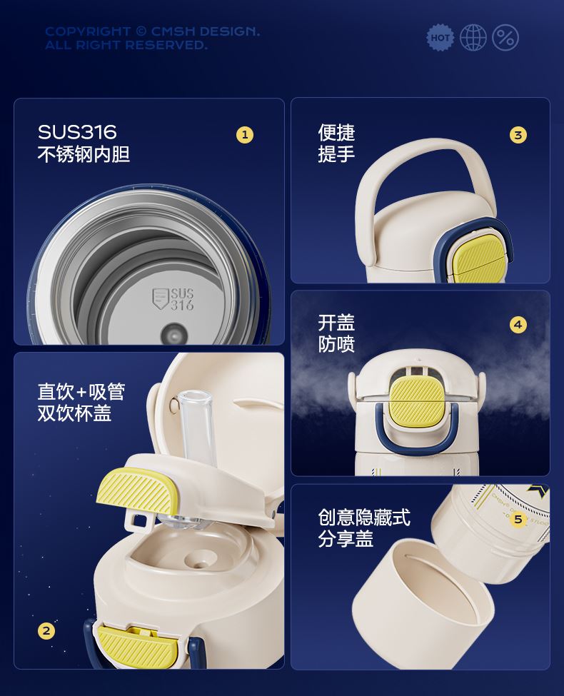 产品条码:6922958201084 内胆材质:316不锈钢 外壳材质:304不锈钢 杯盖材质:PP 密封圈材质:硅胶 产品容量:500ml 产品尺寸:75*85*228mm 产品净重:305g 产品颜色:蓝色,米色,粉色 装 箱 数:48pcs 包装方式:独立彩盒包装 箱 重 量:15.2kg 产品特点: 贵族学院风 梦想起航 316不锈钢 锁温更持久 一杯四饮设计 创新更时尚 灵活便携提手 外出无压力 纤细杯体造型 装包不卡顿