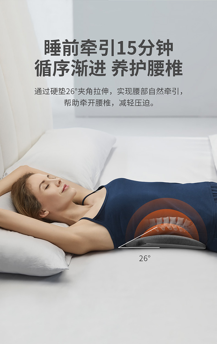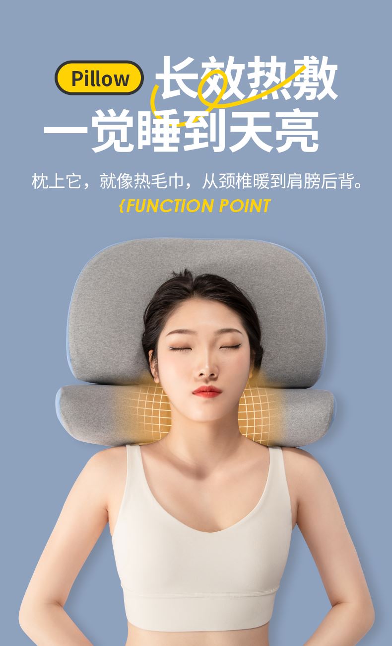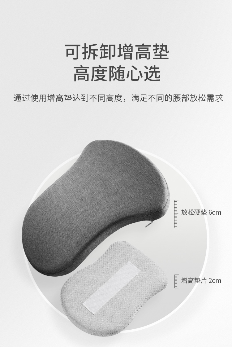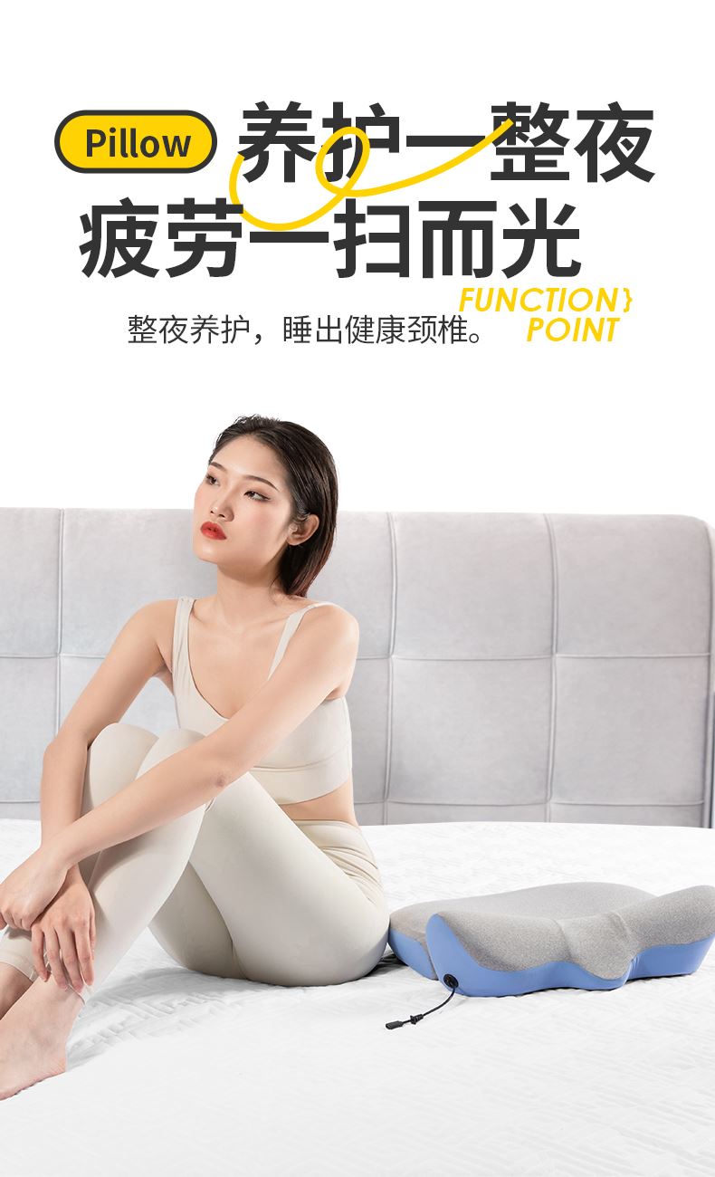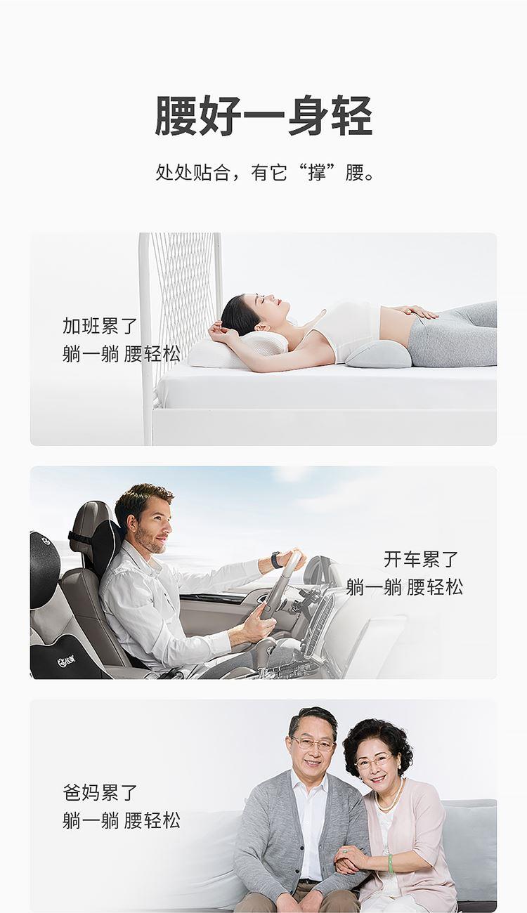 颈椎养护枕:①人体工学设计 软硬分区 ②凹型包裹 仰睡 侧睡都舒适 ③草本力量+艾绒加成 小白鲸腰垫:①三档智能温控, 暖波护理腰部, 放松僵硬肌肉, 整夜养护软垫; ②慢回弹记忆棉, 偏软, 躺睡不硌腰; ③贴合腰椎弧度, 填补腰间空隙