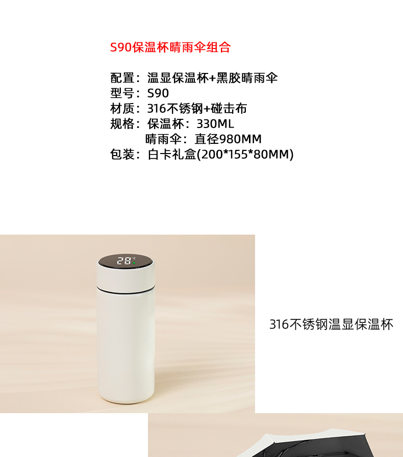 配置:温显保温杯+黑胶晴雨伞 型号:S90 材质:316不锈钢+碰击布 规格:保温杯:330ml 晴雨伞:直径980mm 包装:白卡礼盒(200*155*80mm)