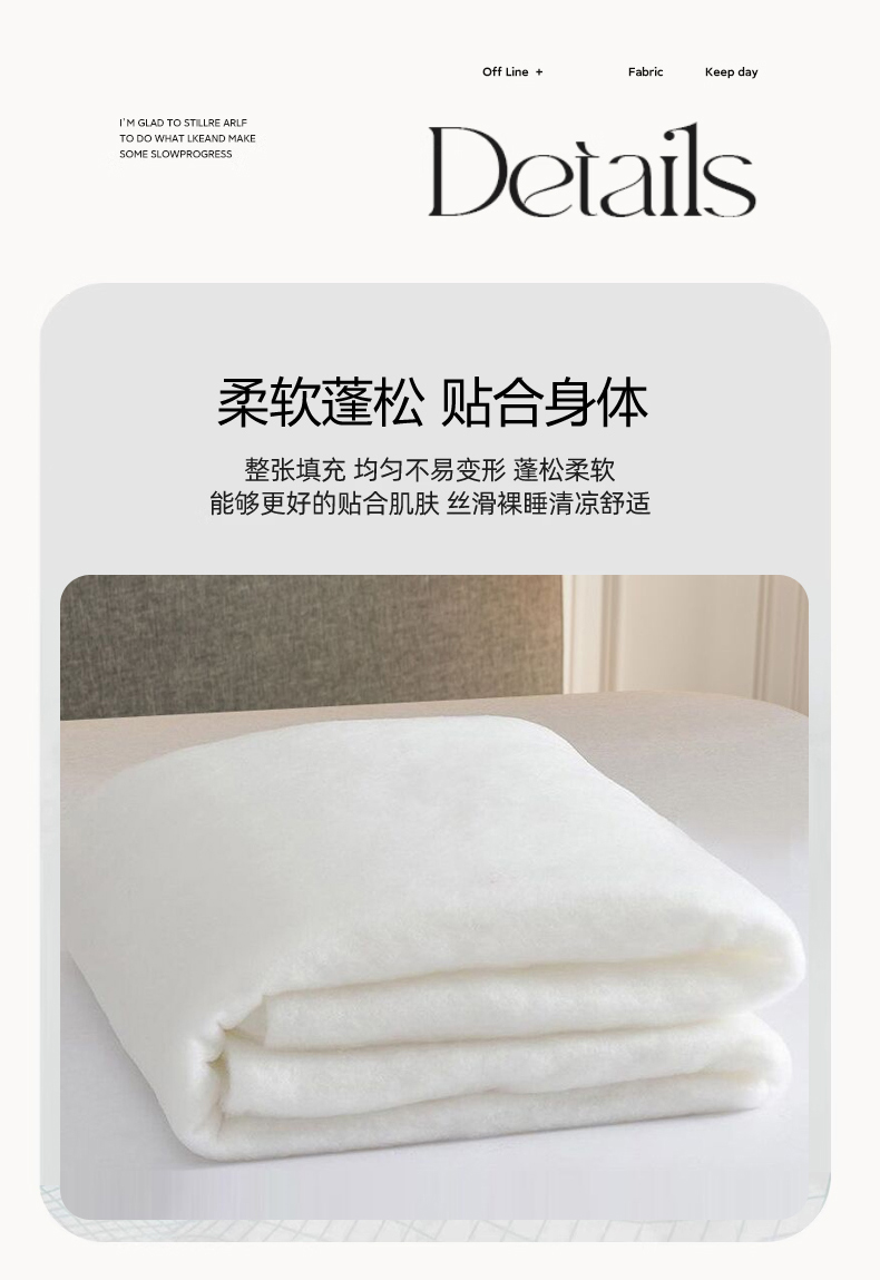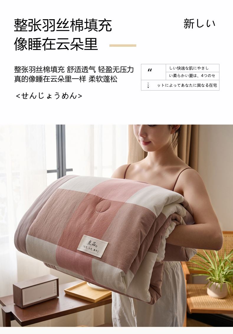 面料:水洗棉(聚酯纤维) 规格:200cm*230cm 填充:聚酯纤维 包装:礼盒 无印风水洗棉面料,质感柔软,手感细腻,亲肤无刺激,洁净度高。填充采用整张纤维填充,吸湿透气,保暖舒适,呵护美好睡眠。