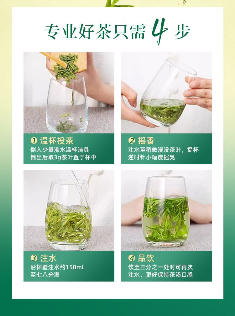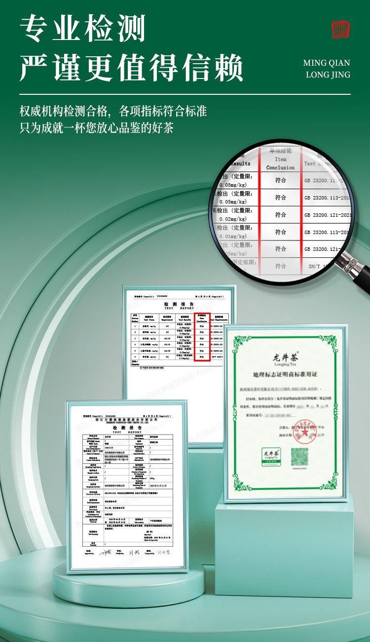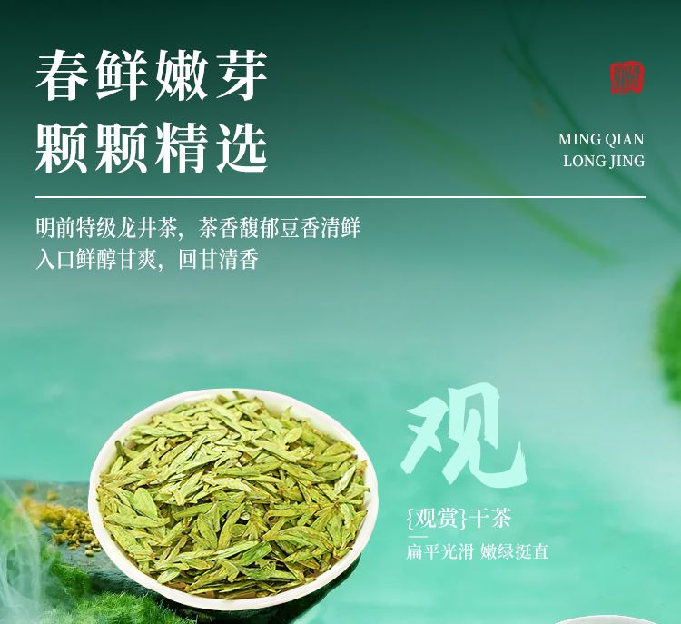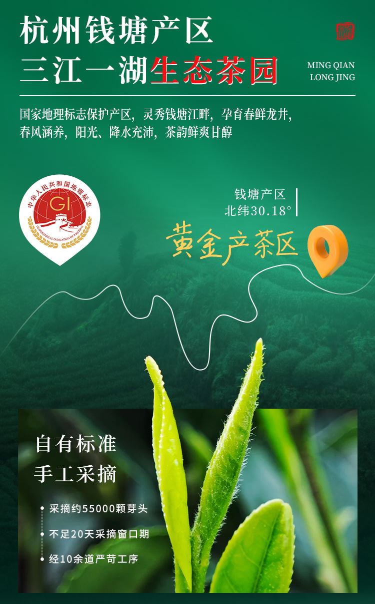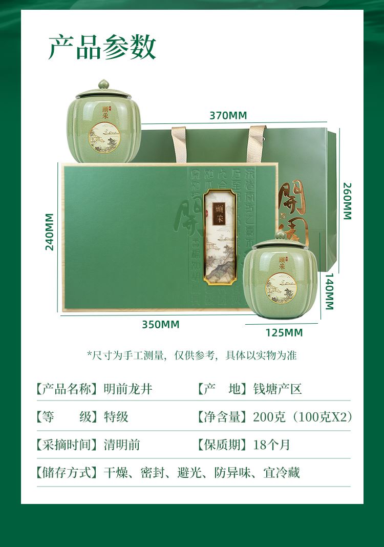 【等级】特级 【采摘时间】清明前 【产 地】钱塘产区 【净含量】200克(100克X2) 【保质期】18个月 【储存方式】干燥、密封、避光、防异味、宜冷藏