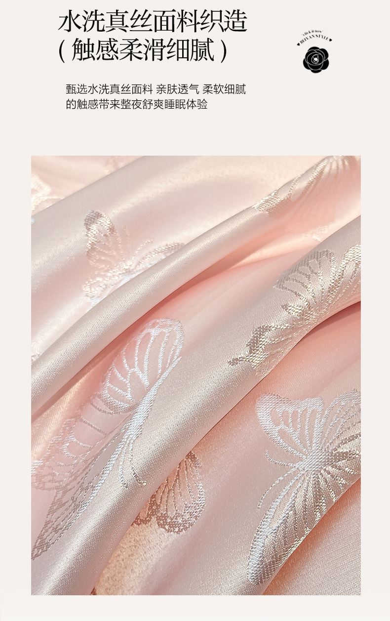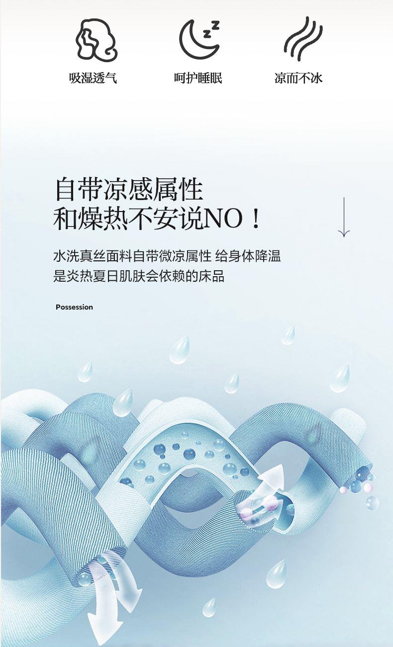 A类婴幼儿面料 顺滑柔软,水洗真丝像丝绸一样爽滑细腻, 整张羽丝绒棉填充,贴身使用,无需套被套,直接贴身使用,机洗手洗均可,活色印染,久洗如新。定位绗缝工艺,宽包边固定填充内芯不移位,洗后不结团,吸湿透气性。时尚提花&精美刺绣 增添床品的层次感,遇见高颜值起居室。