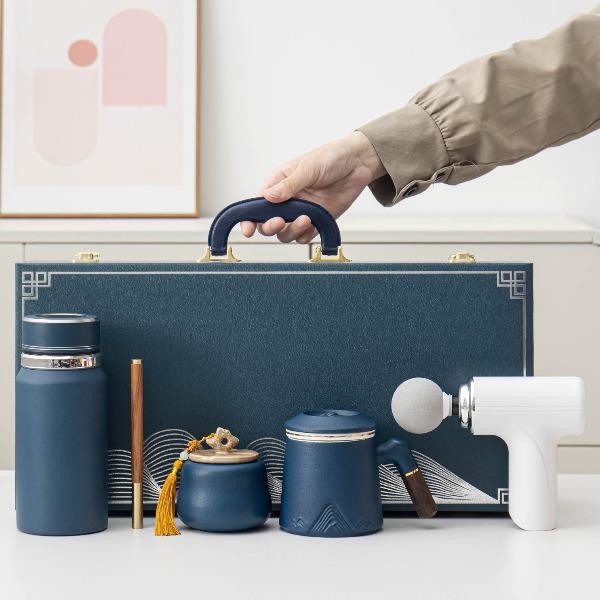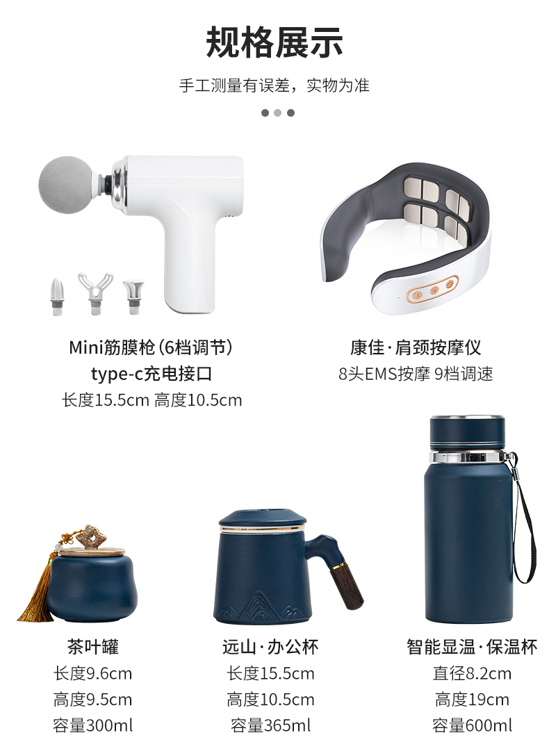 公杯:16*10厘米 茶叶罐:8.2*8厘米 礼盒 :48*12*23厘米 办公杯 茶叶罐 保温杯 筋膜枪 礼盒 配置齐全,商务实用,陶瓷高温烧制,无铅铬,送礼自用两相宜。