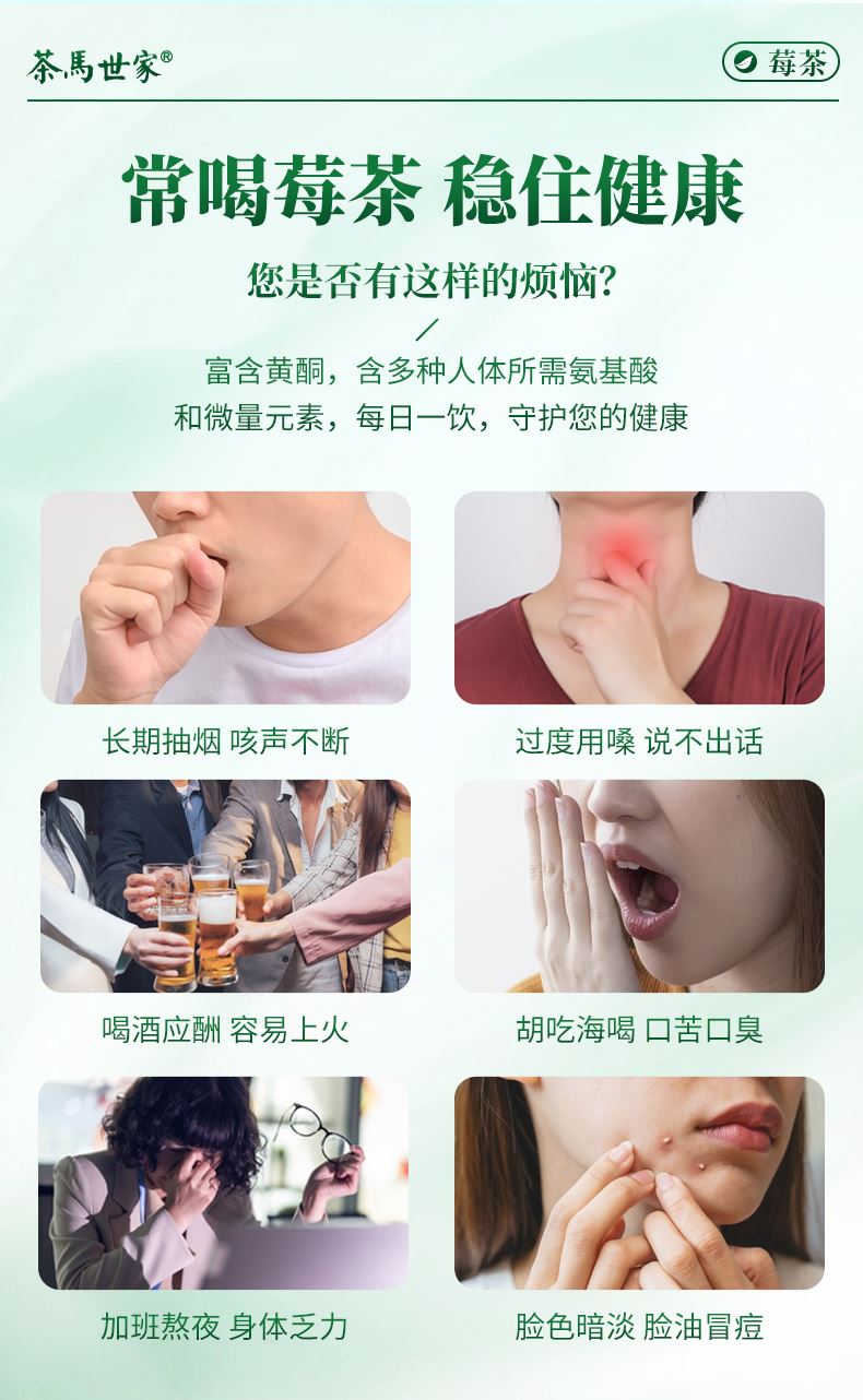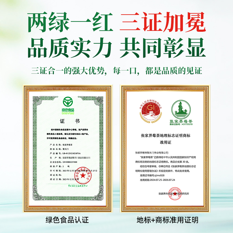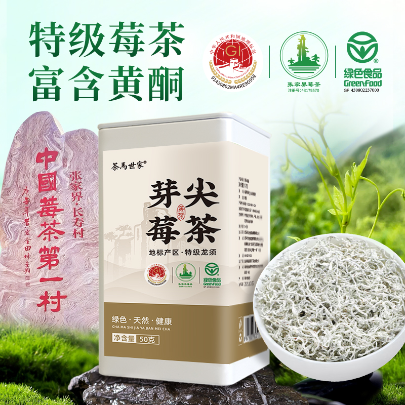 1.源自湖南张家界高山生态茶园,常年云雾缭绕,湿度适宜,地理标志保护产品 绿色食品认证 2.人工手采高山莓茶,特级3-5cm芽尖,优中选优,干茶白霜满披,手捻成粉 3.富含黄铜及多种氨基酸等微量元素,常喝护嗓子,用嗓多人群必备 4.入口清甜无涩,回甘快,喉间清爽舒适。无咖啡因,睡前也能喝,百搭可调味 5.铁罐装,双罐送手提袋,适合自饮,送礼