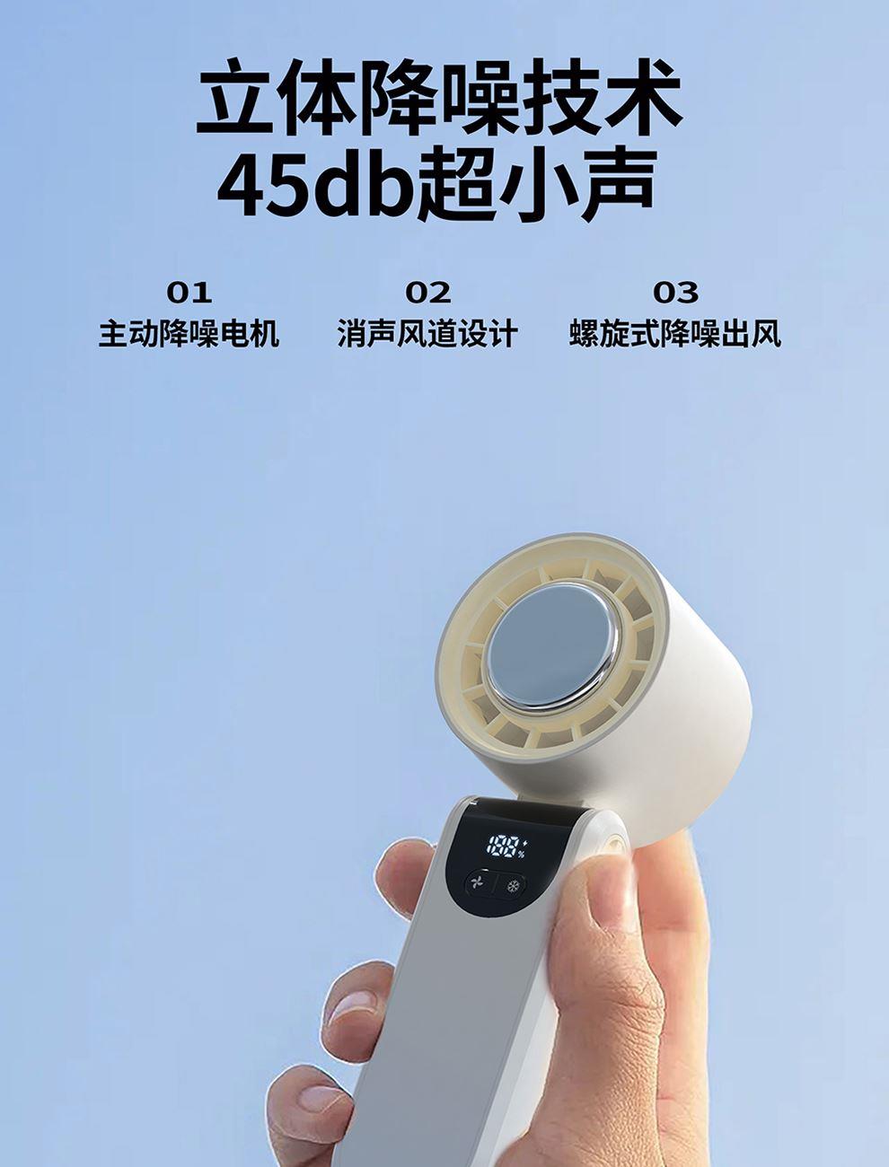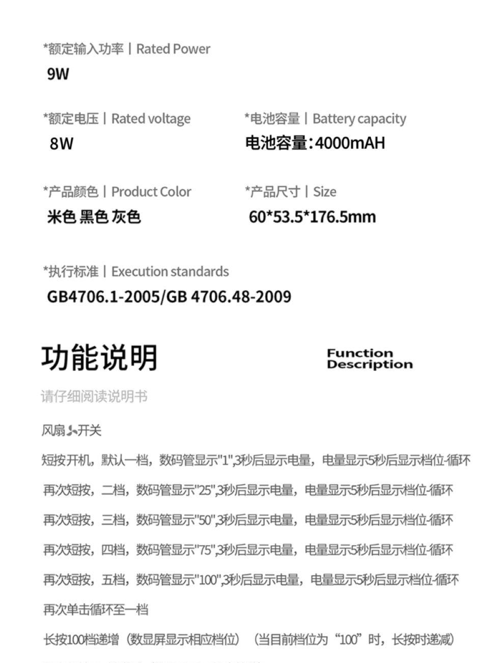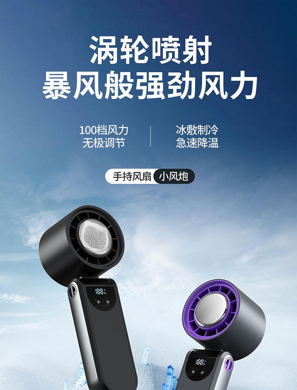 产品尺寸:17.7*6.1*5.4cm 产品材质:ABS+PP+金属+电子元件 输入电流:5V/1A 电池容量:4000mAH 功 率:8w 使用时间:1.5-12小时 产品重量:179g 特点: 冰敷制冷 急速降温 100档风力 无极调节 创新折叠 秒变桌面风扇 LED电量风速数显 一目了然